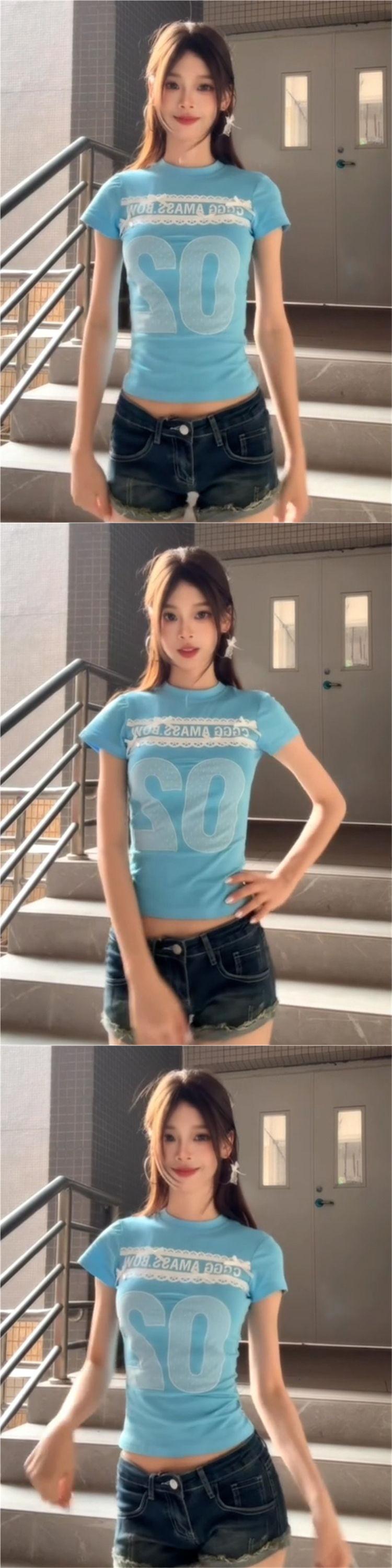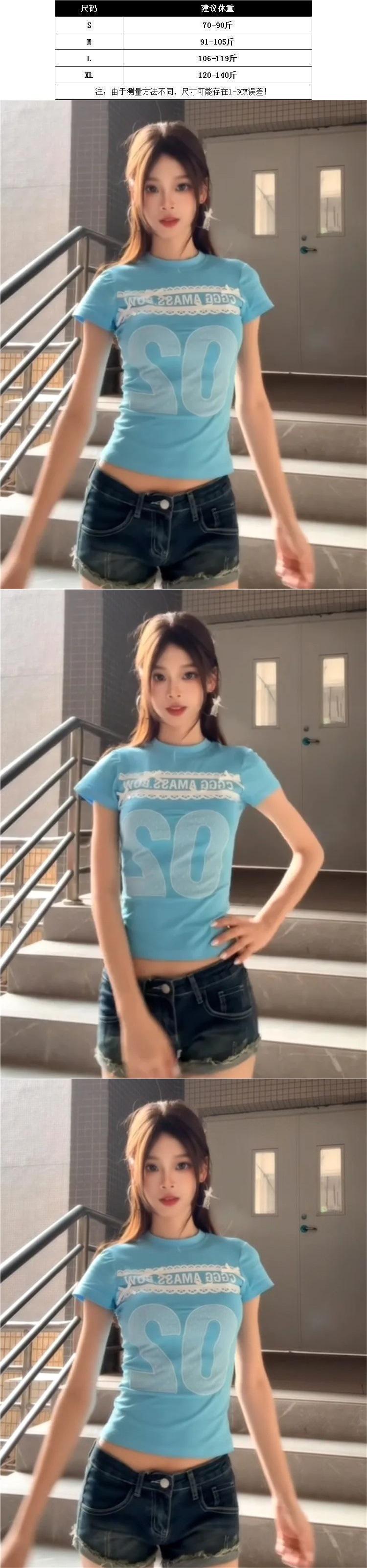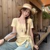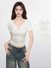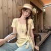 Dulce y Elegante Camiseta de Encaje con Lazo en el Hombro Derecho de Manga Corta para Mujer Verano Americano Sexy Camiseta Look Adelgazante Estilo Corto