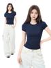 Camiseta Azul Marino Americano de Cuello Redondo y Manga Corta con Hombro Derecho Descubierto para Mujer Verano 2025 Nuevo Top Corto Ajustado