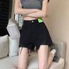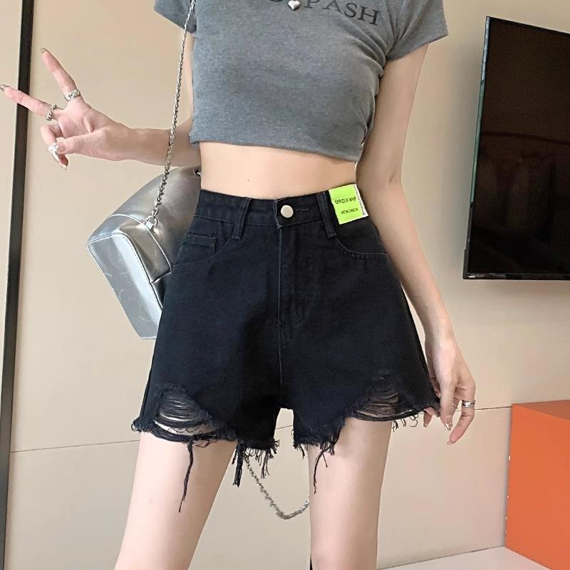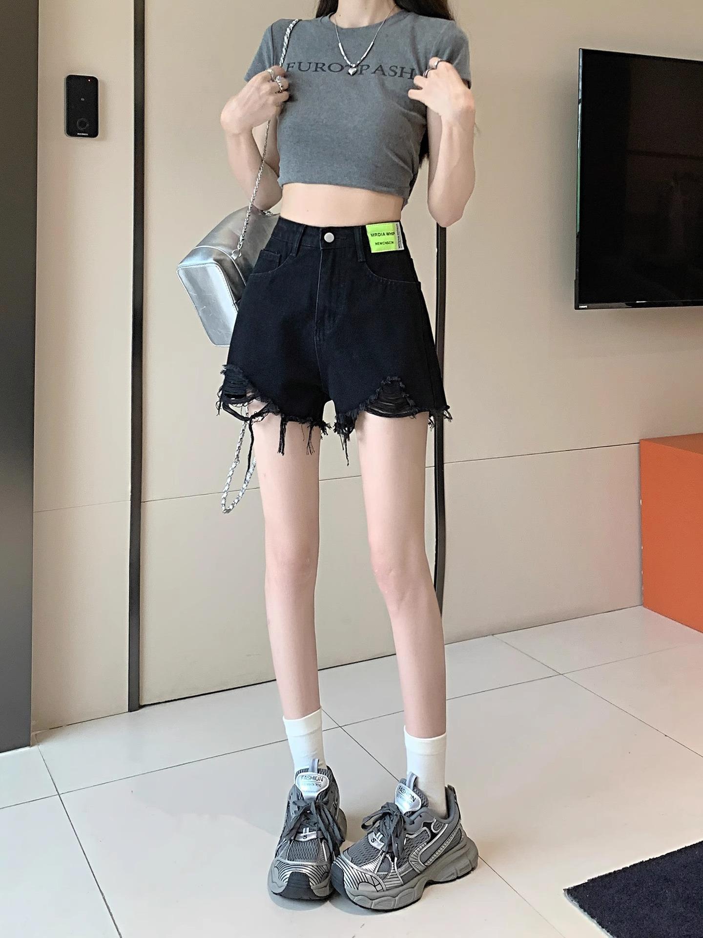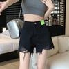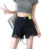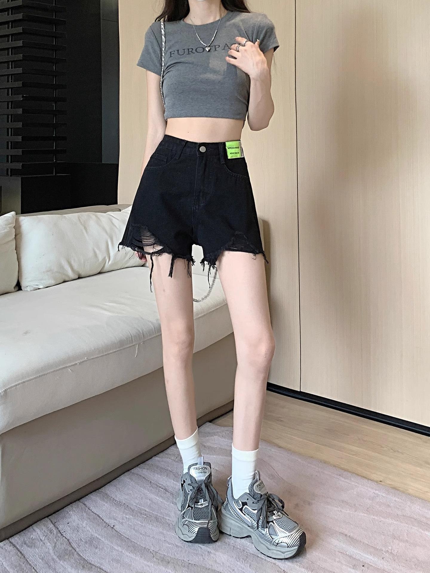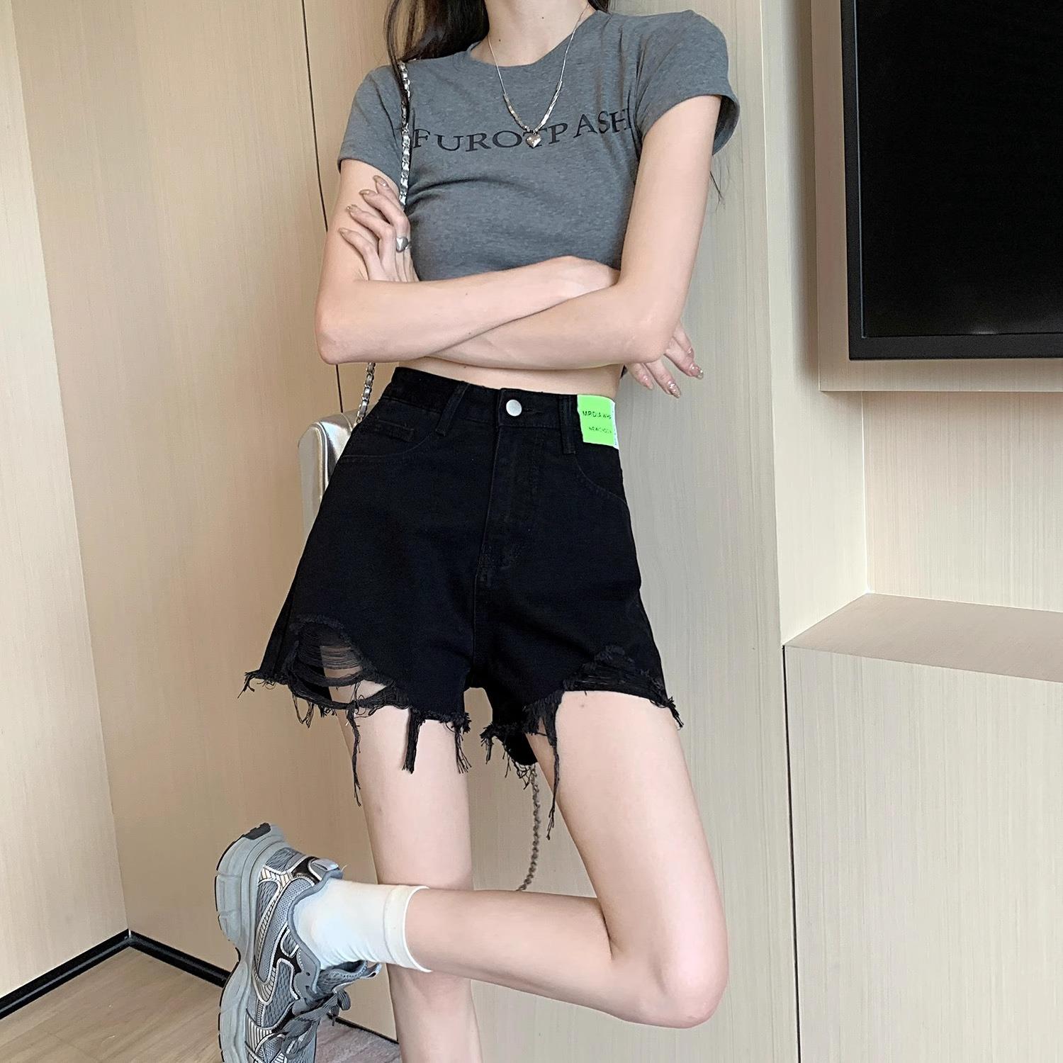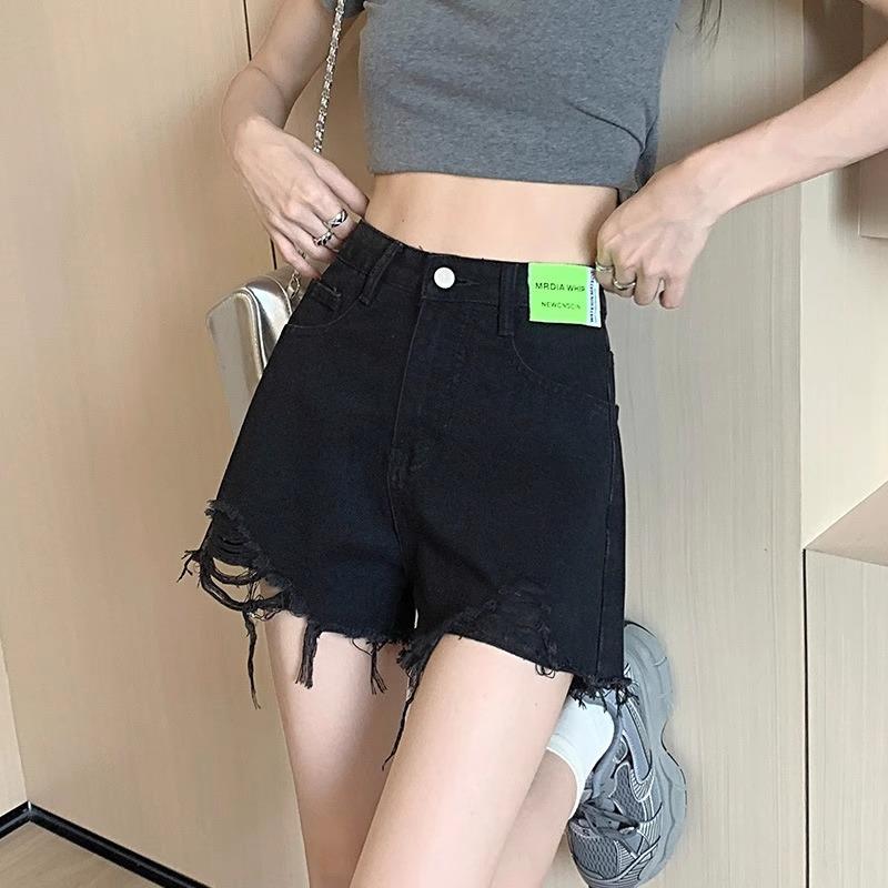 Shorts de Mezclilla Negros de Cintura Alta Americanos para Mujer Verano de Chica Caliente Nuevo Diseño Nicho Adelgazantes Desgastados Línea A Pantalones Cortos