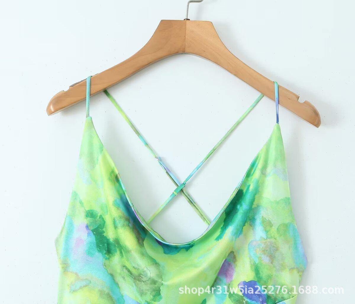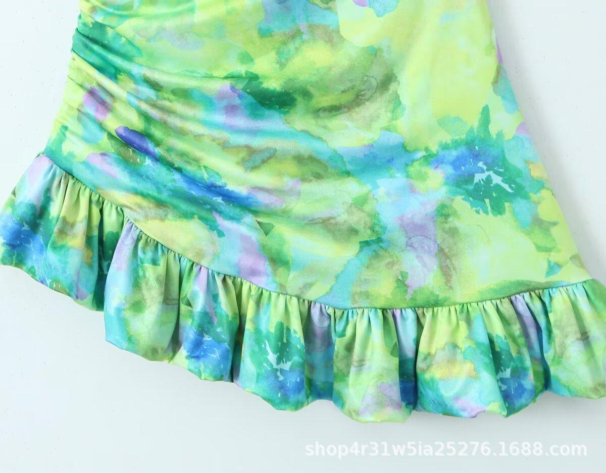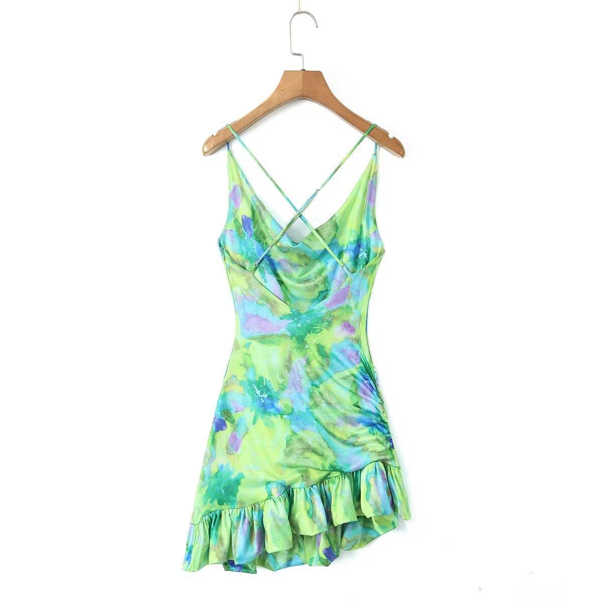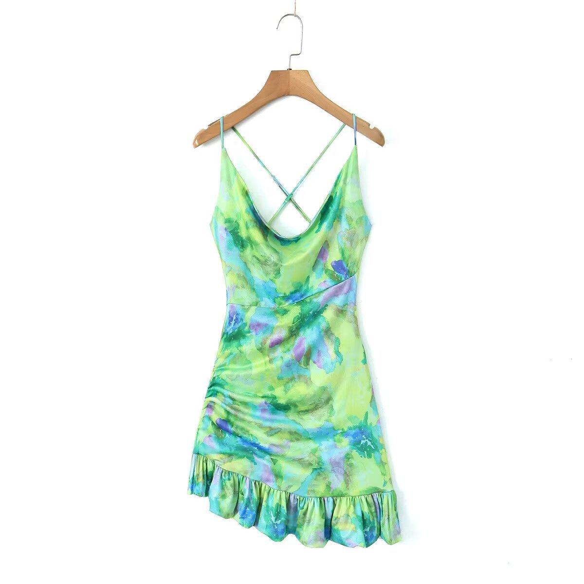 Europeo y Americano 2024 Nuevo Estilo de Verano Look Adelgazante y Versátil Francés de Alta Elasticidad Estampado Asimétrico Vestido de Tirantes Falda Corta