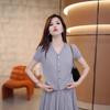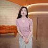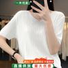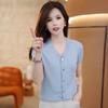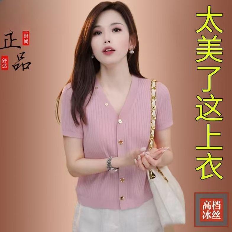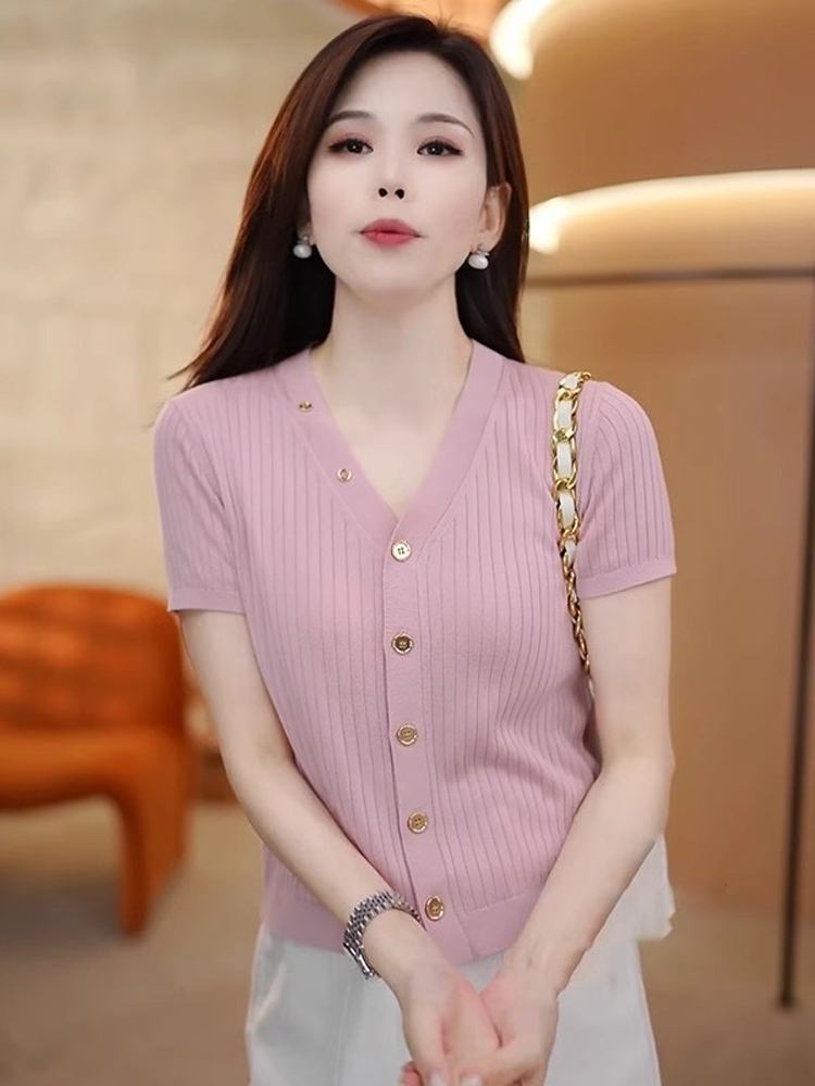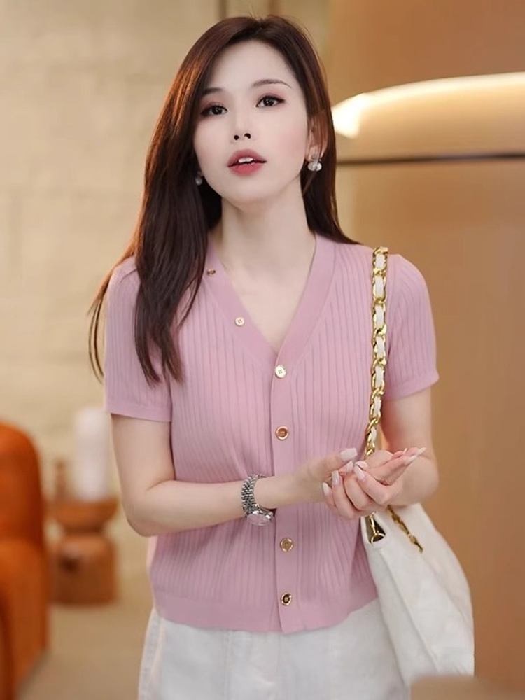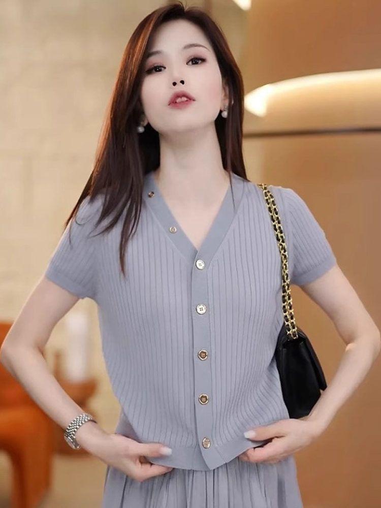 Cárdigan de Punto de Manga Corta para Mujer Verano Delgado Rayas Verticales Camiseta de Cuello en V para Cubrir la Carne Camisa Base Casual Top