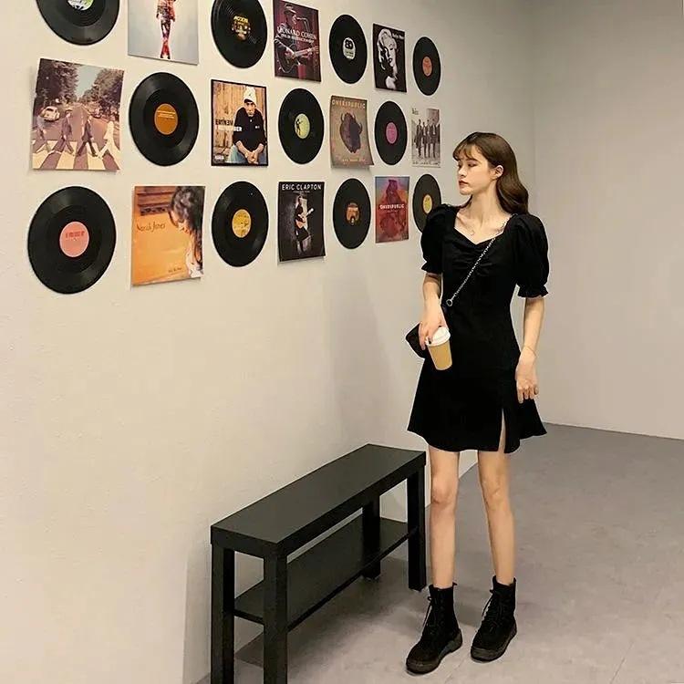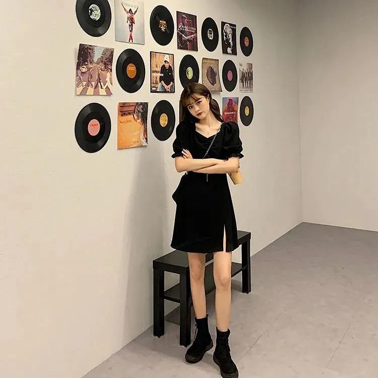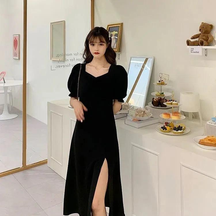 Vestido ajustado de talla grande para chica gordita con cuello cuadrado y abertura en la cintura, estilo francés Hepburn, color negro, con borde cruzado, falda acampanada
