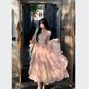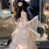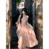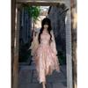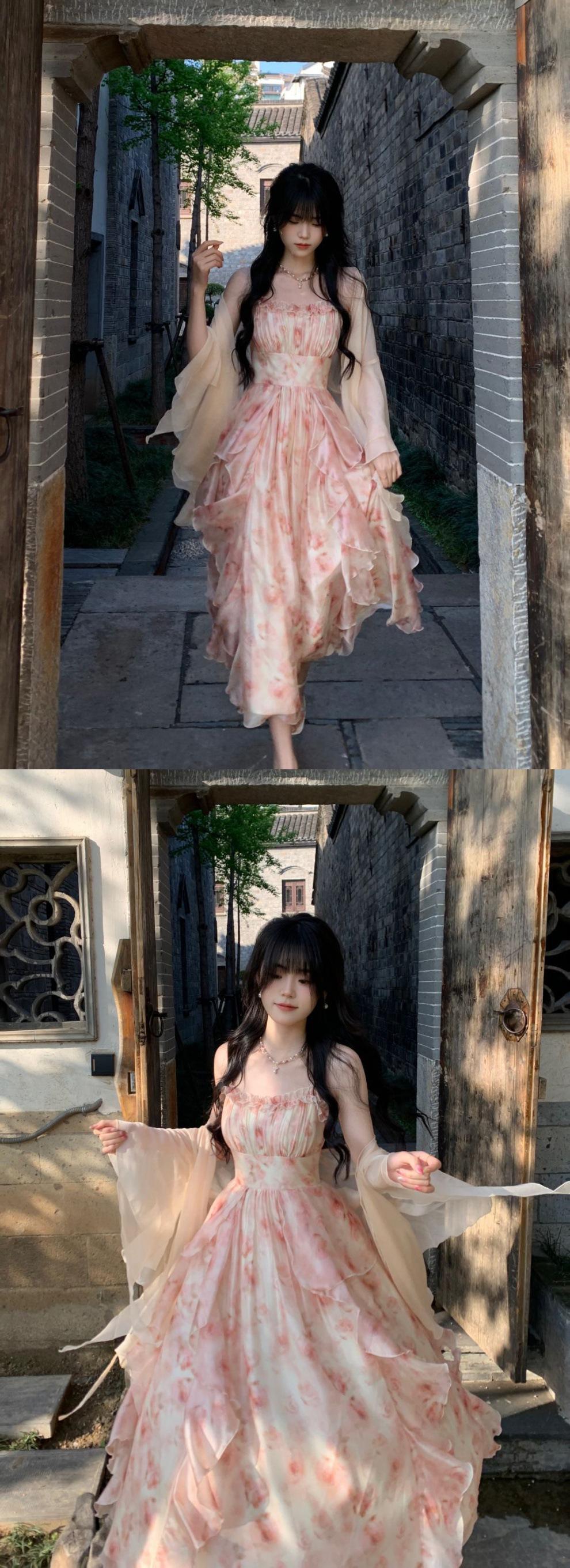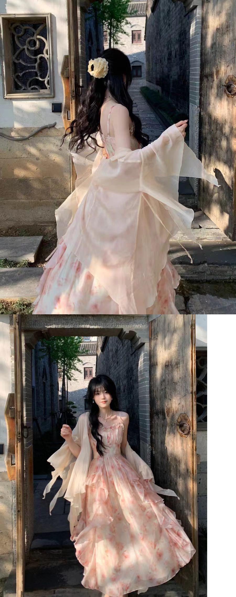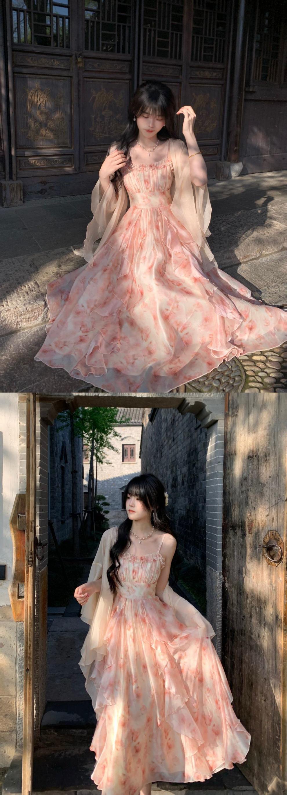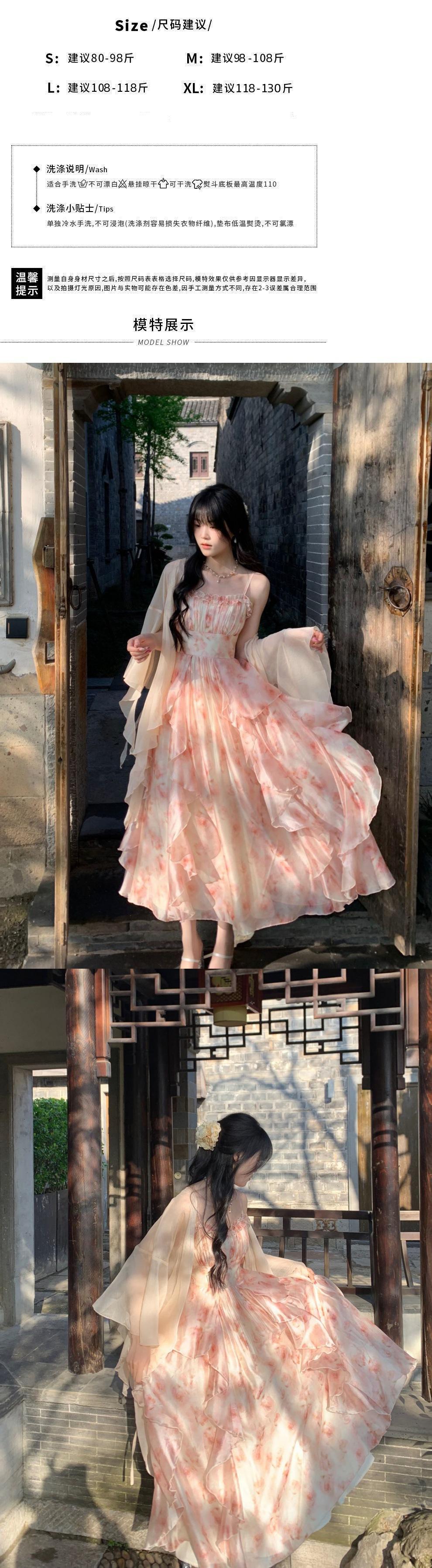 Elegante Vestido de Tirantes con Volantes y Estampado Degradado de Alta Resistencia para Mujer Verano + Set de Cárdigan de Hada