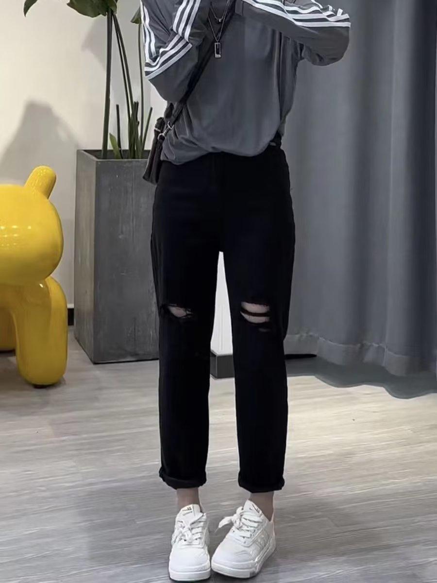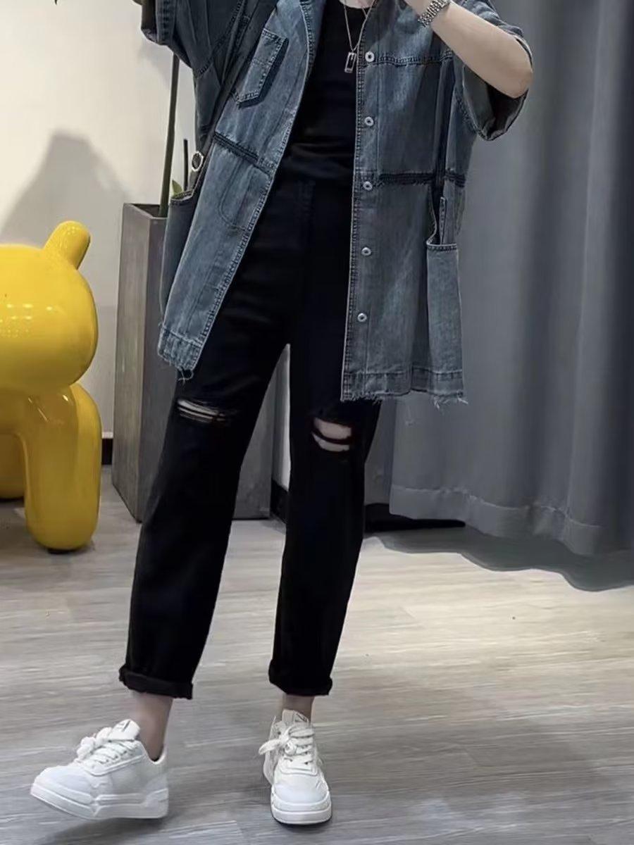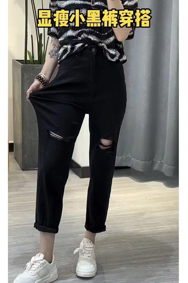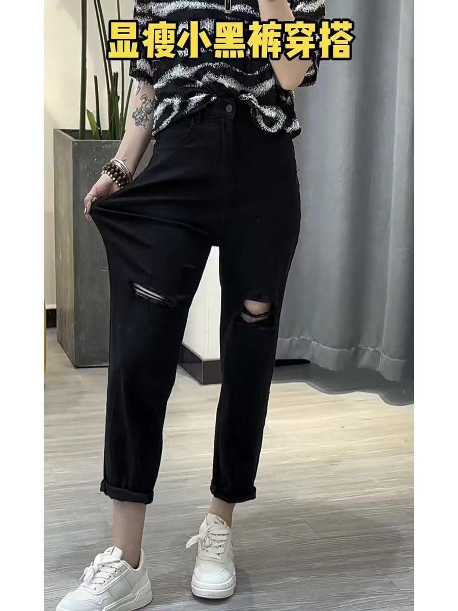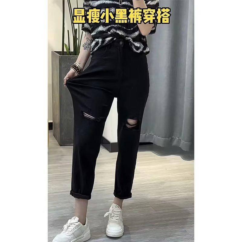 Talla grande Jeans Harlan Negros Rotos Verano para Mujer Delgados para chica gordita Cintura Alta Adelgazantes Recortados Rectos Pierna Ancha