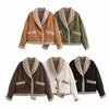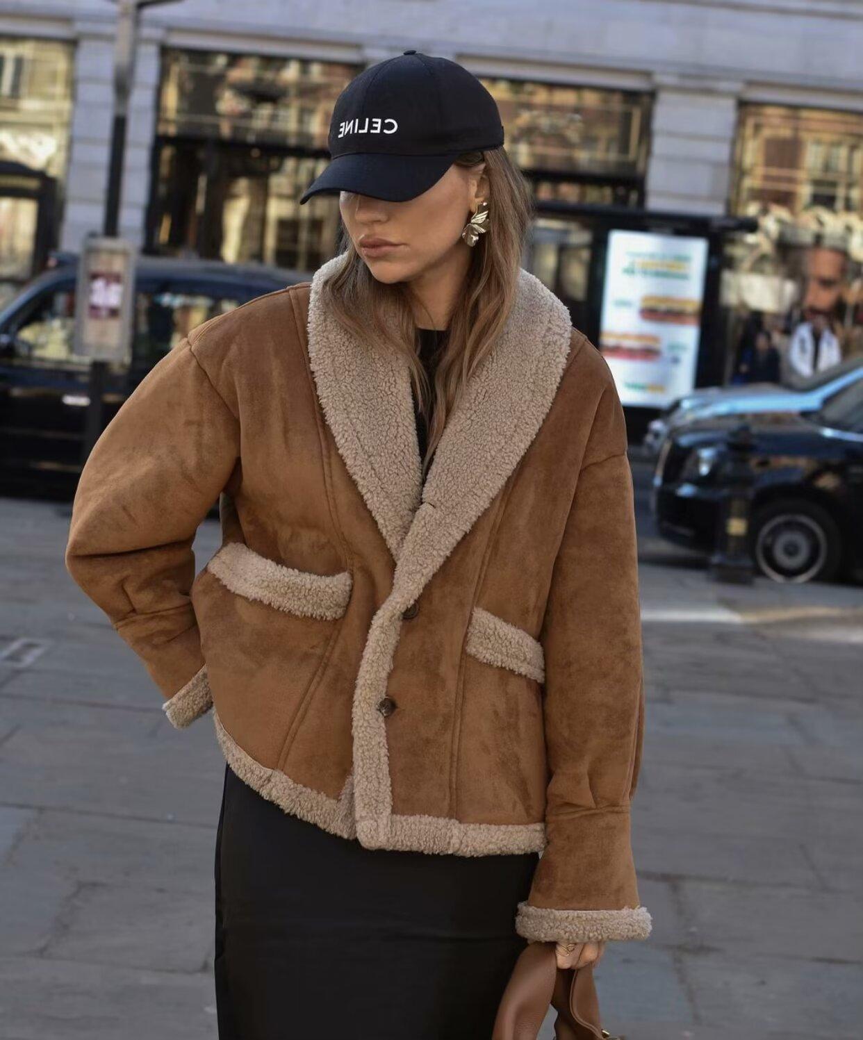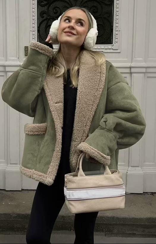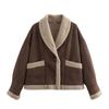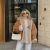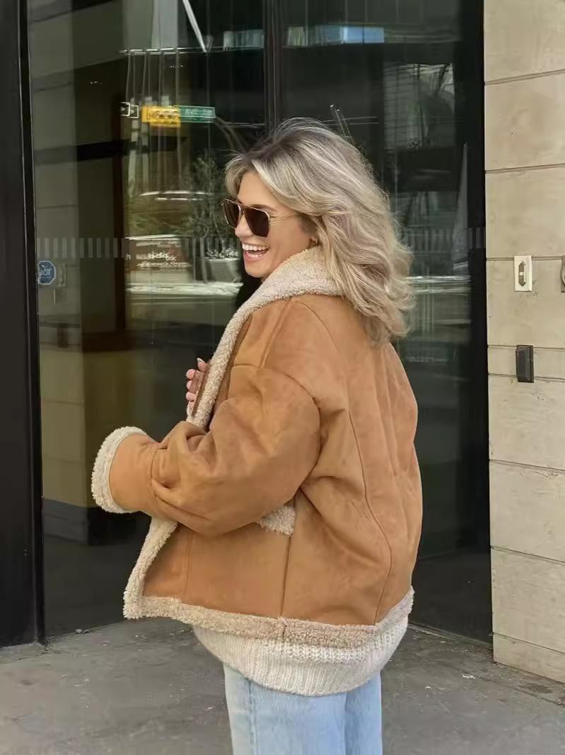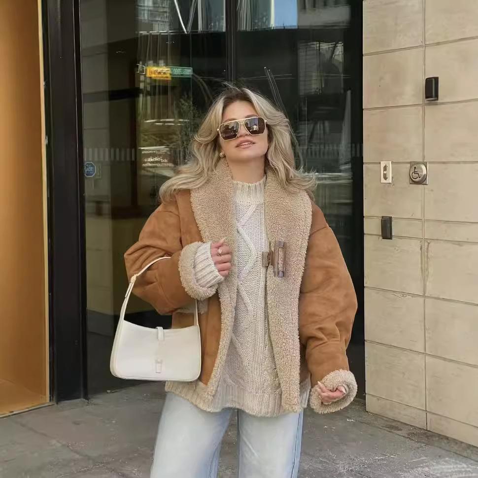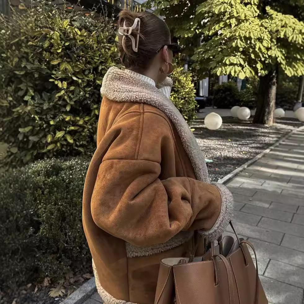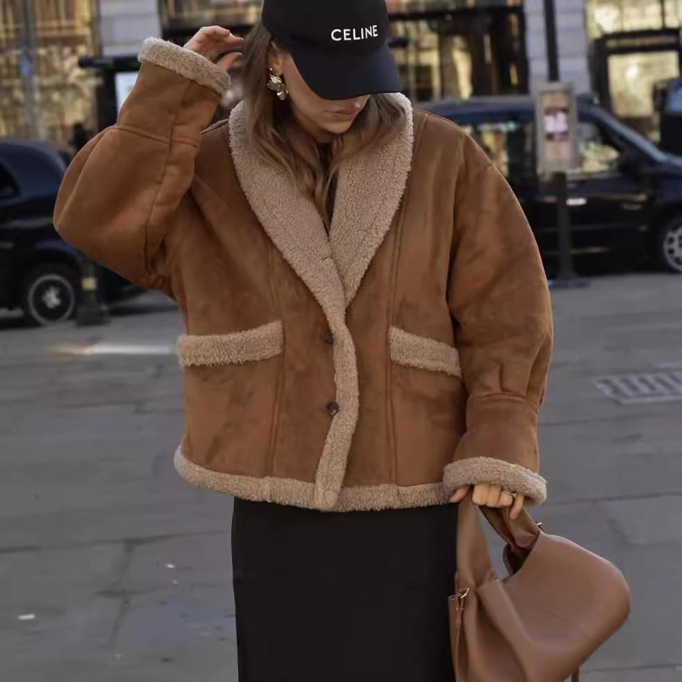 Chaqueta de Lana Retro para Mujer Nueva de Otoño e Invierno Europea y Americana Transfronteriza Solapa Suelta de Piel de Una Pieza