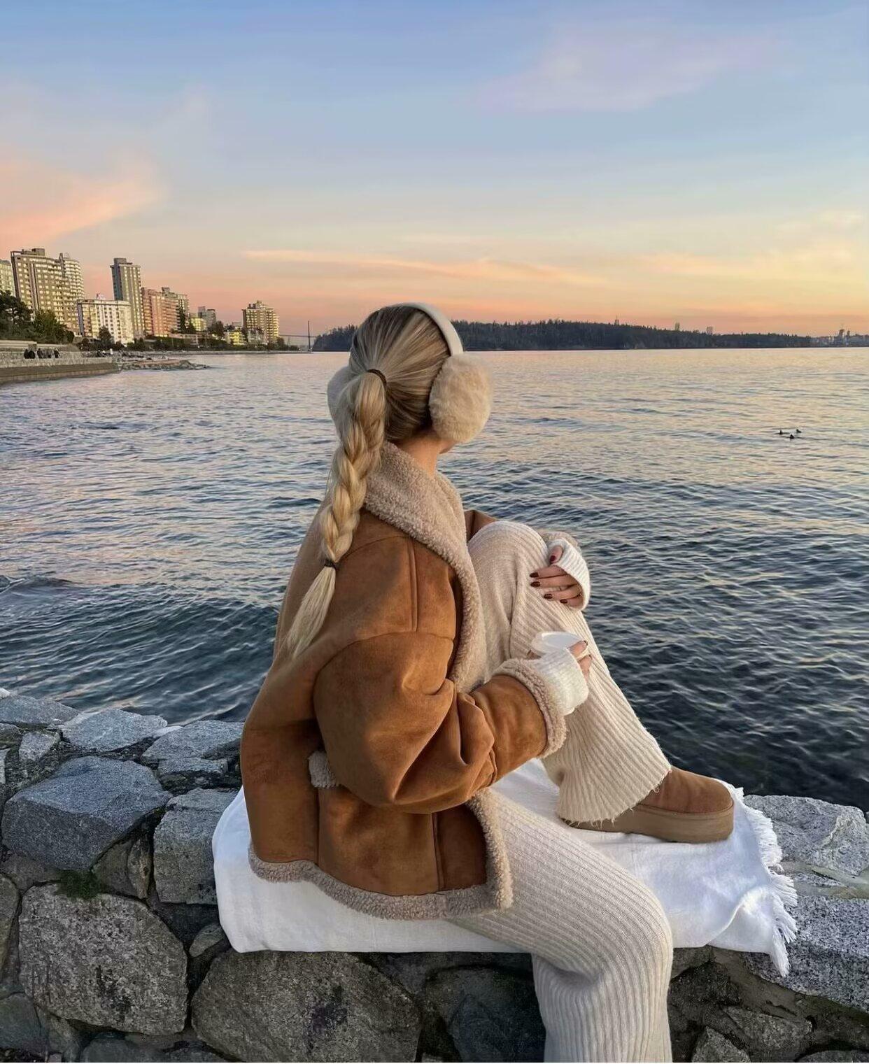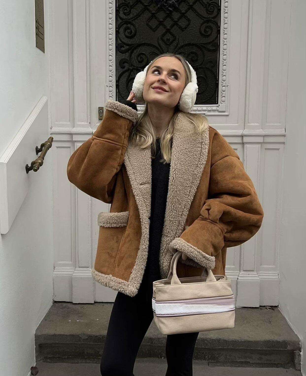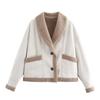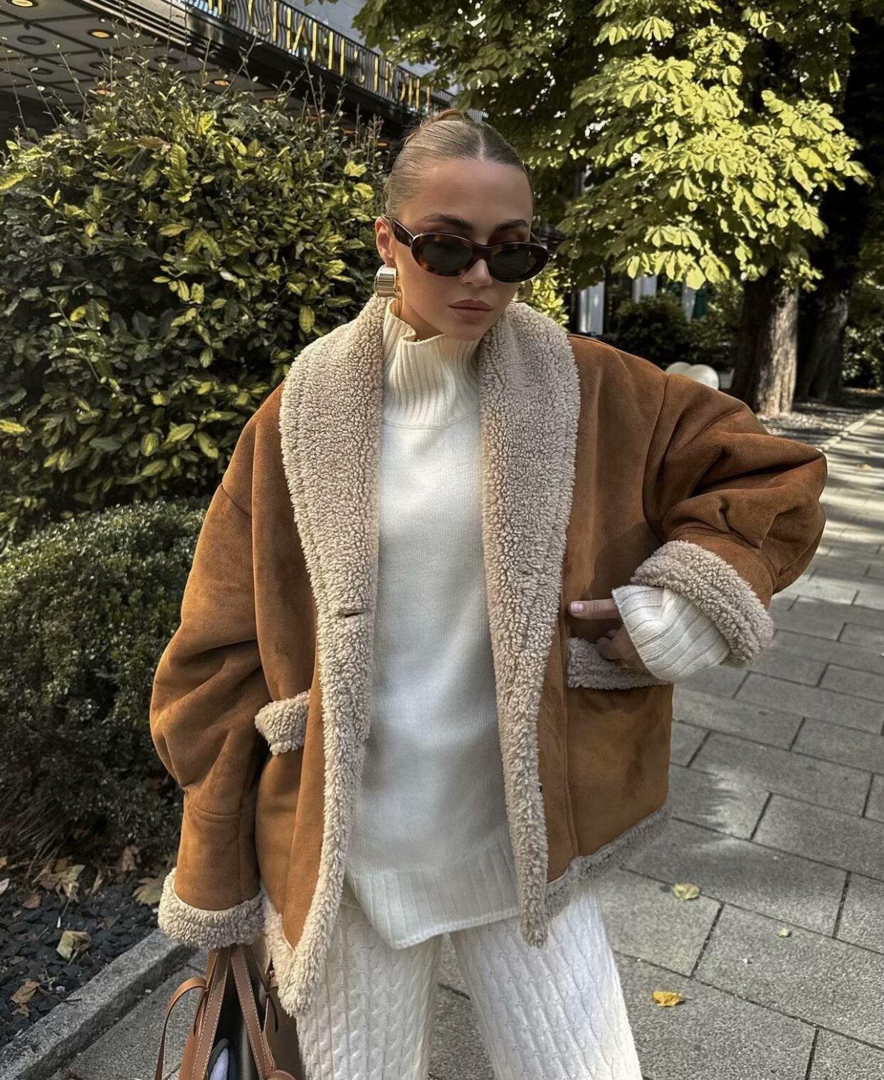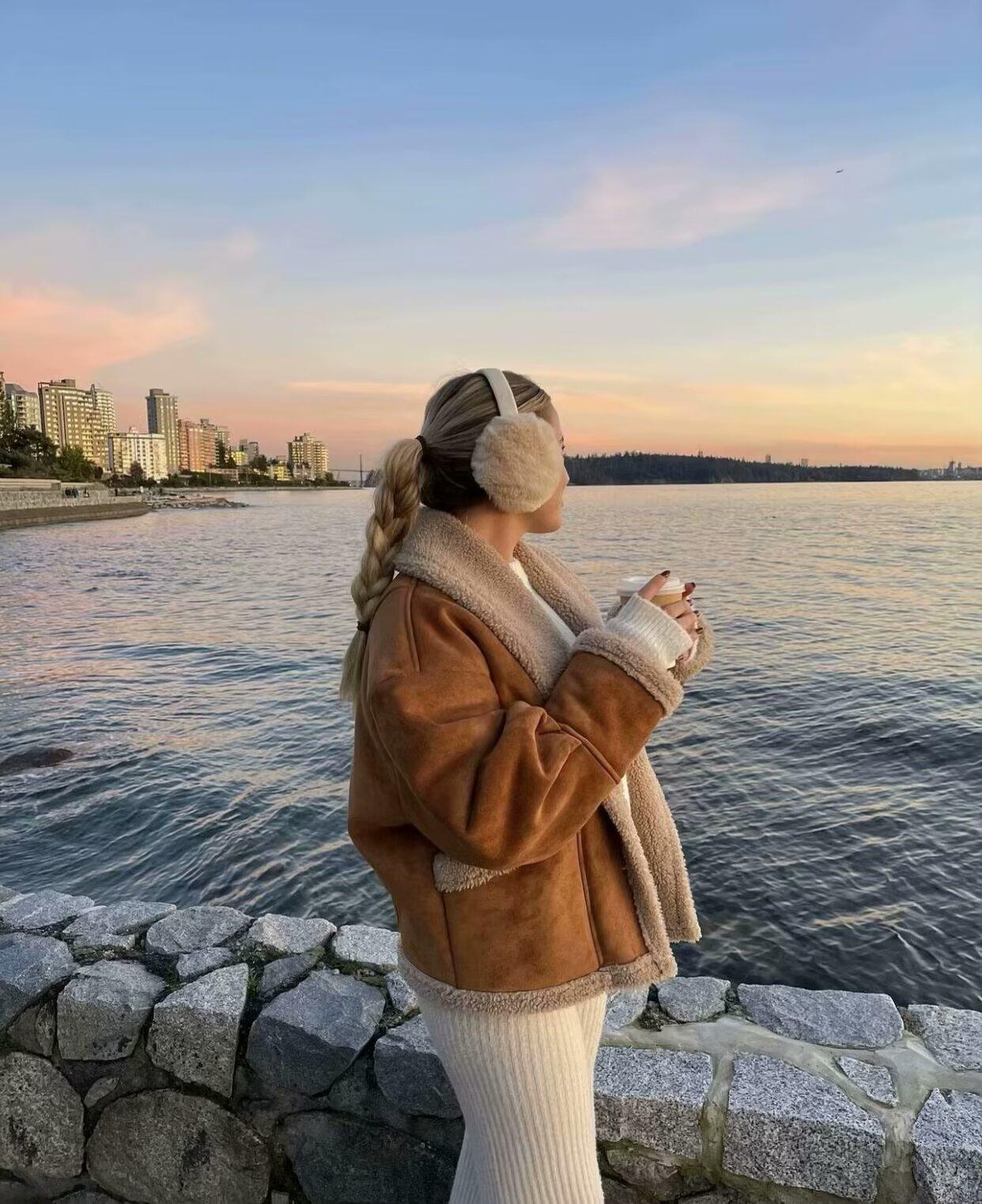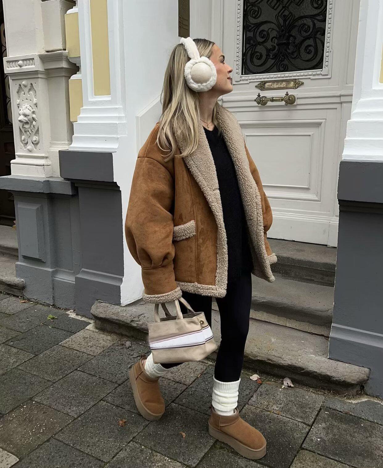 Chaqueta de Lana Retro para Mujer Nueva de Otoño e Invierno Europea y Americana Transfronteriza Solapa Suelta de Piel de Una Pieza
