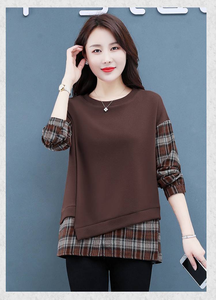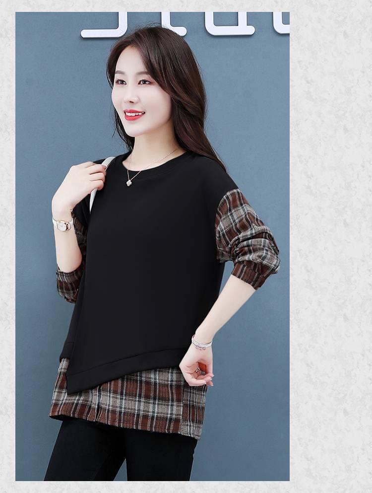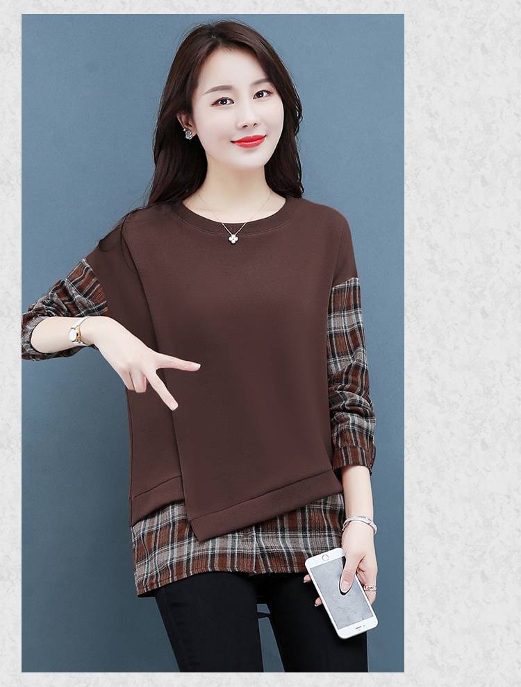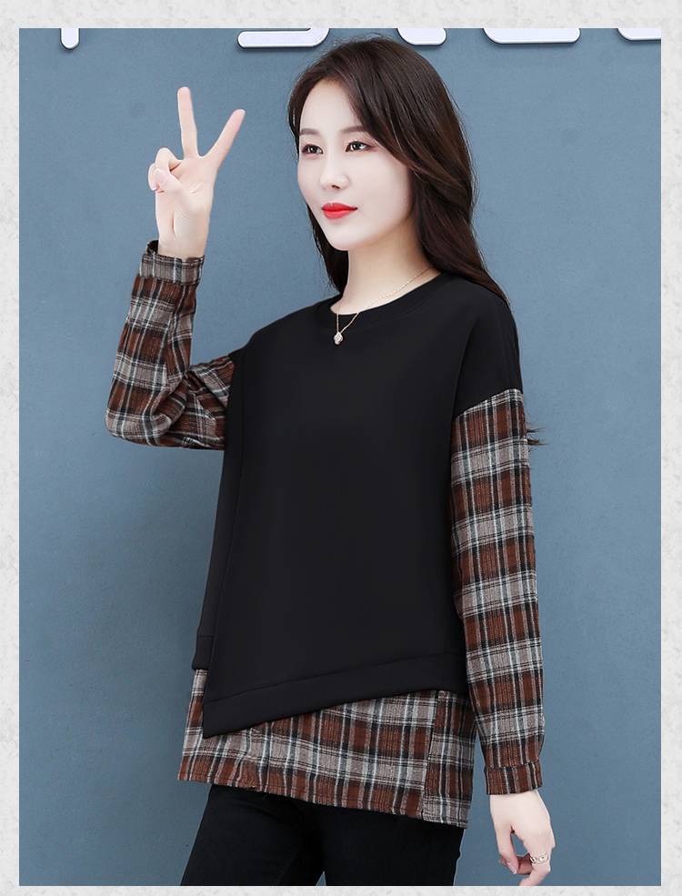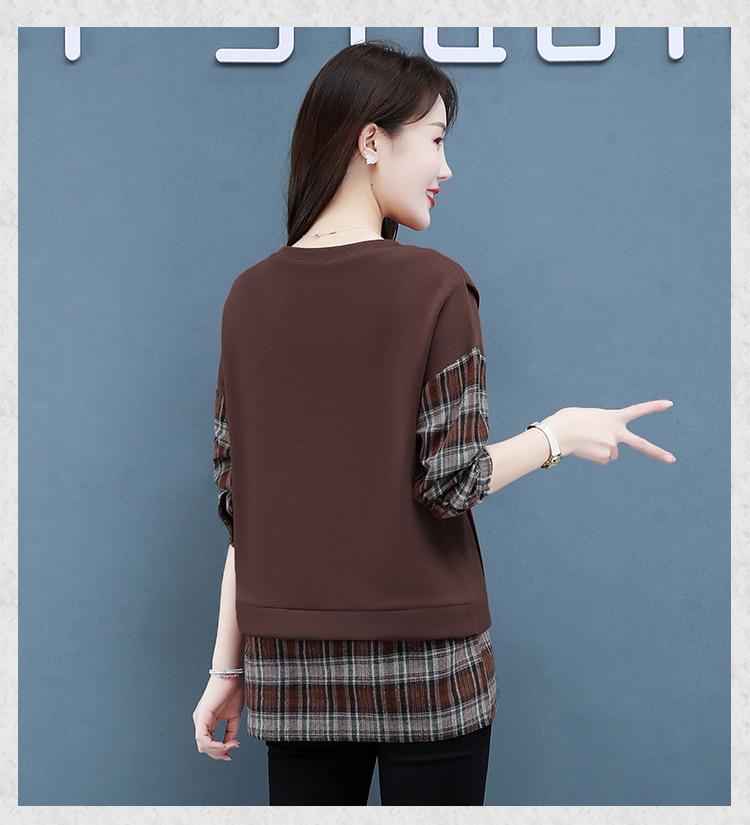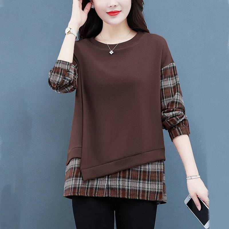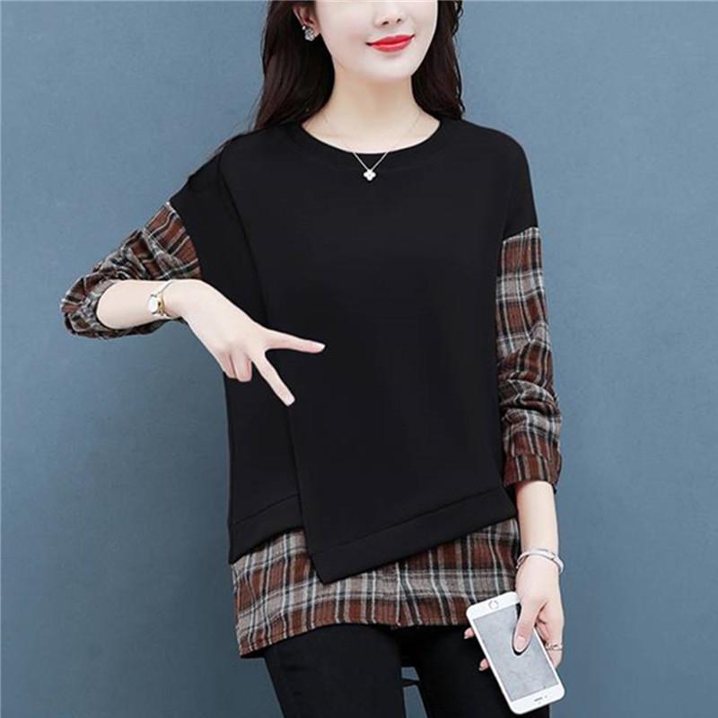 Sudadera súper popular de algodón con falso dos piezas para mujer, nueva para primavera y otoño, con costuras a cuadros en color contrastante, casual, holgada, para usar debajo, para mujer