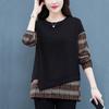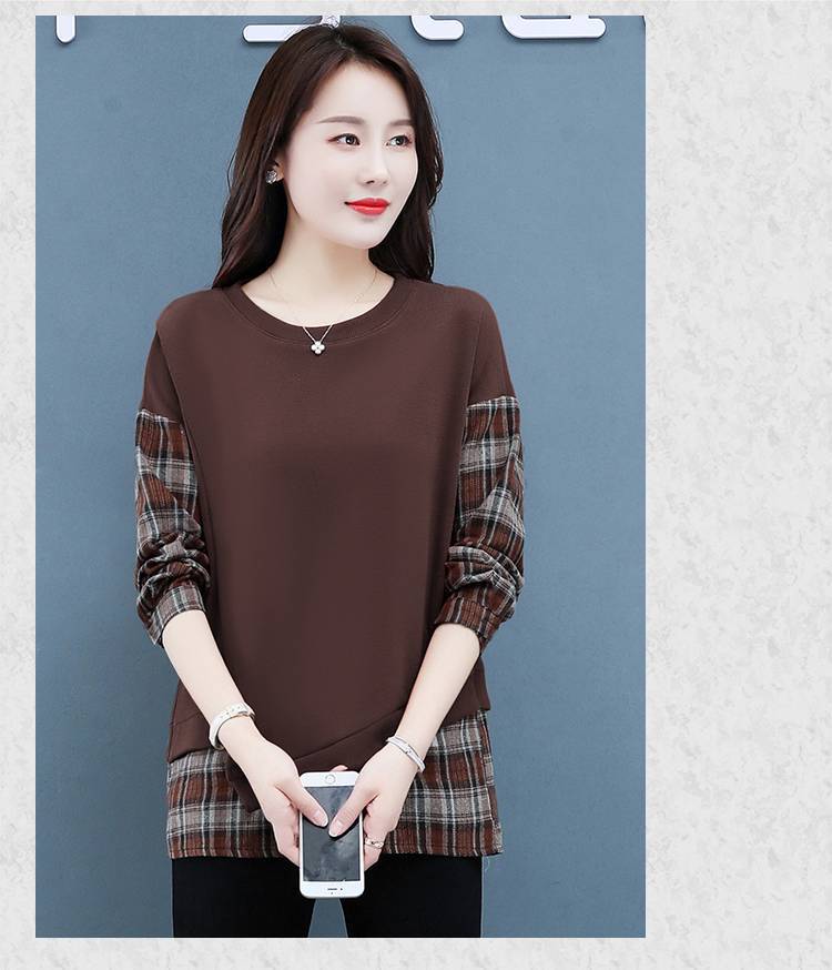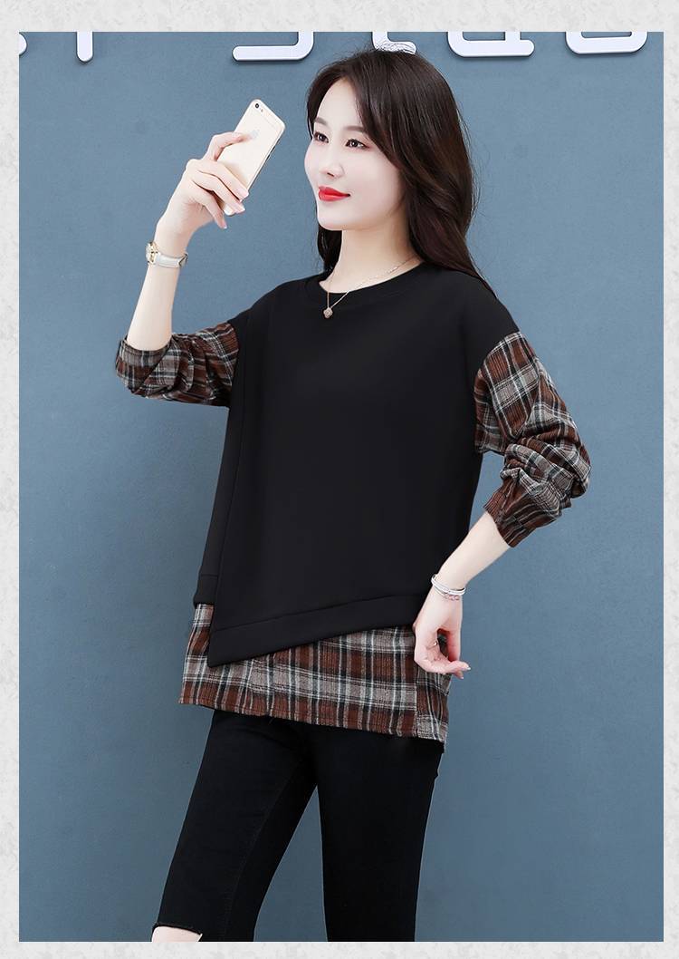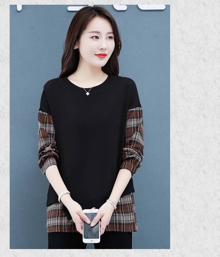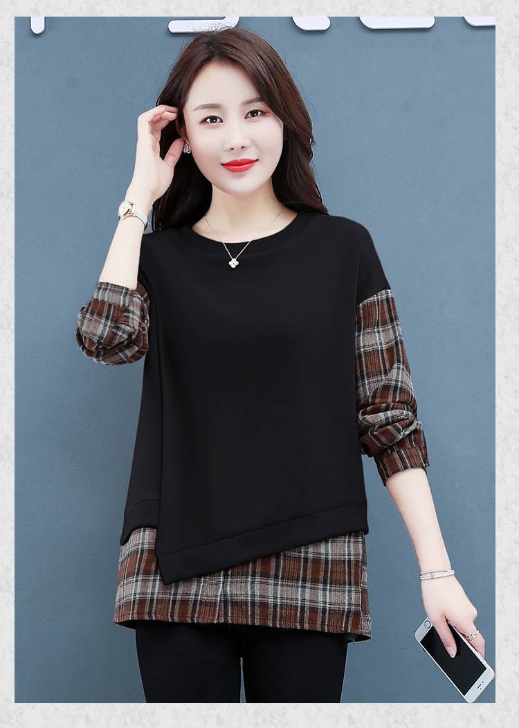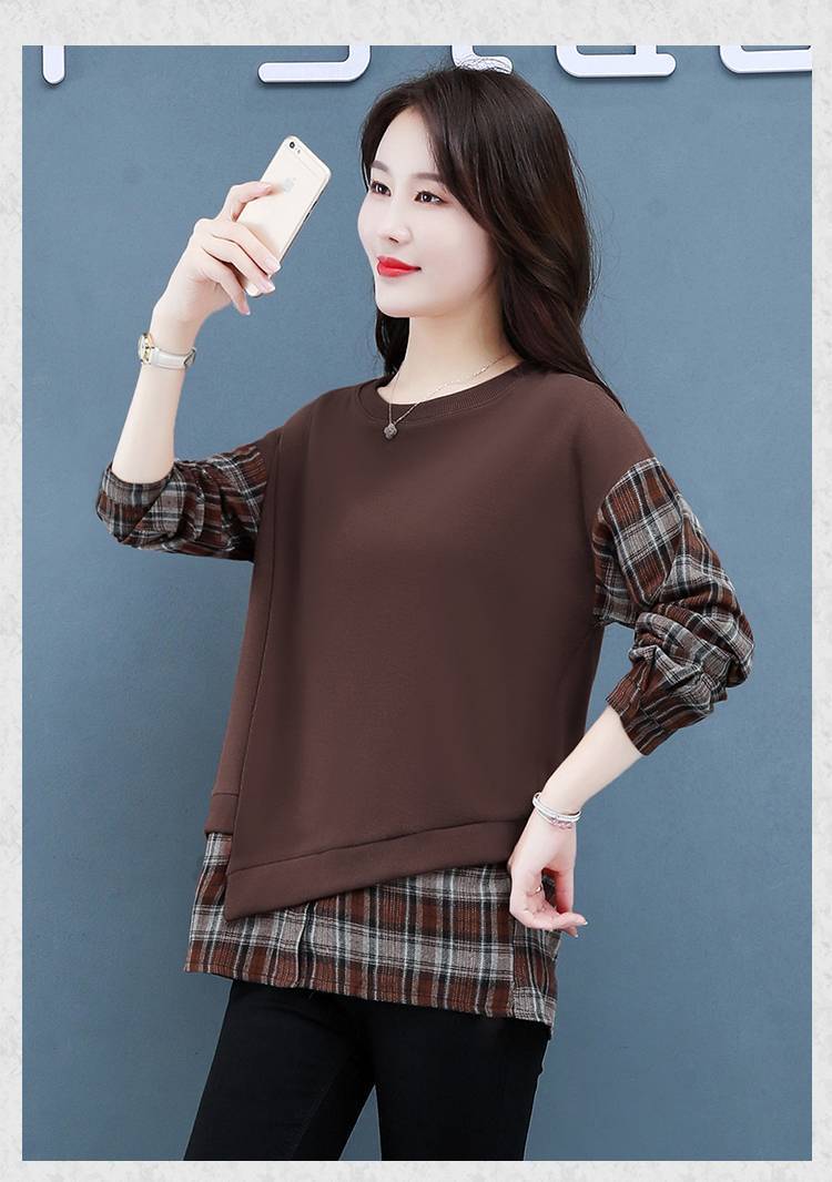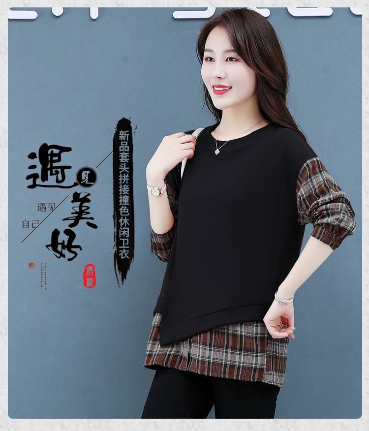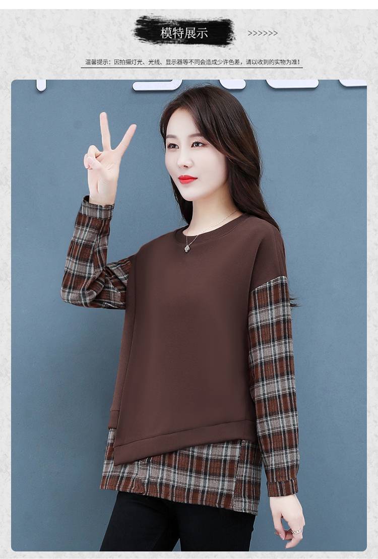 Sudadera súper popular de algodón con falso dos piezas para mujer, nueva para primavera y otoño, con costuras a cuadros en color contrastante, casual, holgada, para usar debajo, para mujer