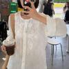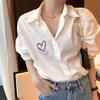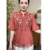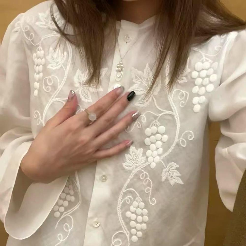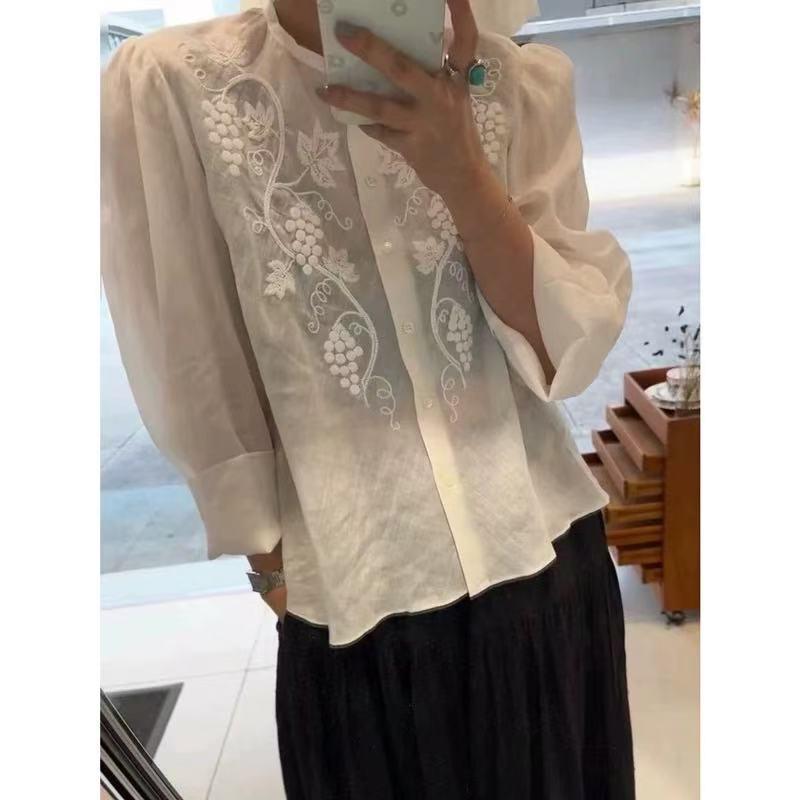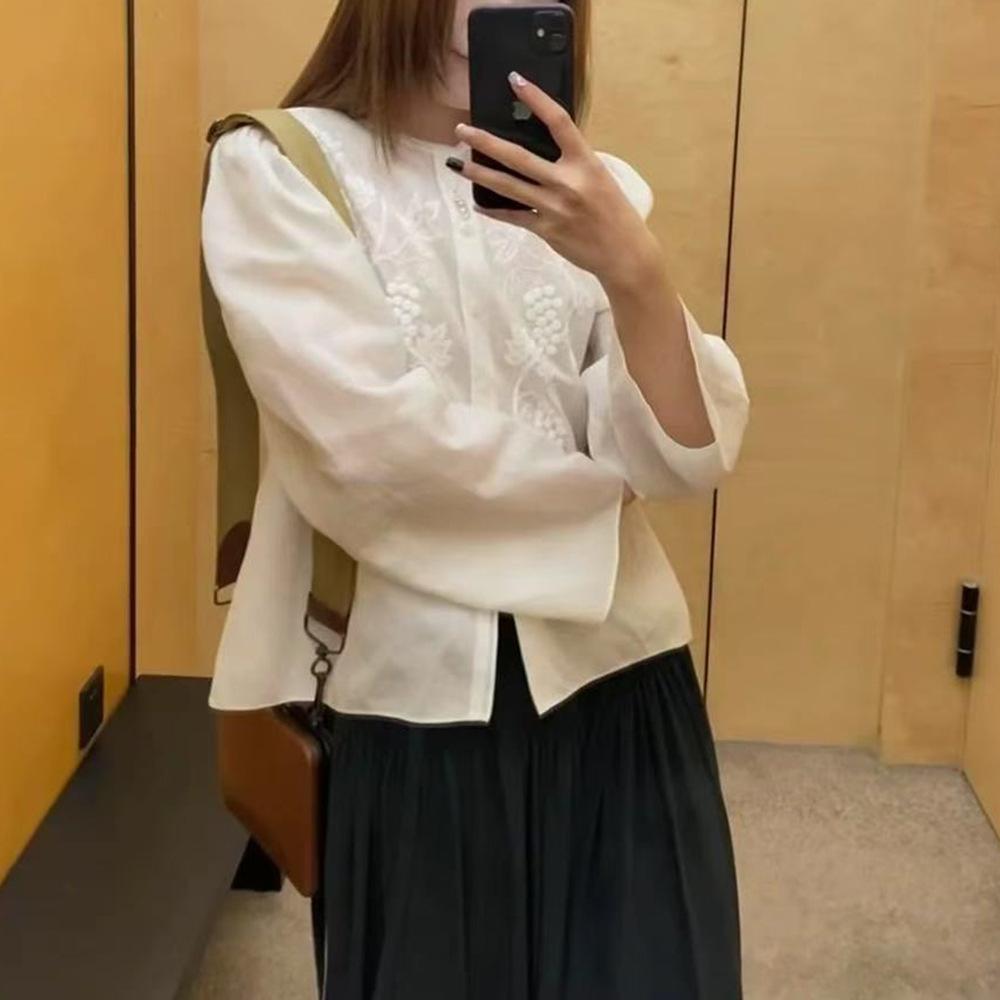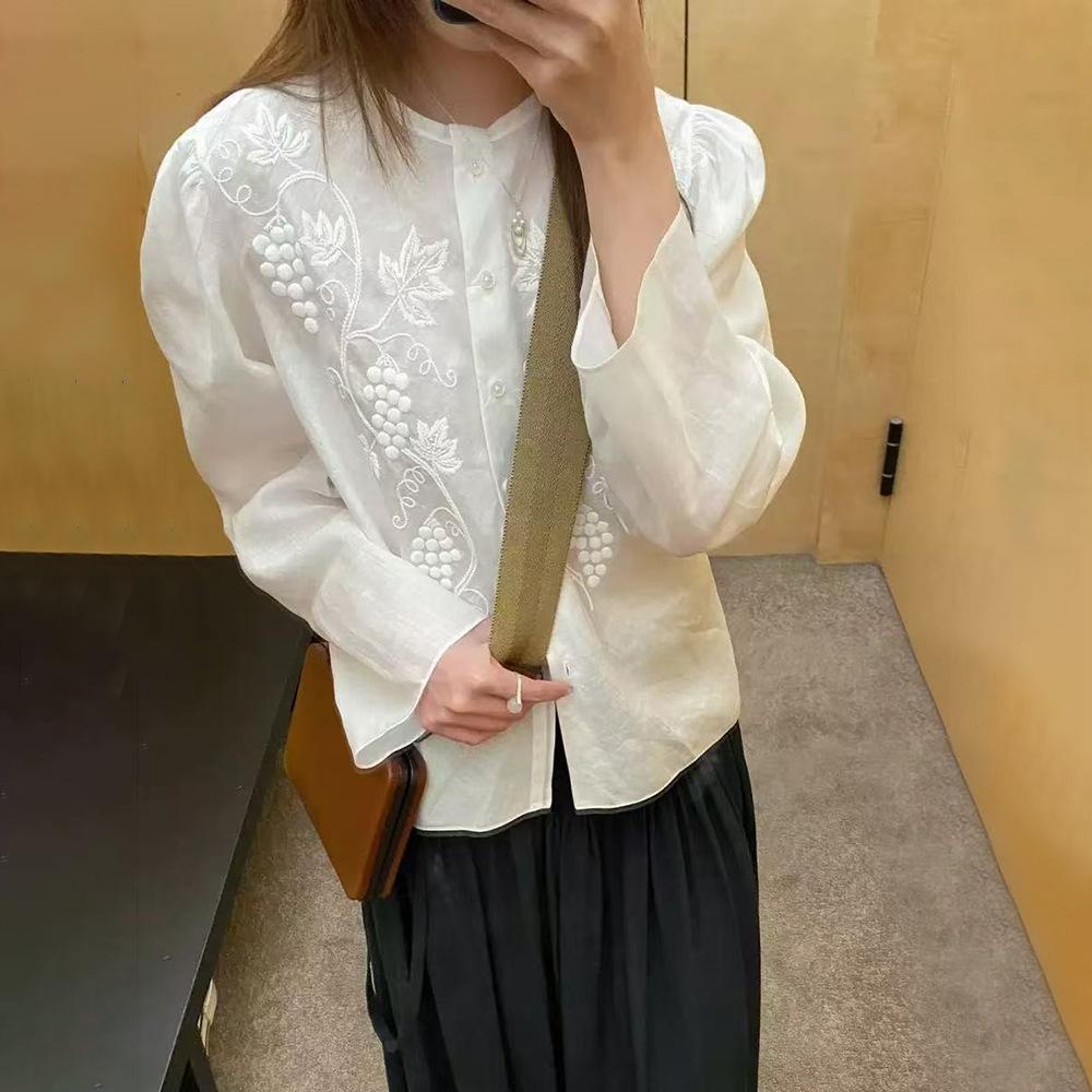 2025 Nuevo Estilo de Verano Nicho Blanco Cuello Redondo Bordado Empalmado Camisa de Manga Larga Abotonadura Sencilla Top Casual Holgado para Mujer