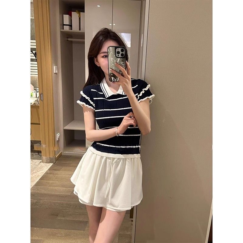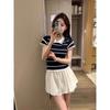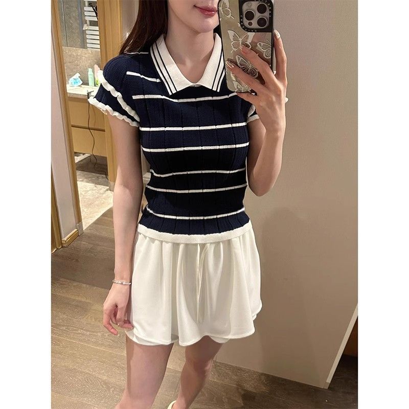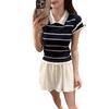 Camiseta POLO de punto de verano para mujer de manga corta a rayas transpirable seda de hielo moda temperamento casual cómoda de alta gama