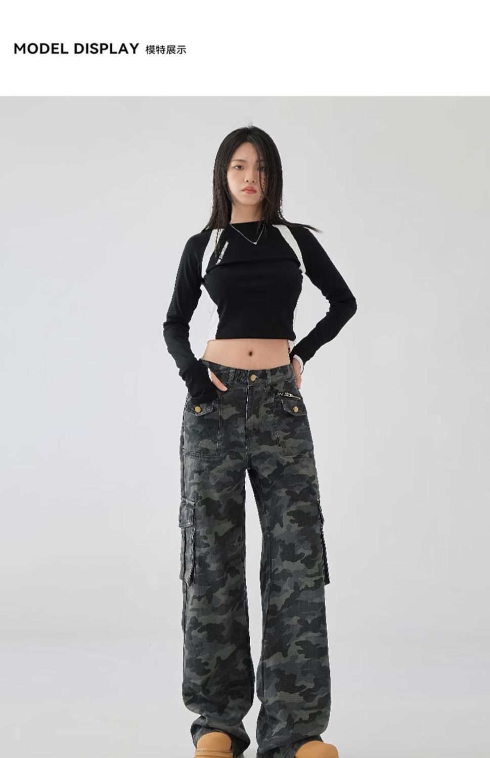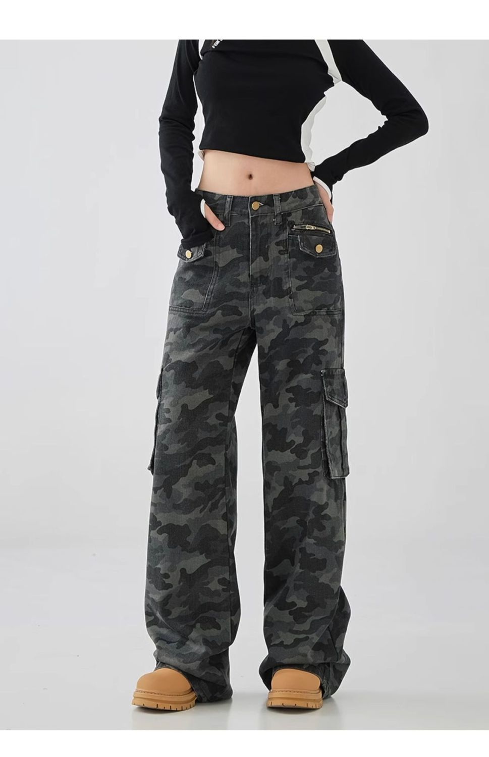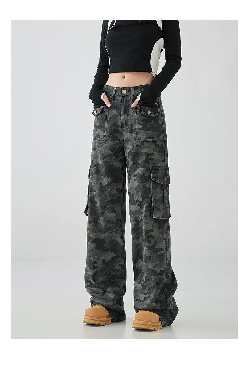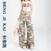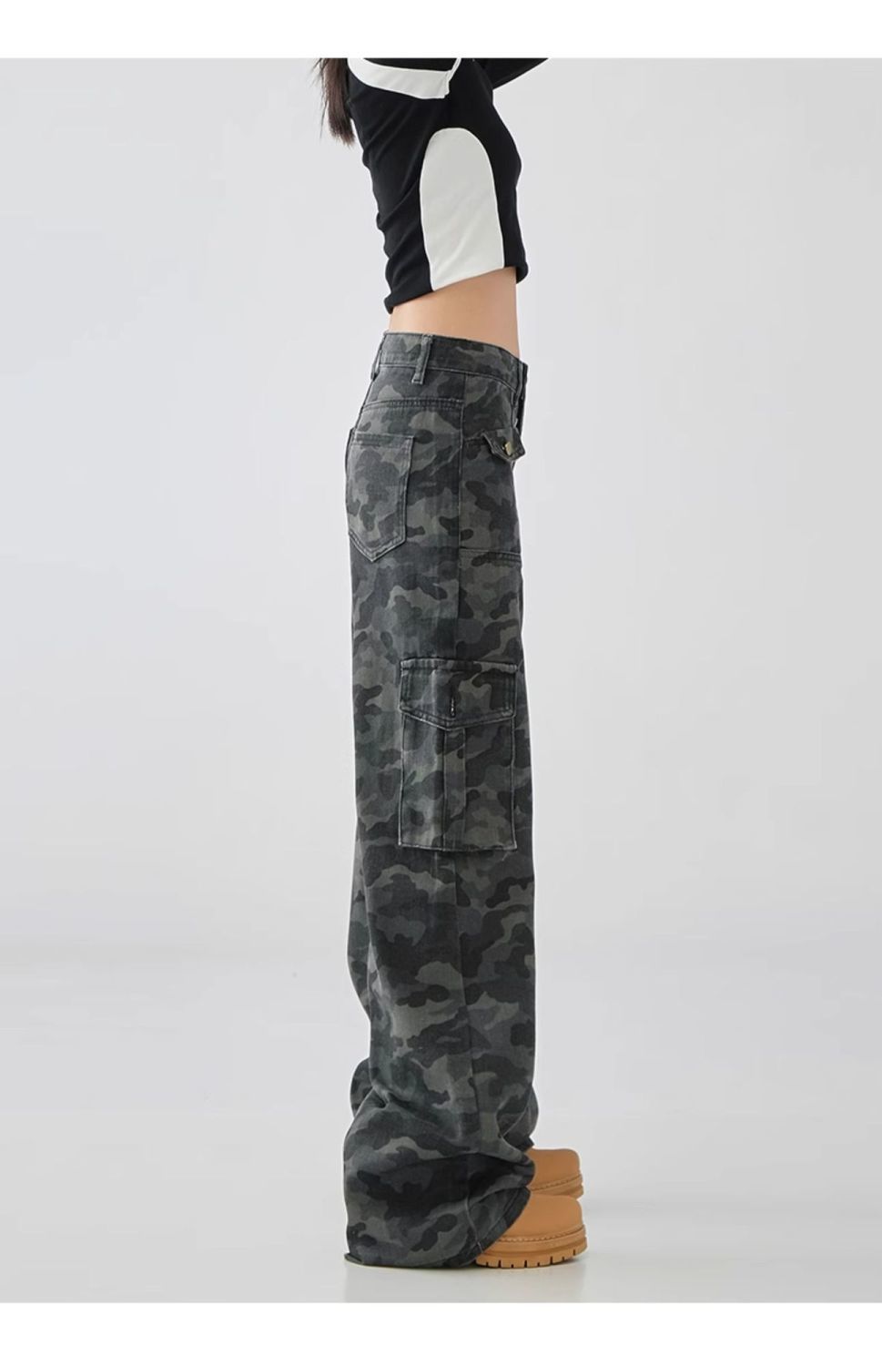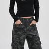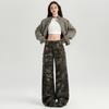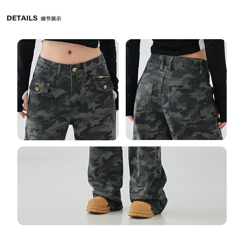 Mono vaquero camuflaje pierna ancha American High Street para mujer Otoño 2025 Nuevo Cintura alta Multibolsillos Pantalones largos hasta el suelo