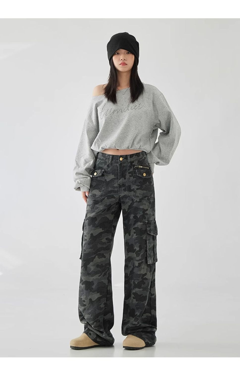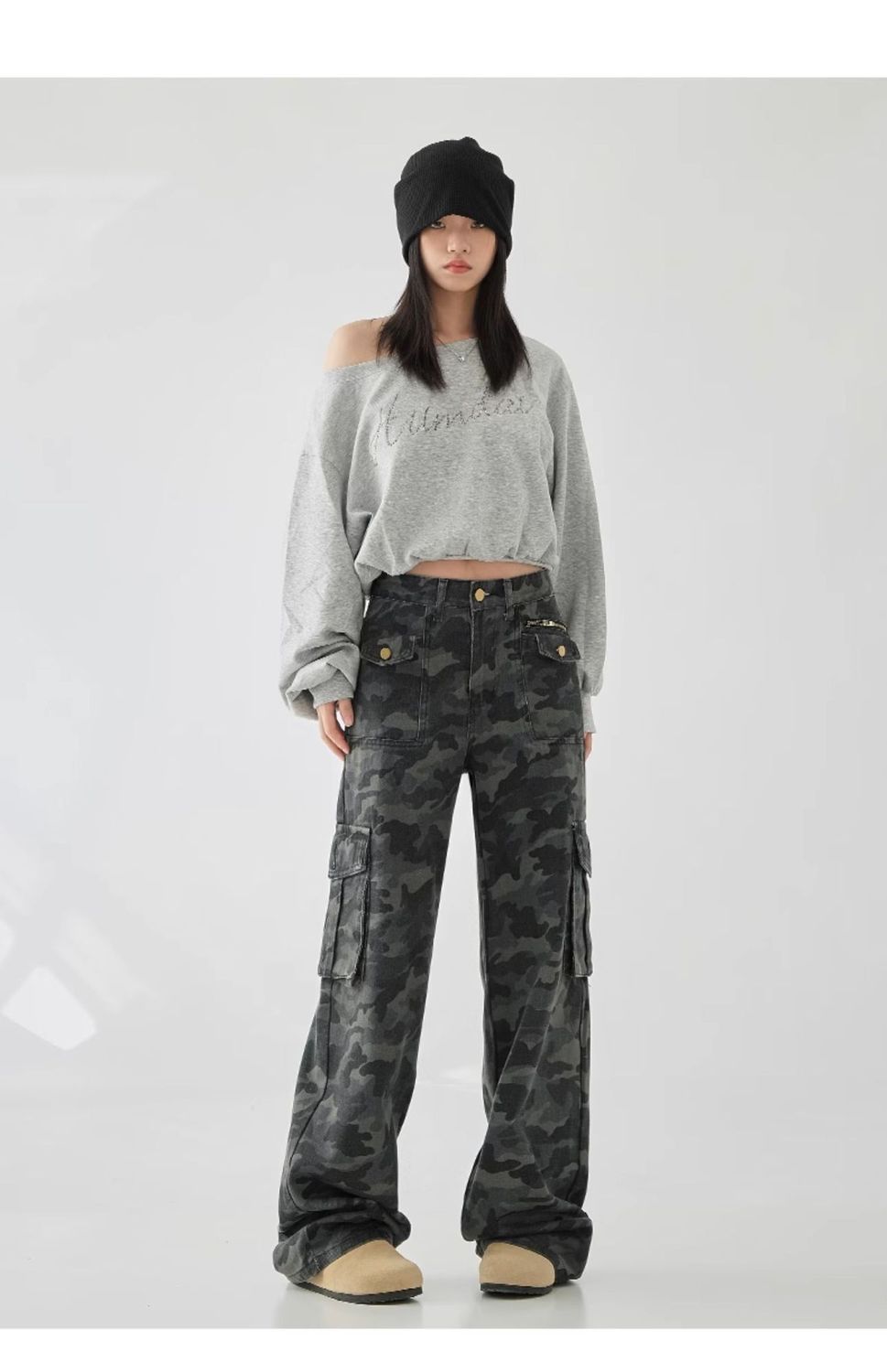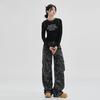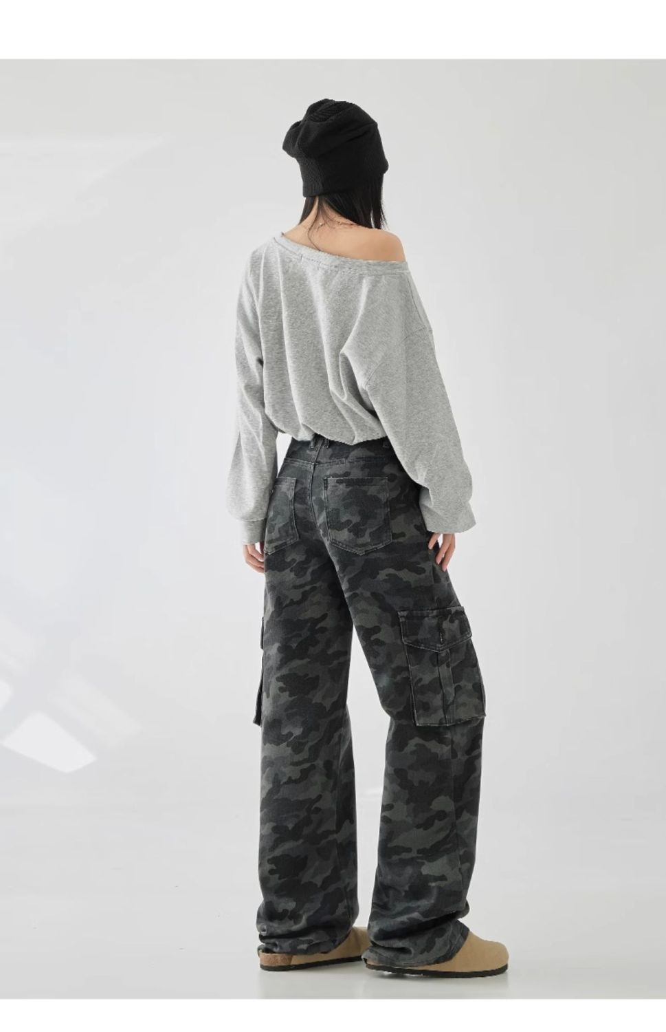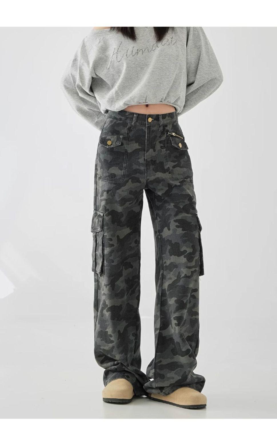 Mono vaquero camuflaje pierna ancha American High Street para mujer Otoño 2025 Nuevo Cintura alta Multibolsillos Pantalones largos hasta el suelo
