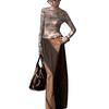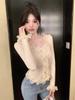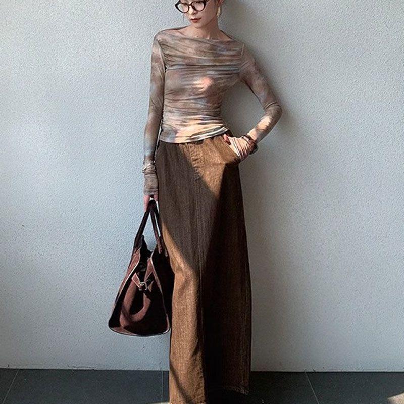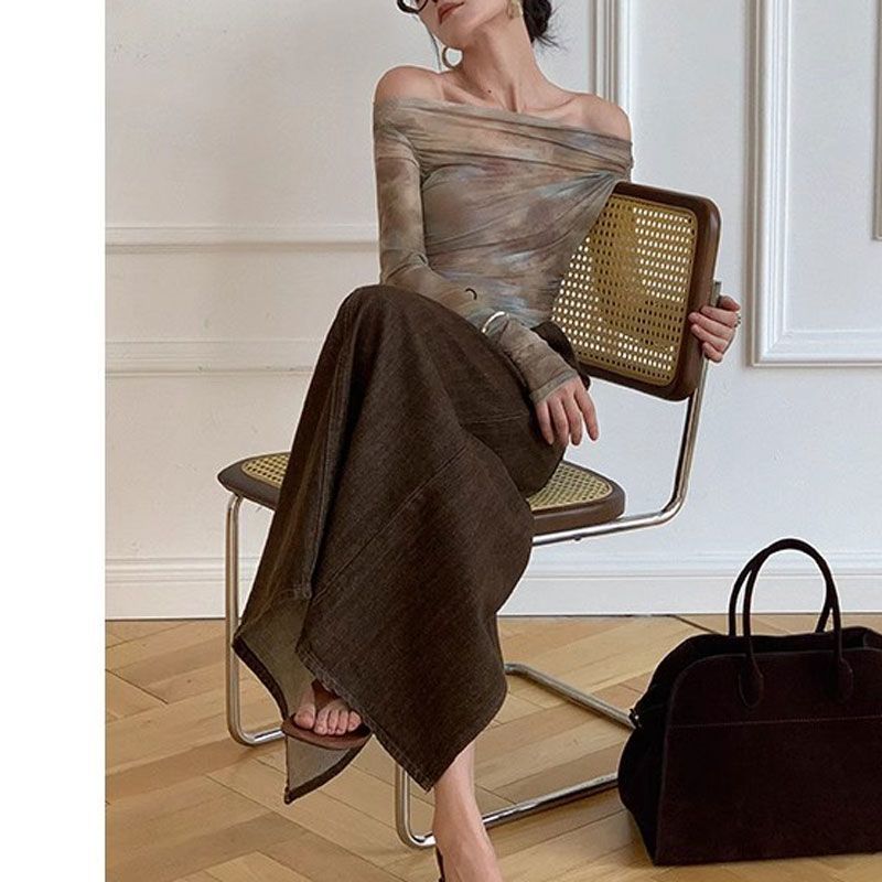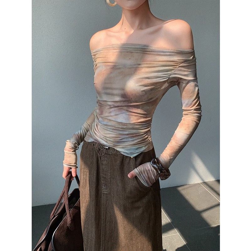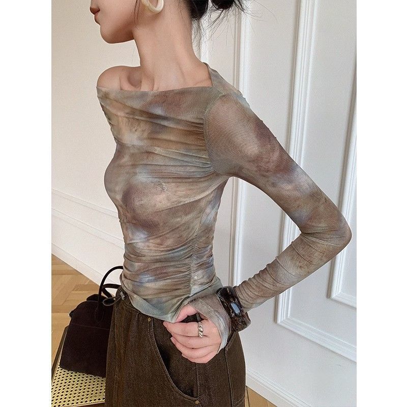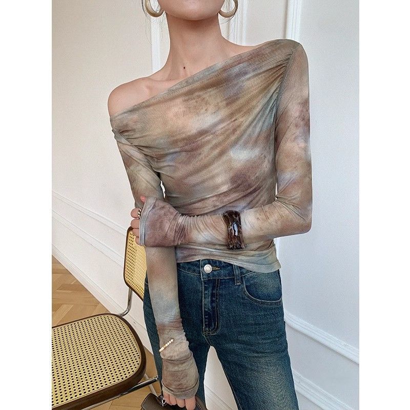 Camiseta de Malla de Manga Larga con un Hombro Descubierto Tie-Dye para Mujer Primavera Nueva Camiseta Base Top Protección Solar