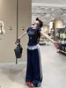 Playera azul marino de corte slim de manga corta para mujer, traje de verano, costuras de encaje, pantalones casuales, pantalones de pierna ancha, conjunto de dos piezas