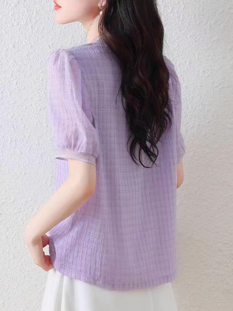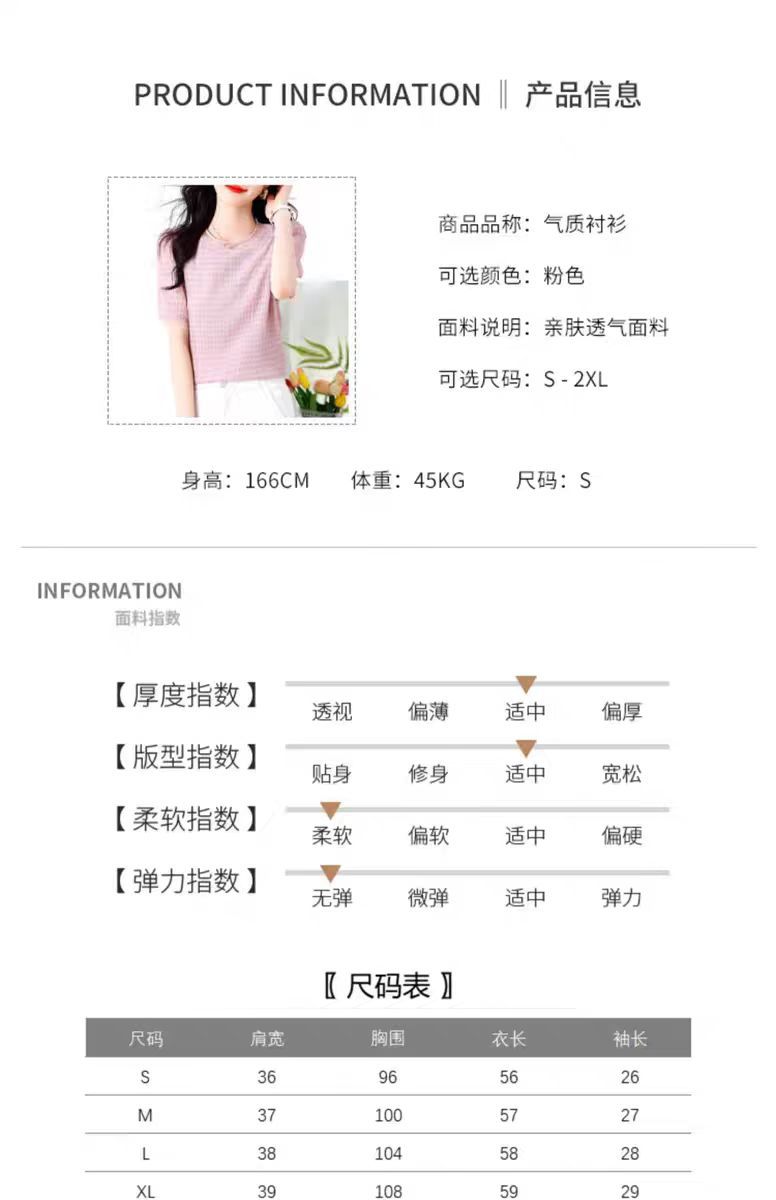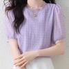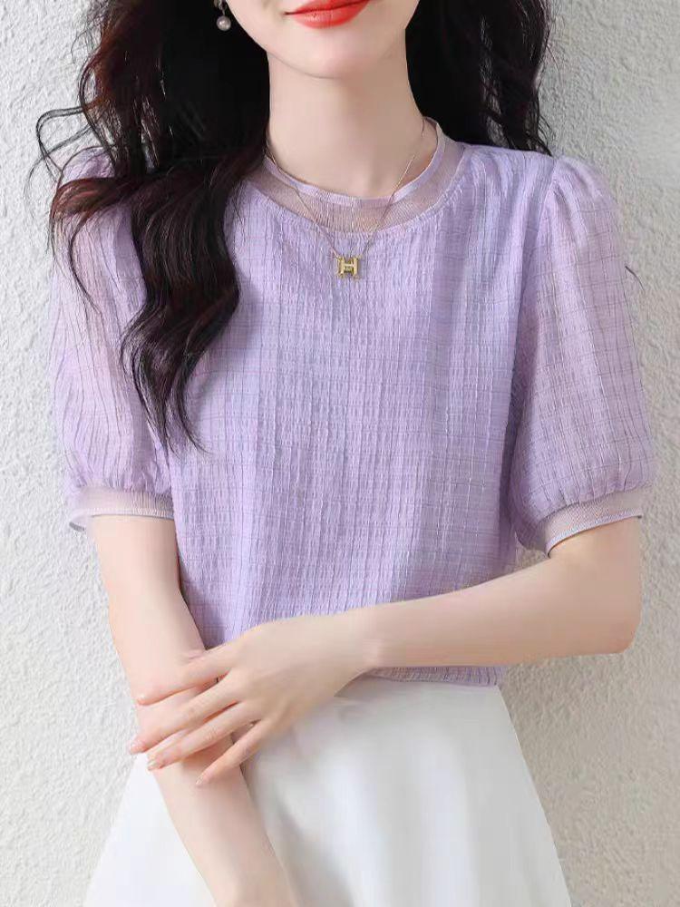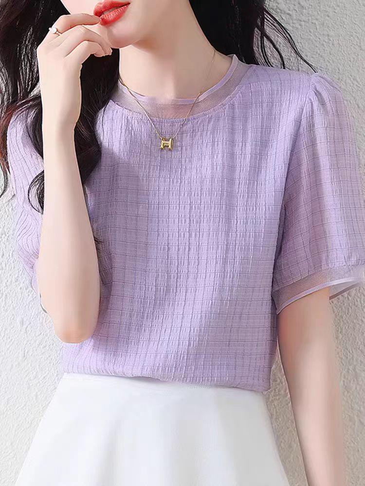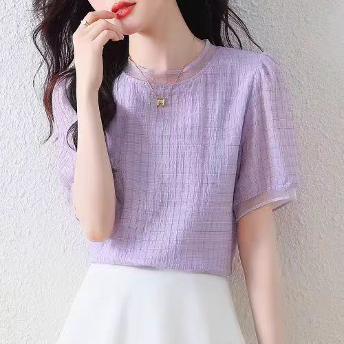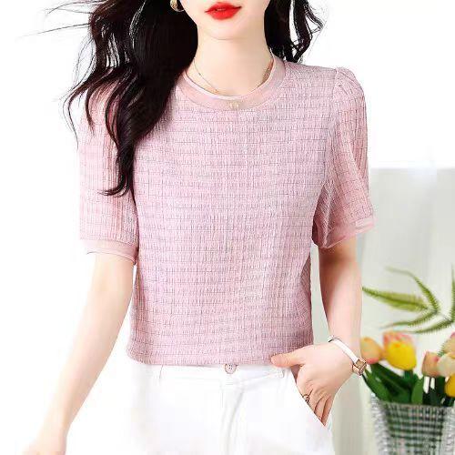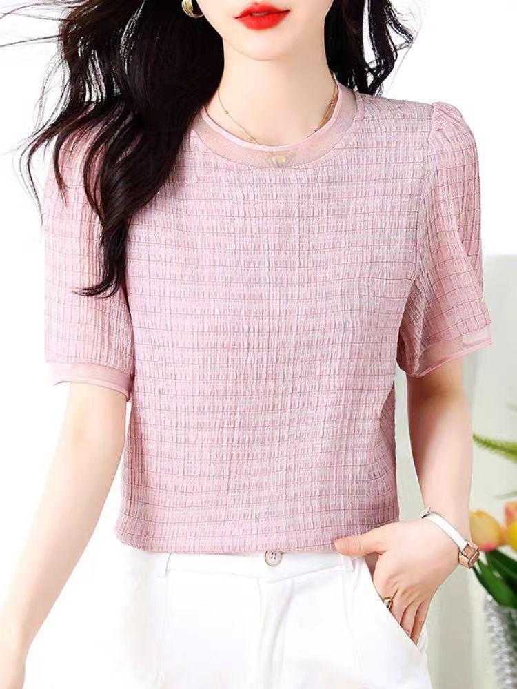Camiseta de gasa de manga corta para mujer, verano 2025, nueva, elegante, a la moda, para ir al trabajo, adelgazante, cuello redondo, top combinable para tallas pequeñas