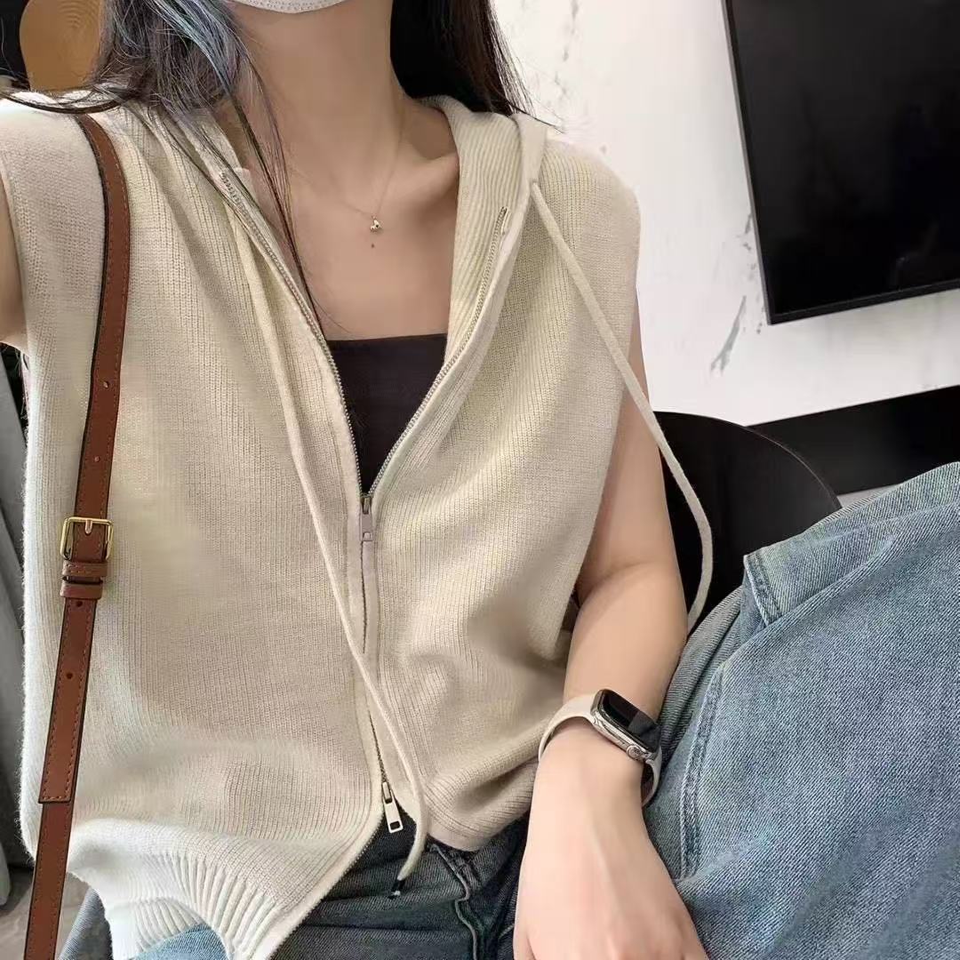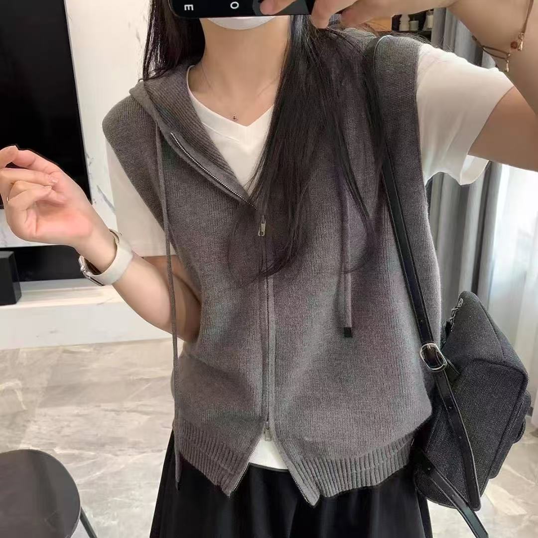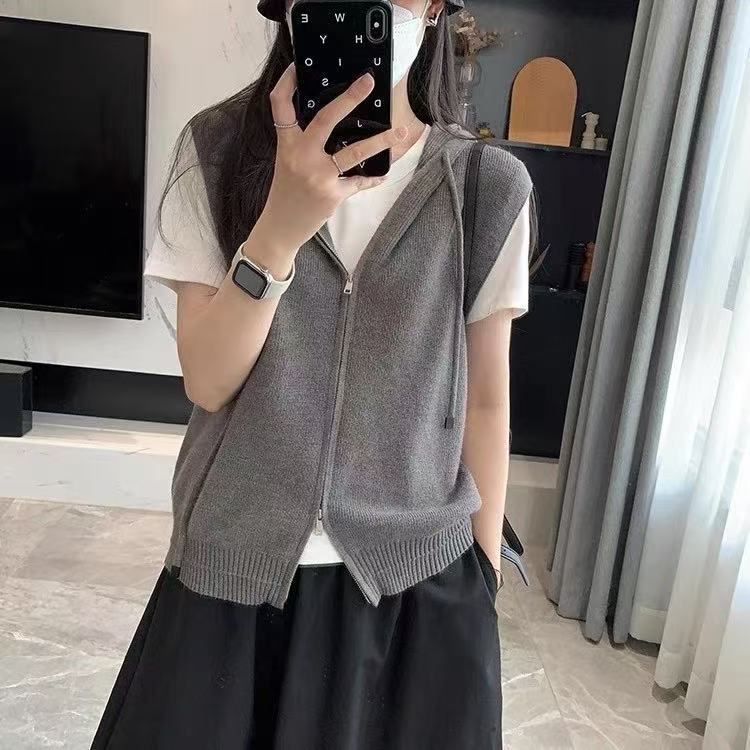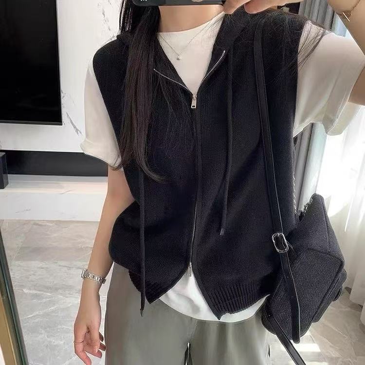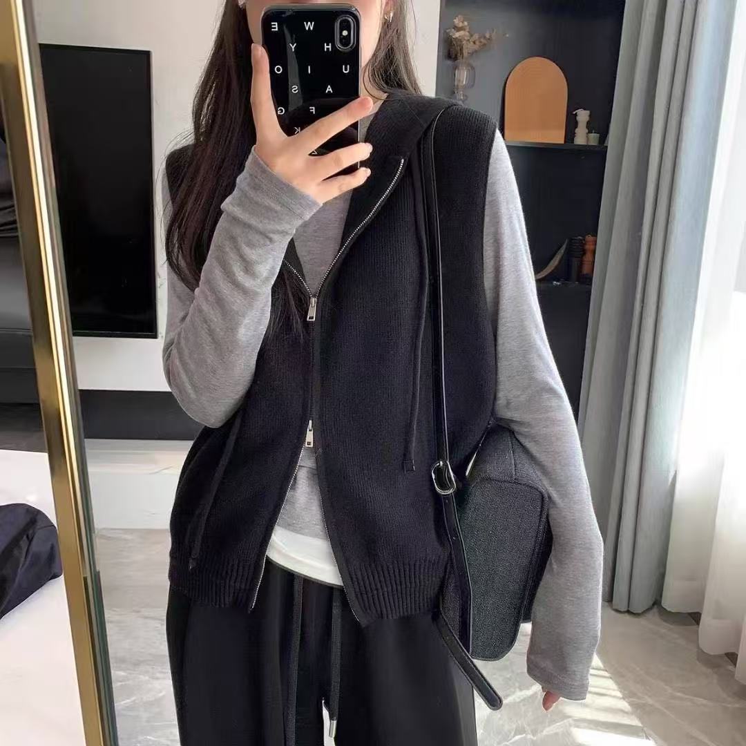Chaleco de Punto con Capucha y Cremallera para Mujer en Otoño Nuevo Estilo Holgado Lazy Chaleco Exterior Suéter Chaleco Top