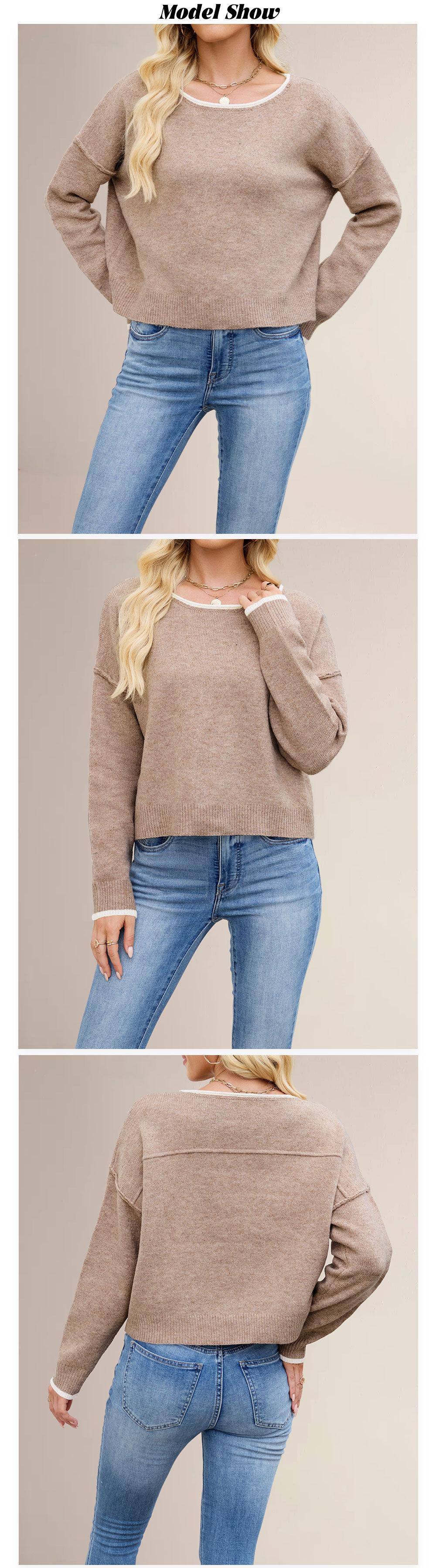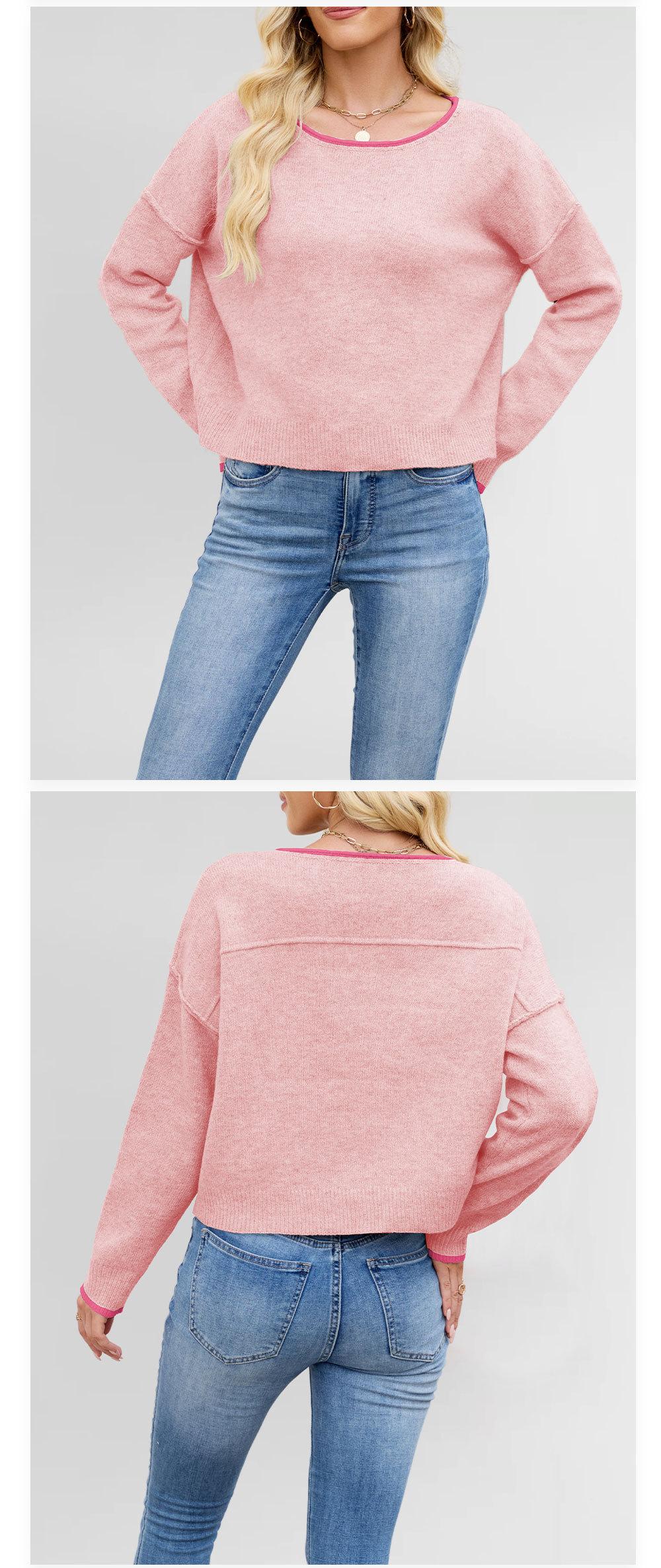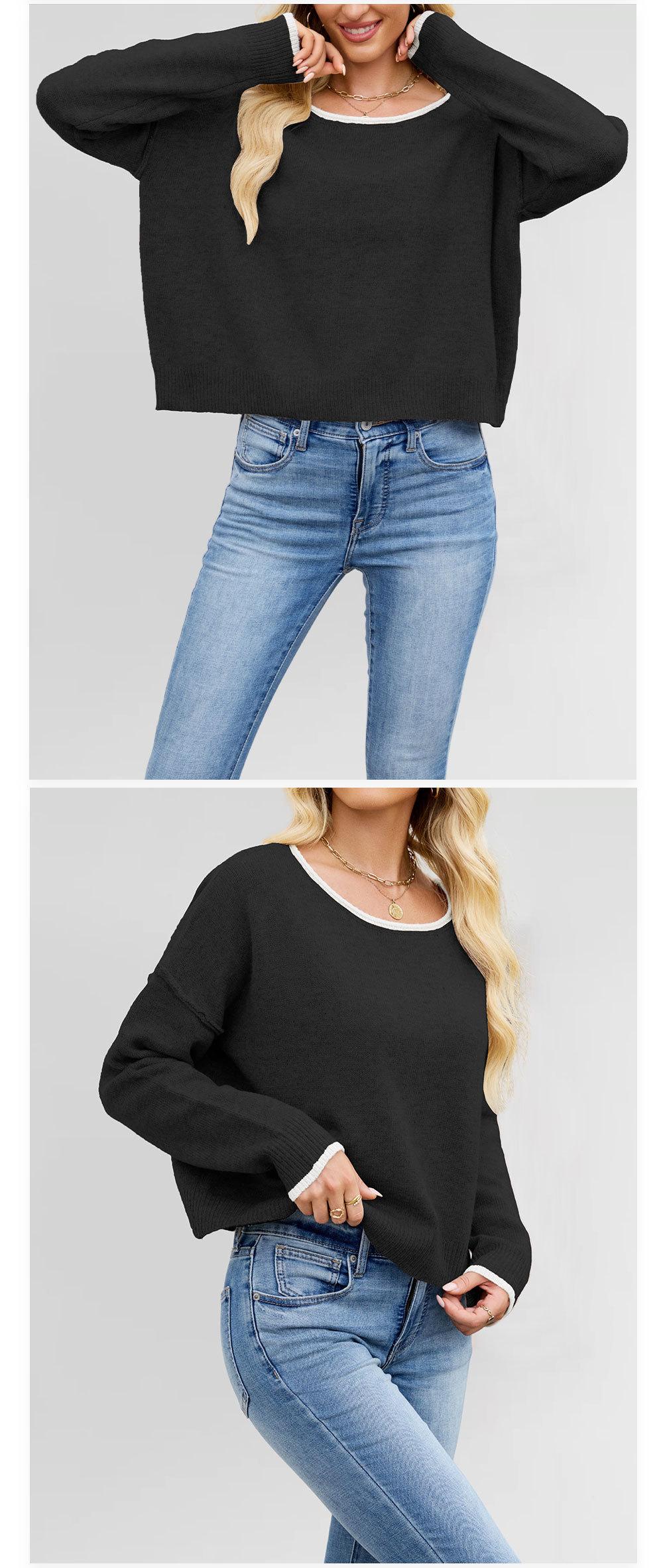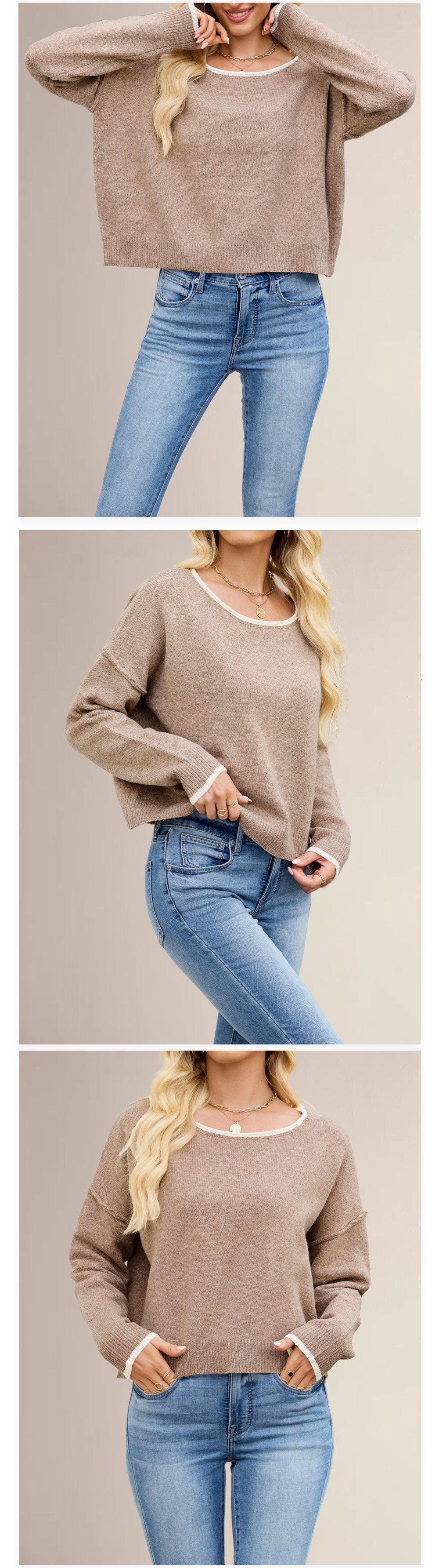 Ropa de Mujer Transfronteriza Nueva Europea y Americana 2025 Más Vendida Otoño e Invierno Tejidos de Punto de Cuello Redondo con Bloques de Color Suéteres de Punto Holgados y Versátiles
