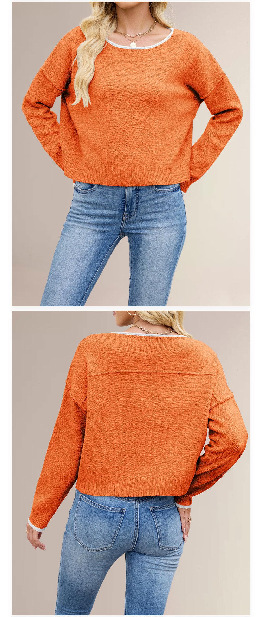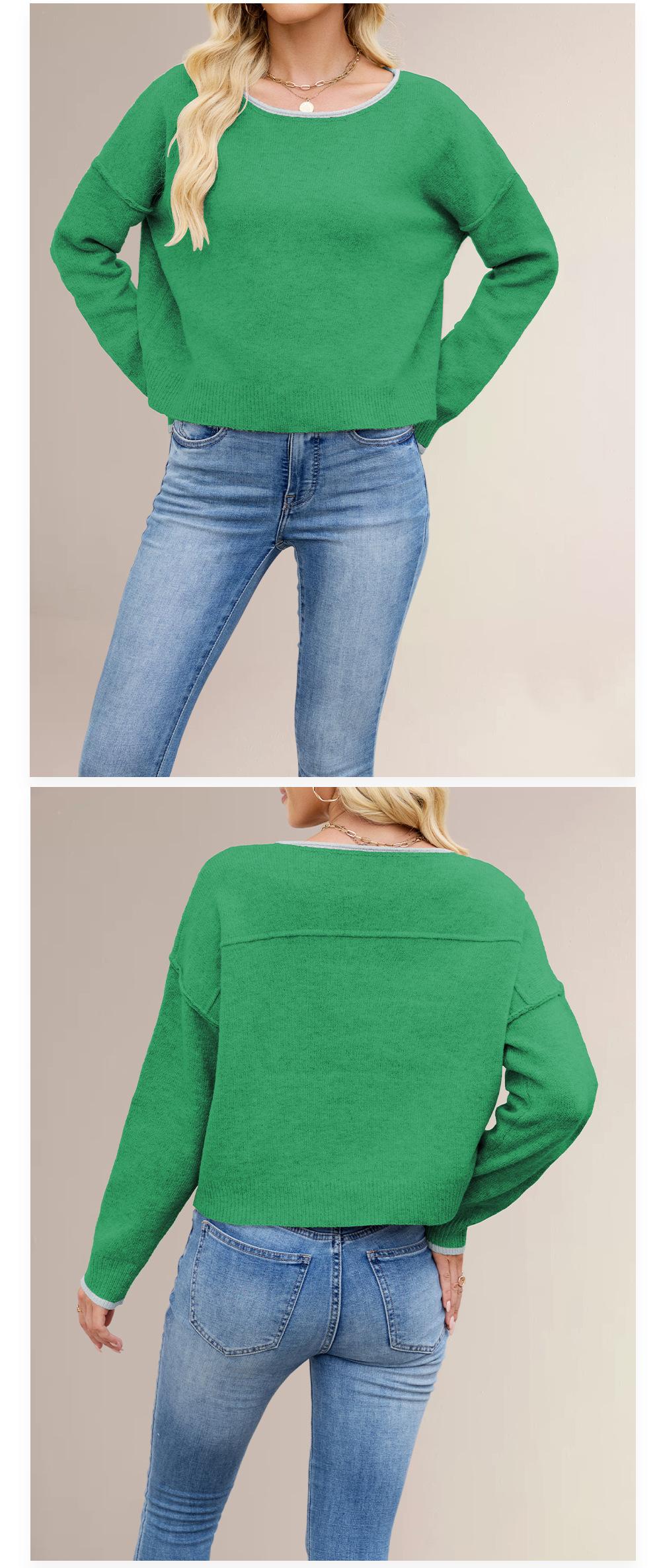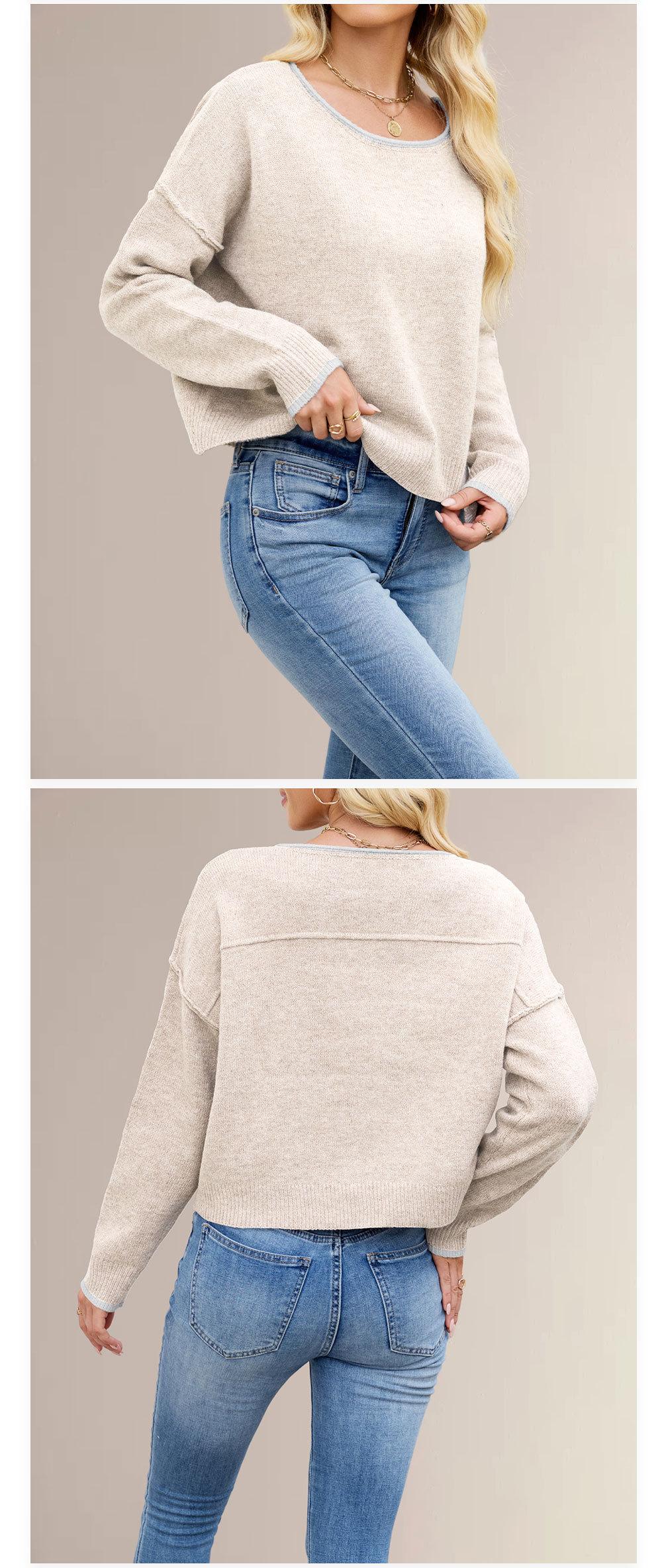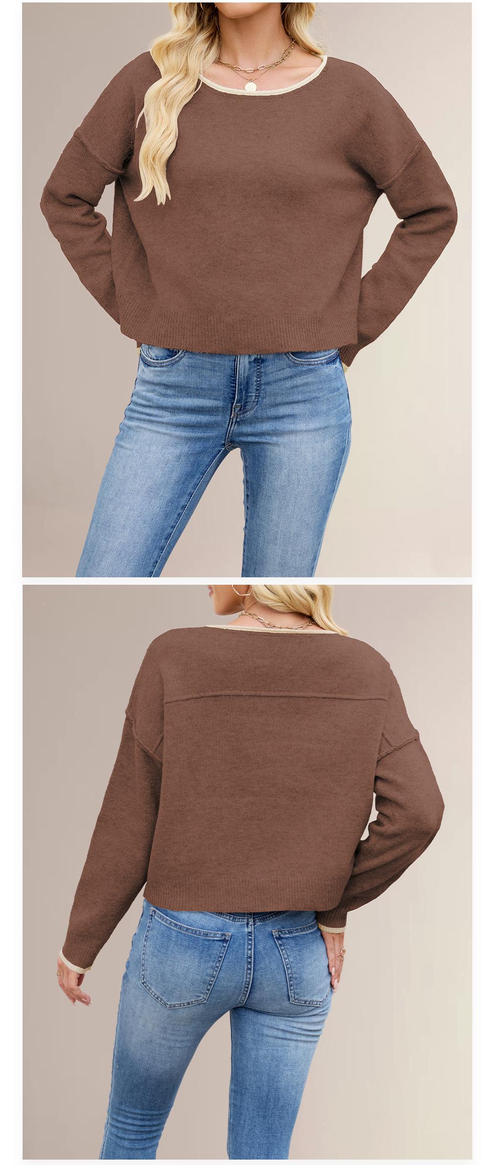 Ropa de Mujer Transfronteriza Nueva Europea y Americana 2025 Más Vendida Otoño e Invierno Tejidos de Punto de Cuello Redondo con Bloques de Color Suéteres de Punto Holgados y Versátiles
