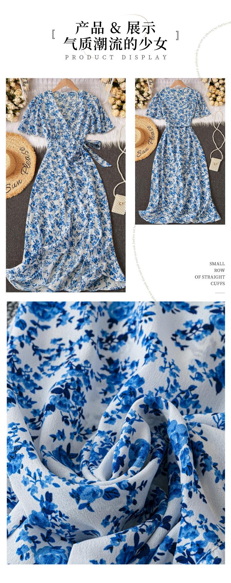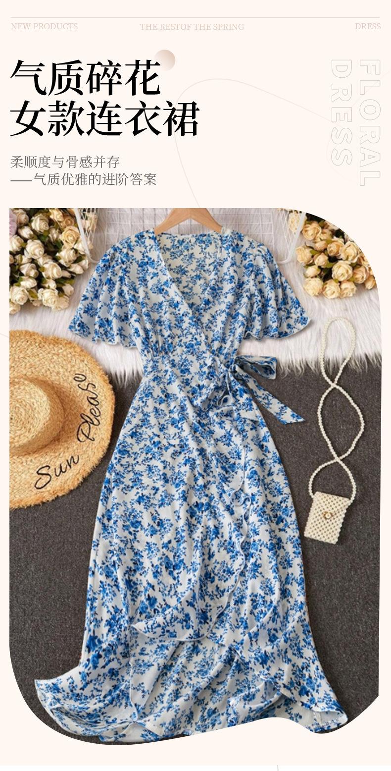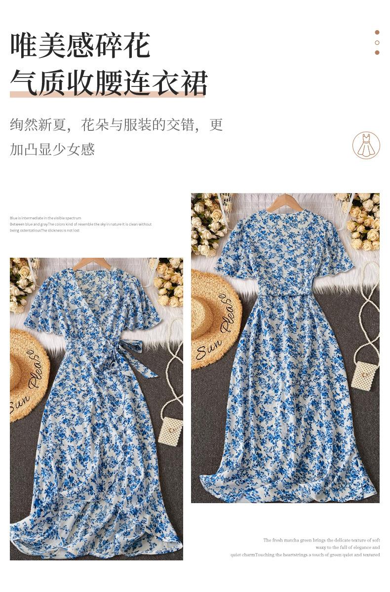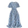 Vestido Floral Estilo Retro Comercio Exterior 2025 Verano Nuevo Manga Corta Cuello en V Adelgazante de Cintura Línea A Acampanado