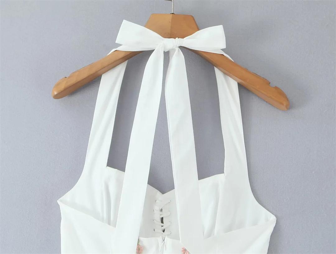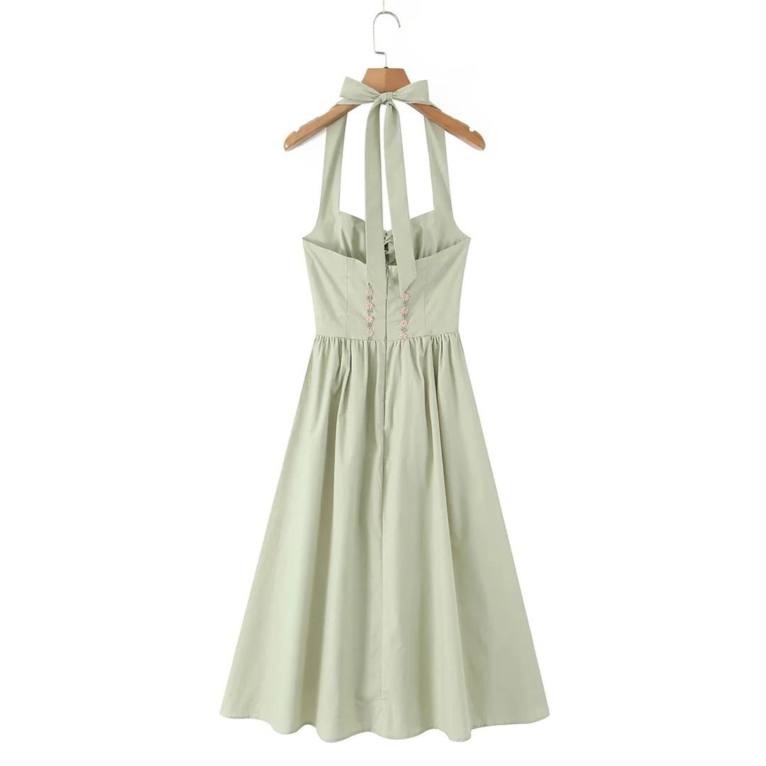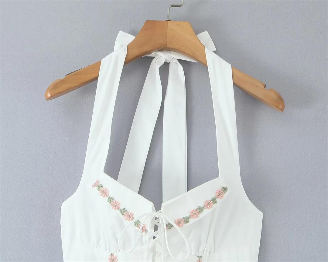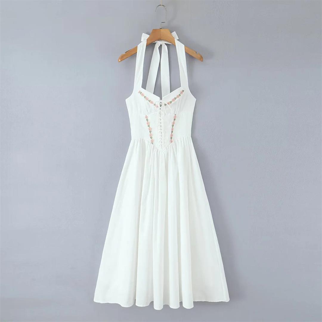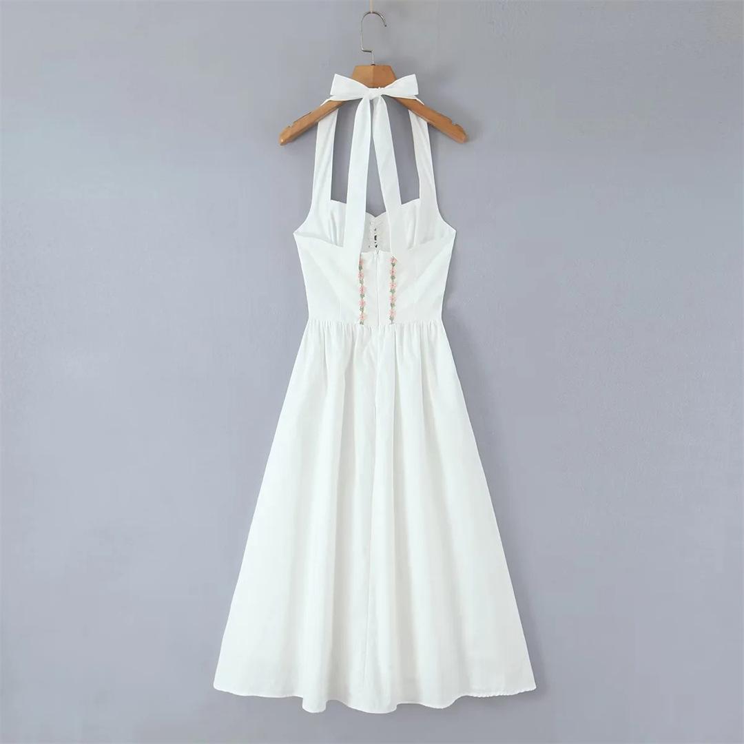 Vestido halter diseñado con bordado de flores pequeñas en el pecho, cintura femenina grande sin espalda y falda midi de dobladillo ancho.
