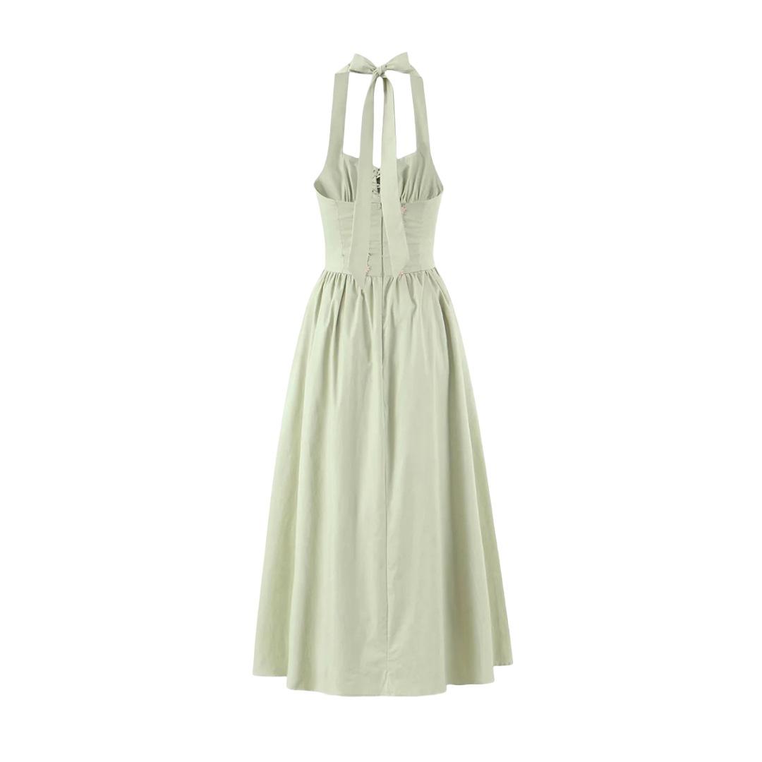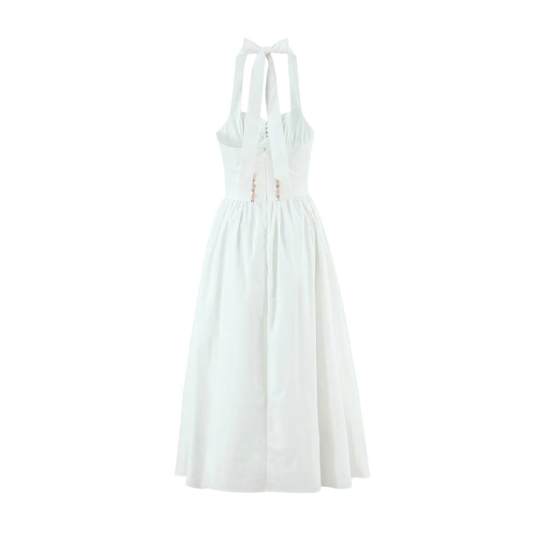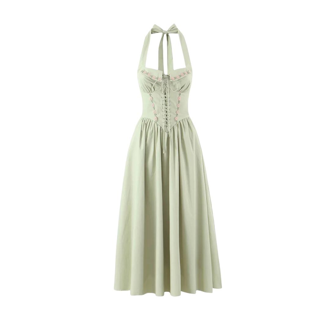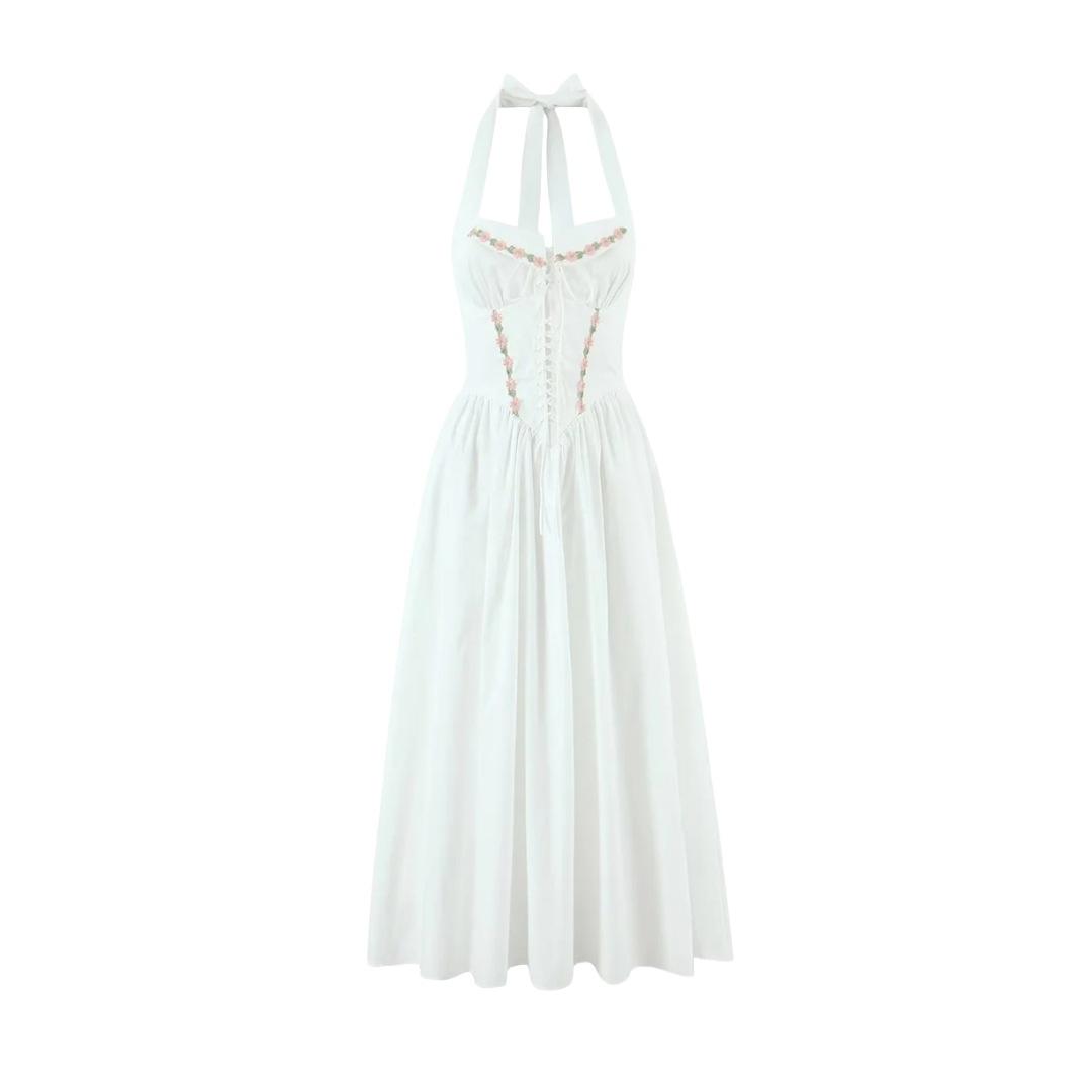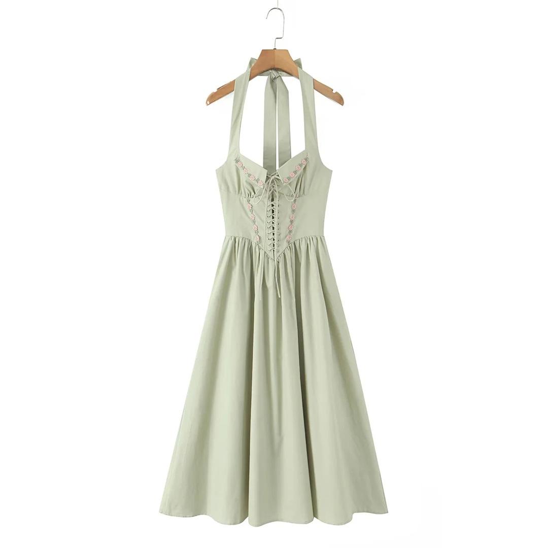 Vestido halter diseñado con bordado de flores pequeñas en el pecho, cintura femenina grande sin espalda y falda midi de dobladillo ancho.
