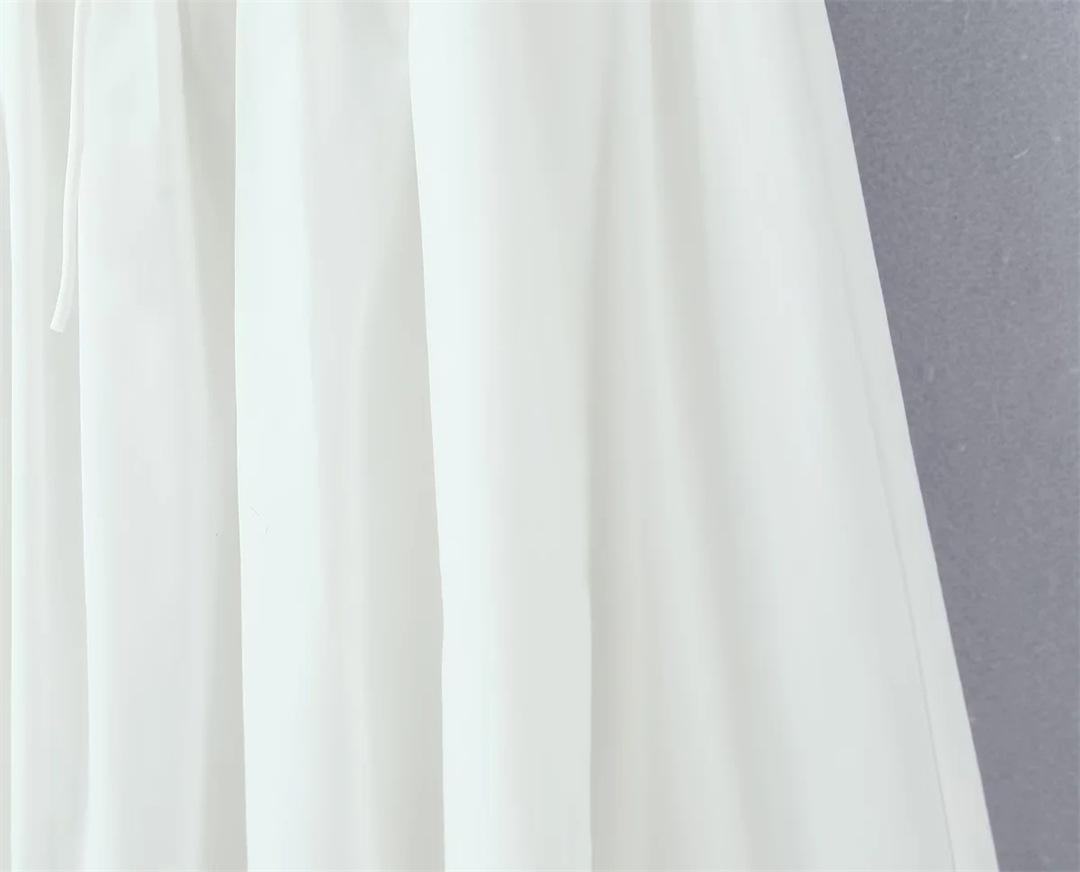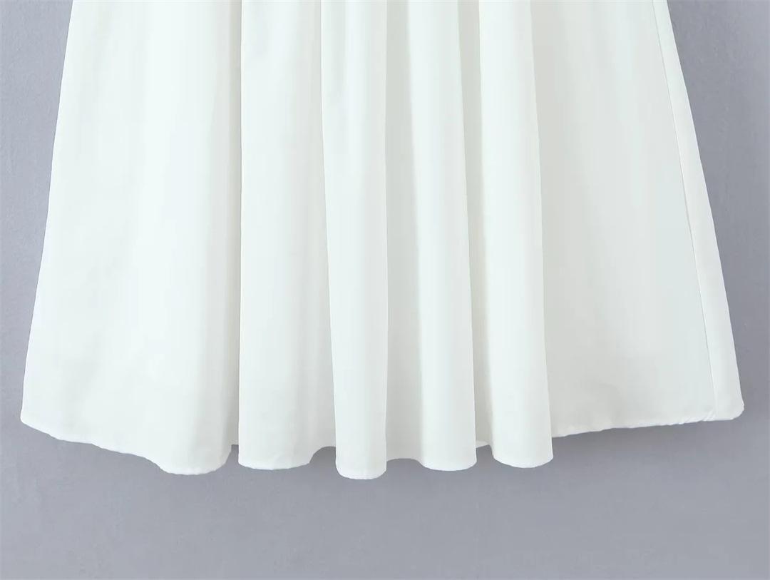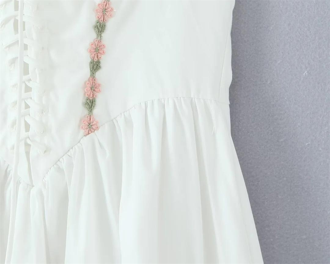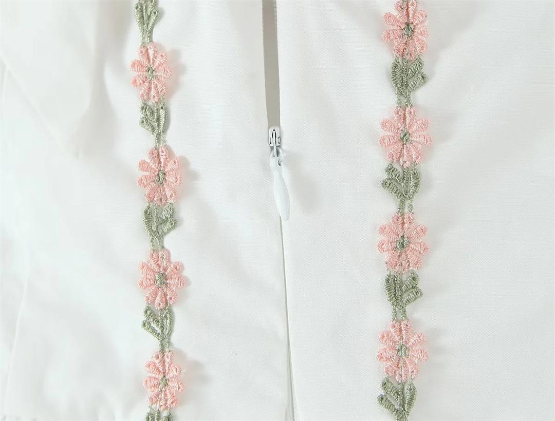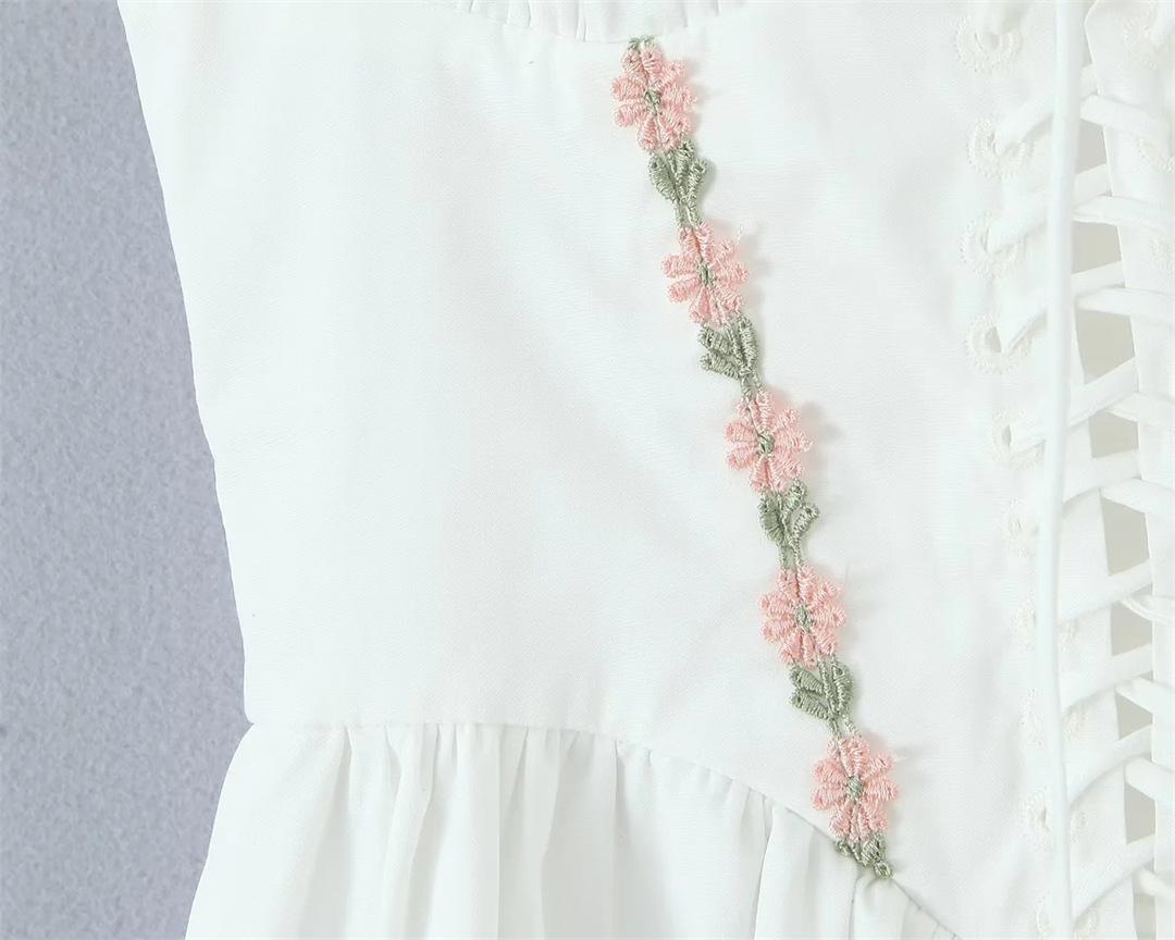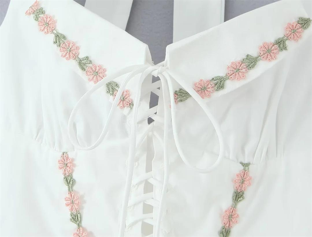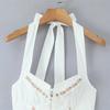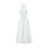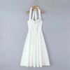 Vestido halter diseñado con bordado de flores pequeñas en el pecho, cintura femenina grande sin espalda y falda midi de dobladillo ancho.