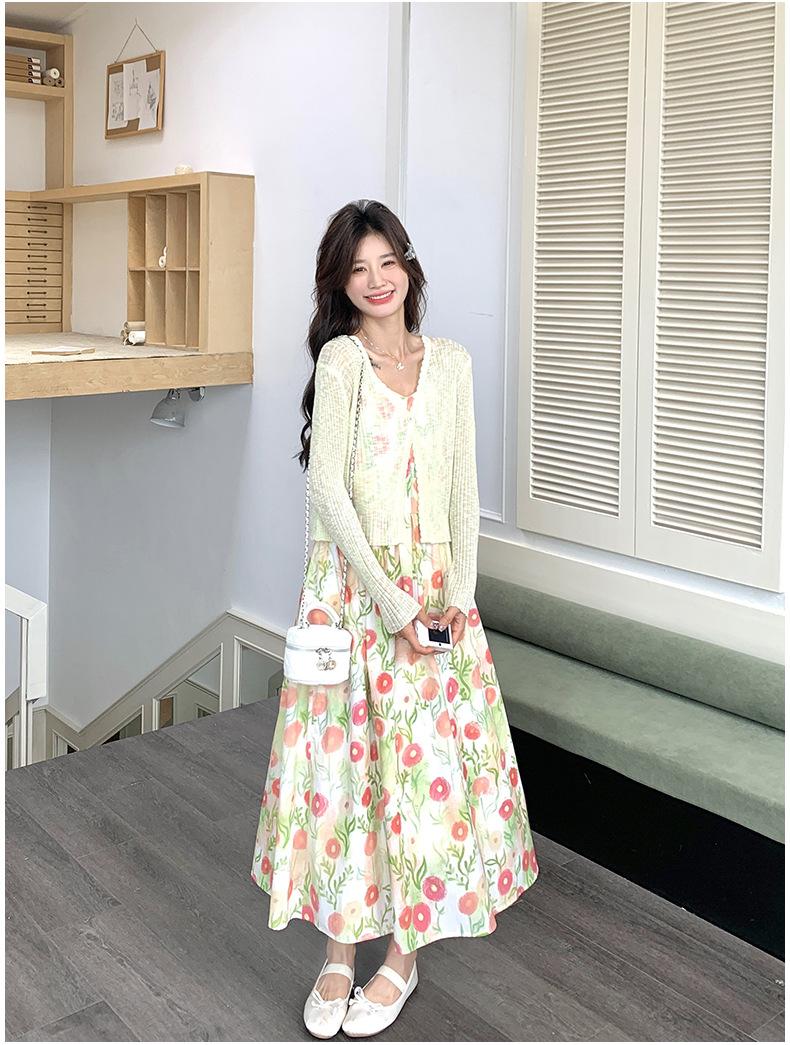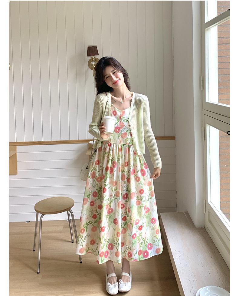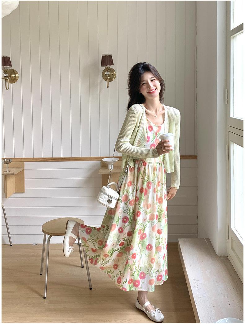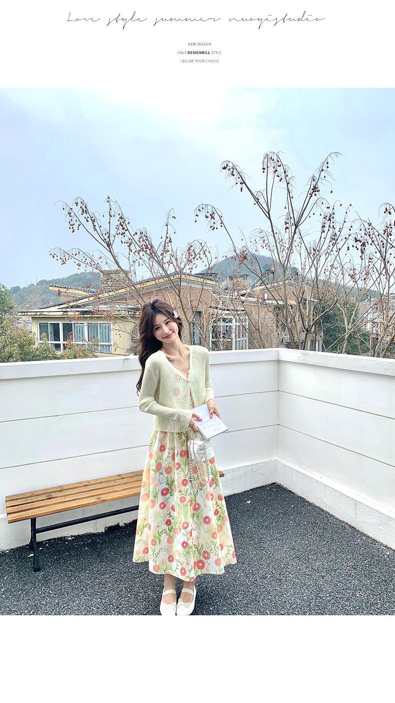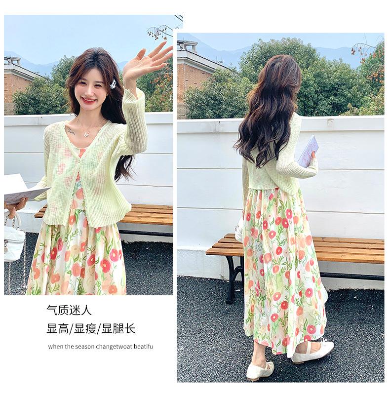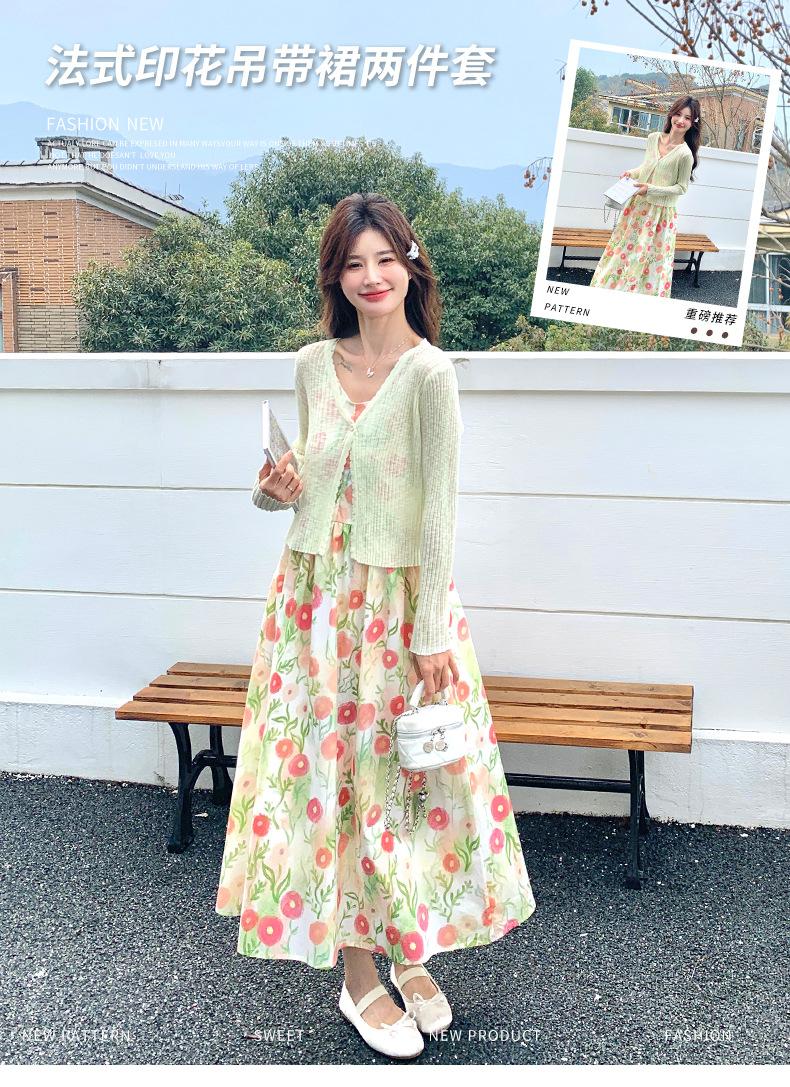Conjunto de Vestido de Tirantes Florales Franceses Nuevos 2025 para Mujer, Conjunto de Dos Piezas de Cárdigan de Punto de Estilo Suave de Verano Otro