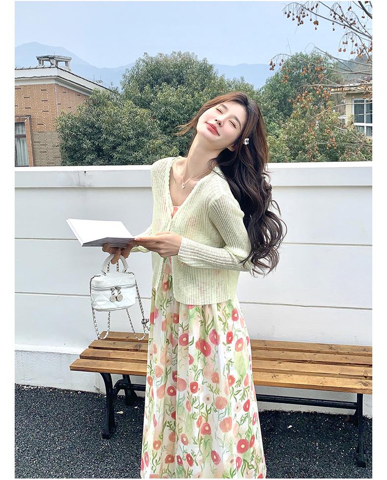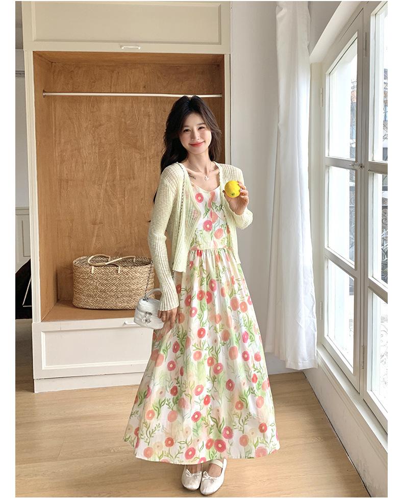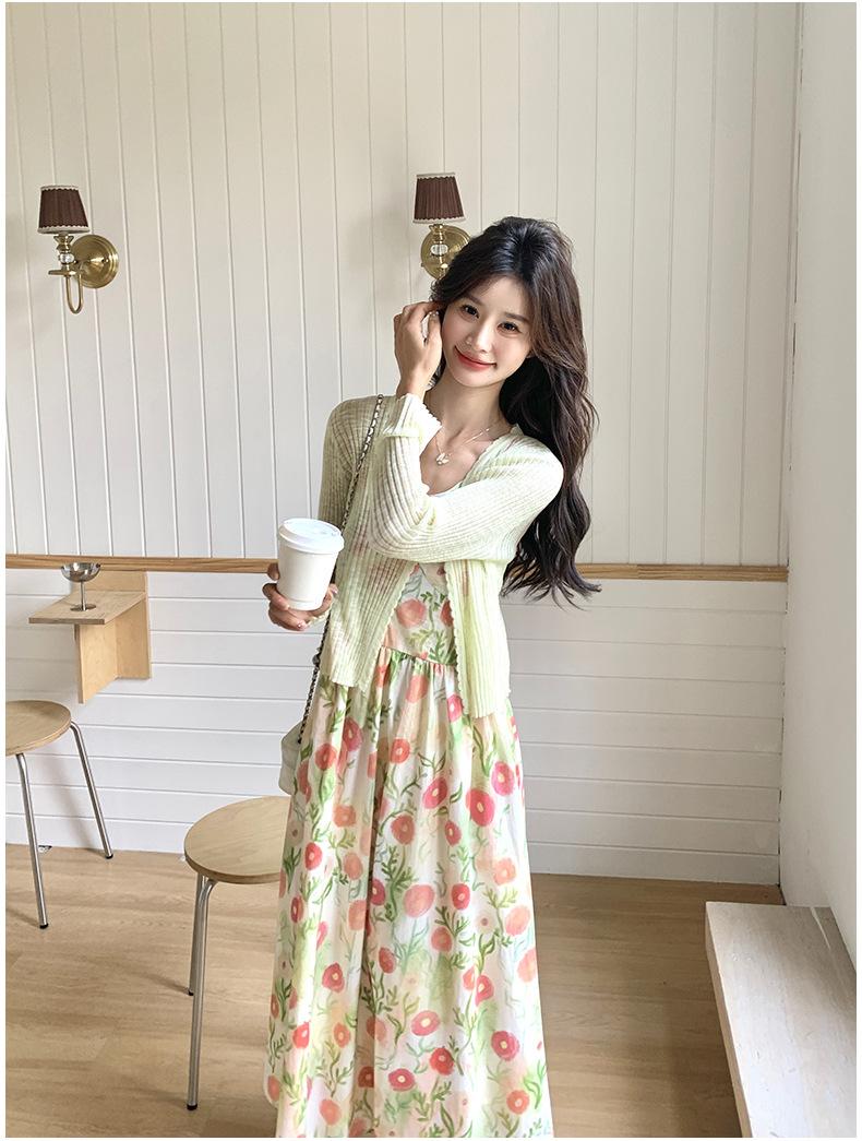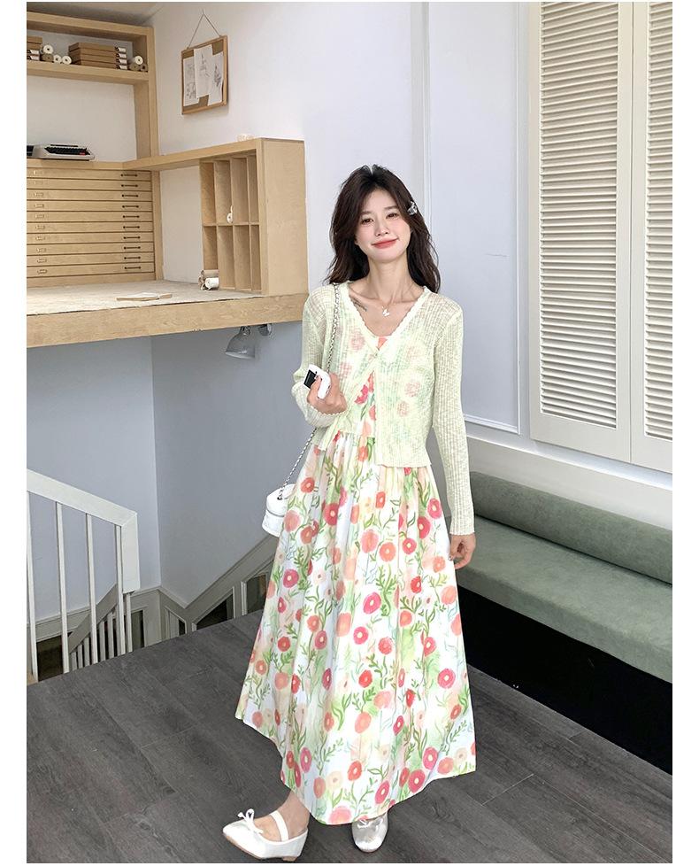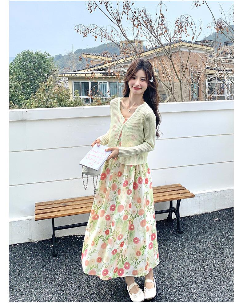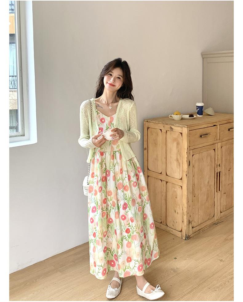 Conjunto de Vestido de Tirantes Florales Franceses Nuevos 2025 para Mujer, Conjunto de Dos Piezas de Cárdigan de Punto de Estilo Suave de Verano Otro