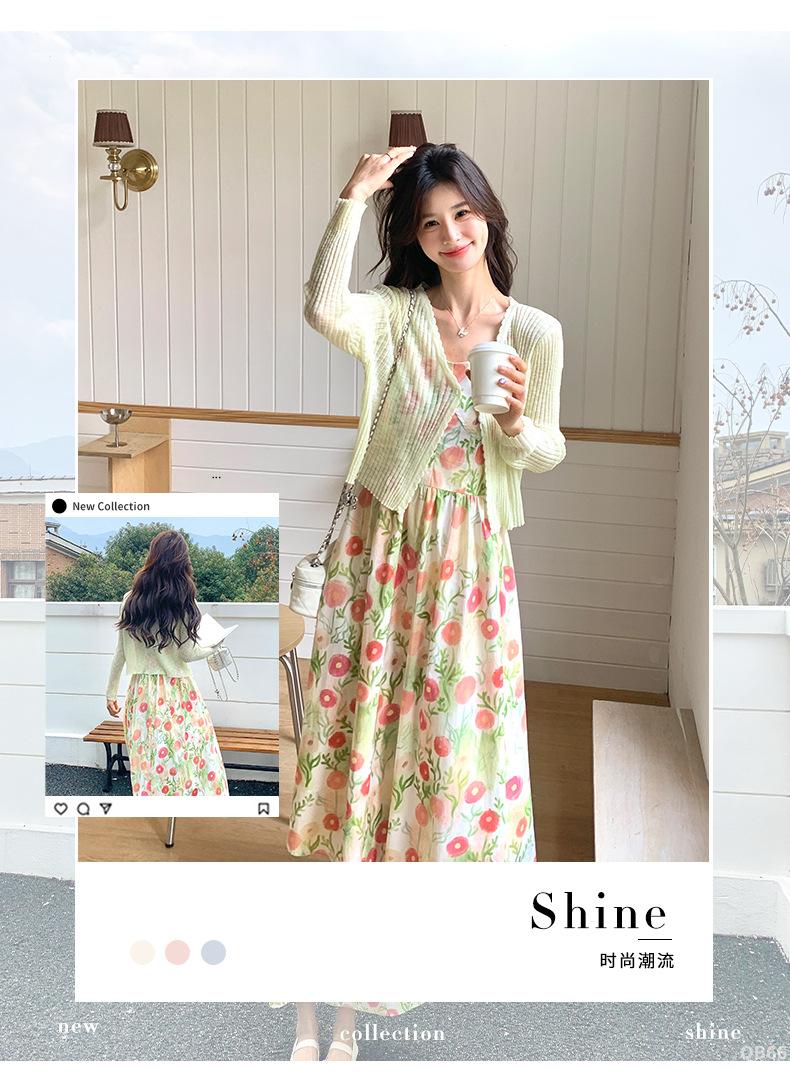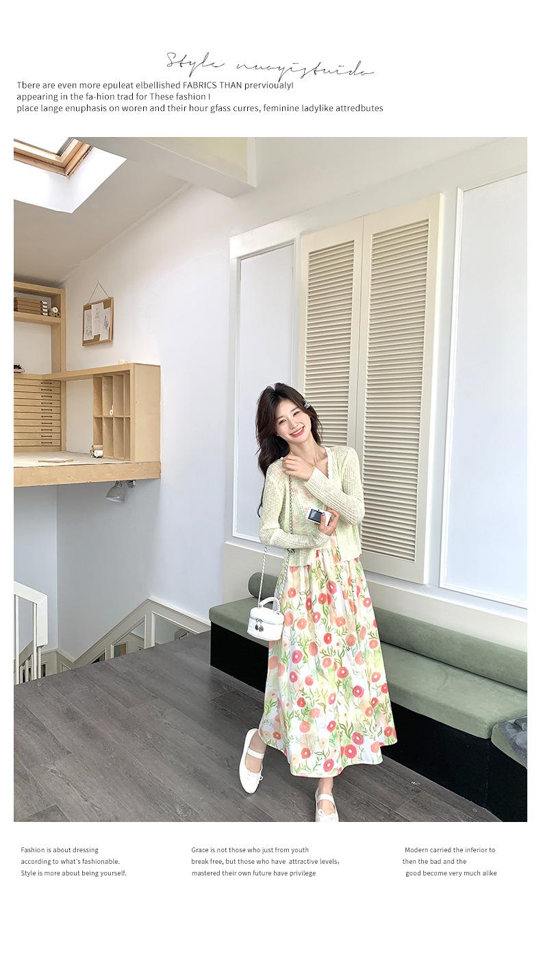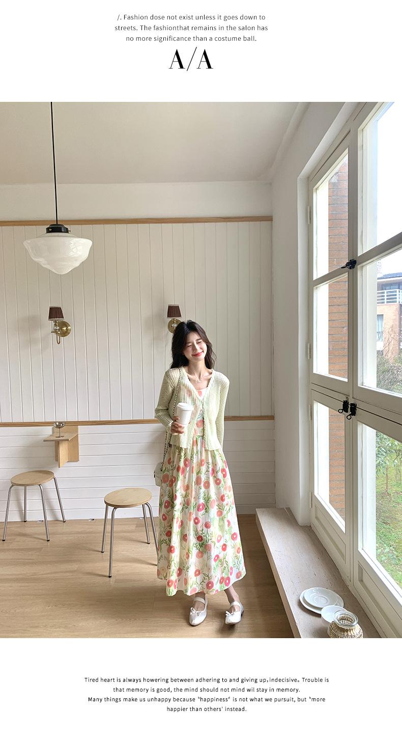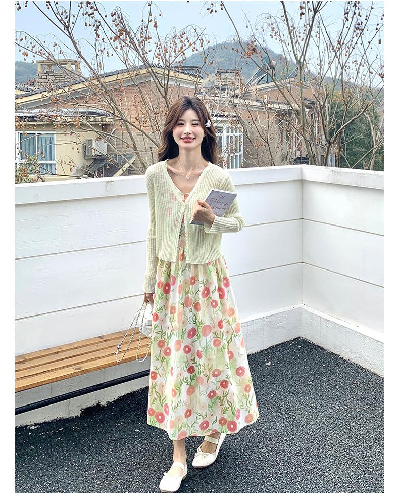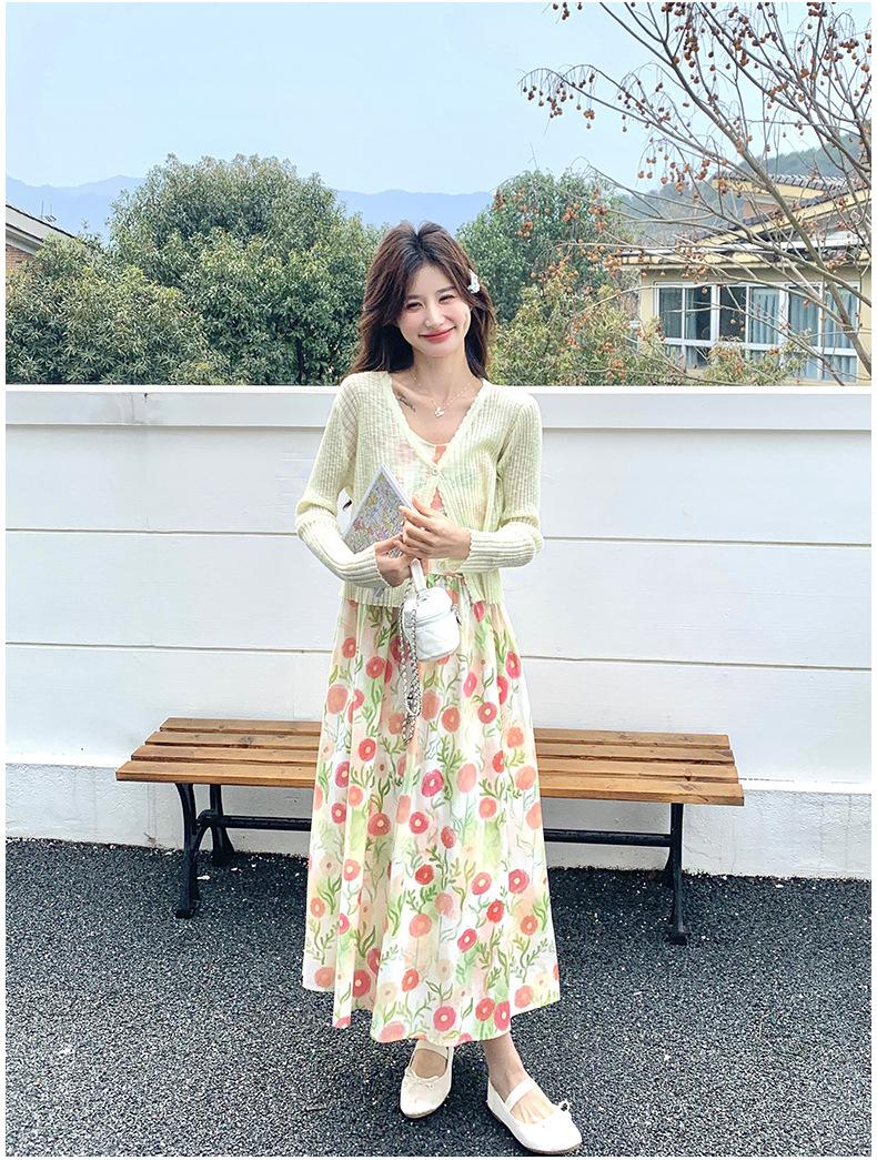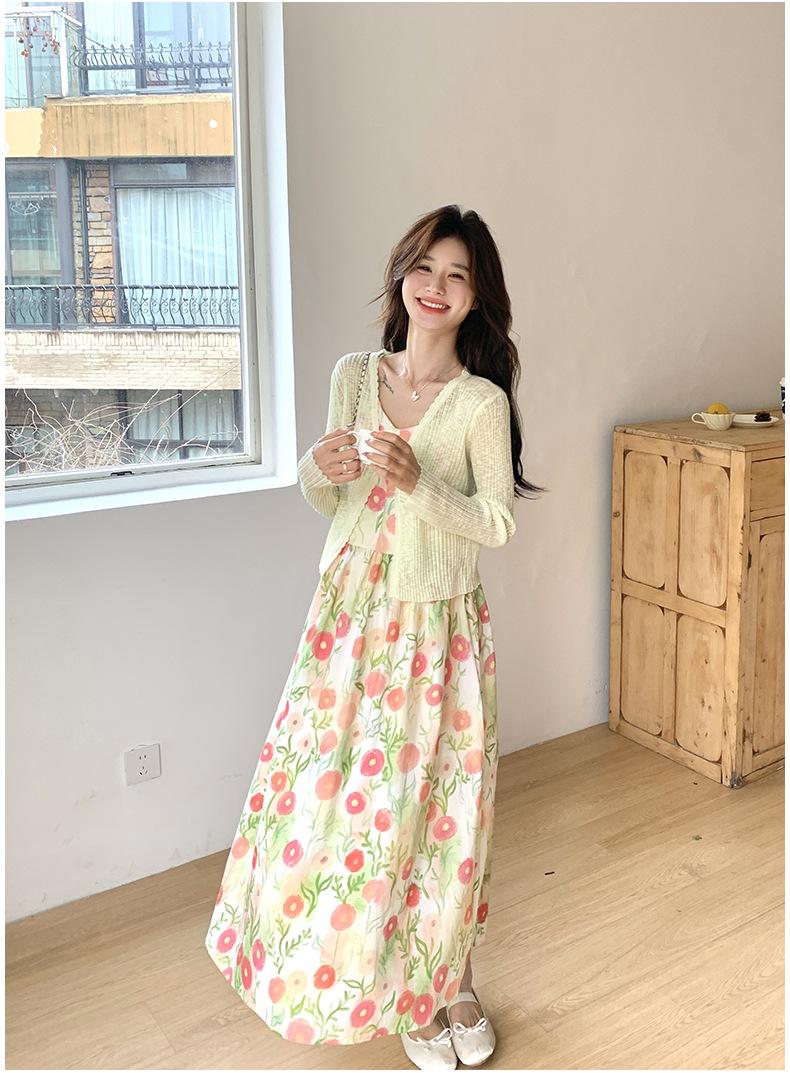 Conjunto de Vestido de Tirantes Florales Franceses Nuevos 2025 para Mujer, Conjunto de Dos Piezas de Cárdigan de Punto de Estilo Suave de Verano Otro