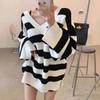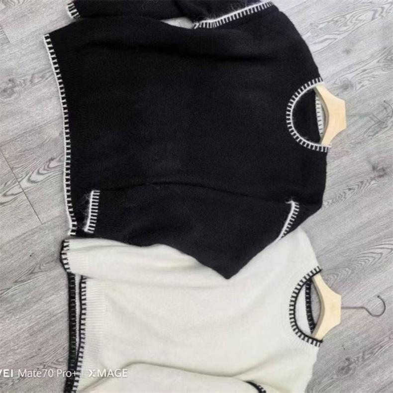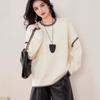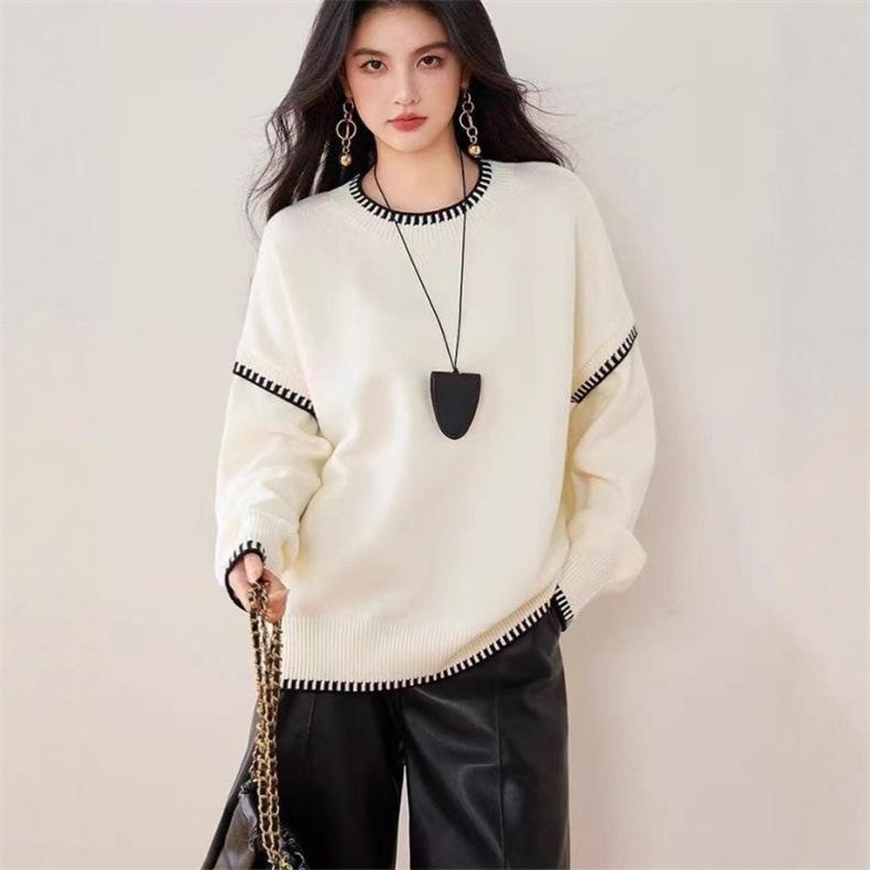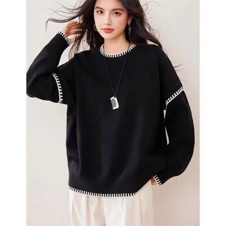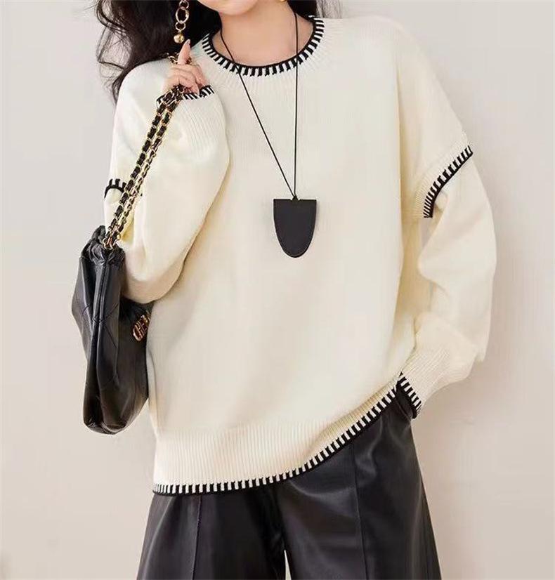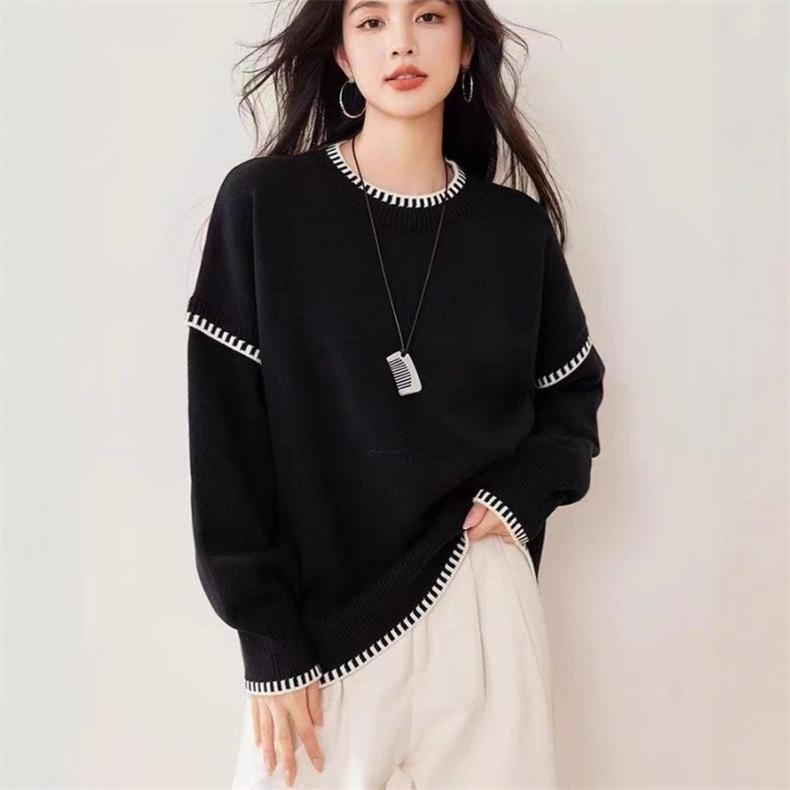 Nuevo Suéter Tejido de Punto de Cuello Redondo con Bloque de Color Blanco y Negro para Otoño/Invierno para Mujer Estilo Coreano Simple Versátil Holgado Ropa de Punto para Mujer