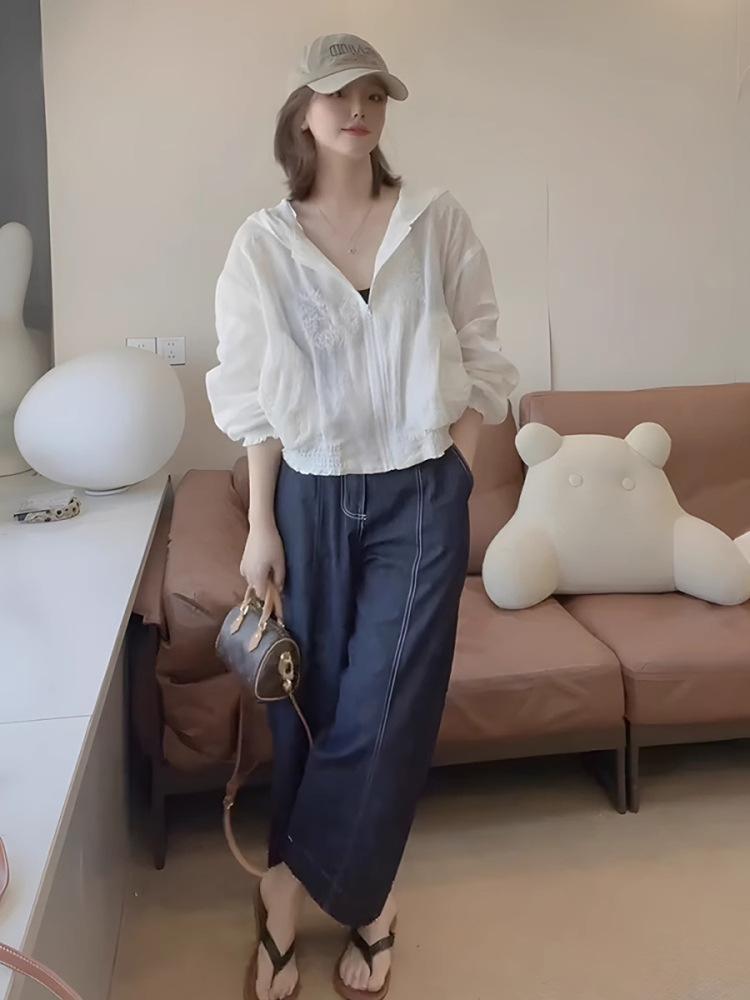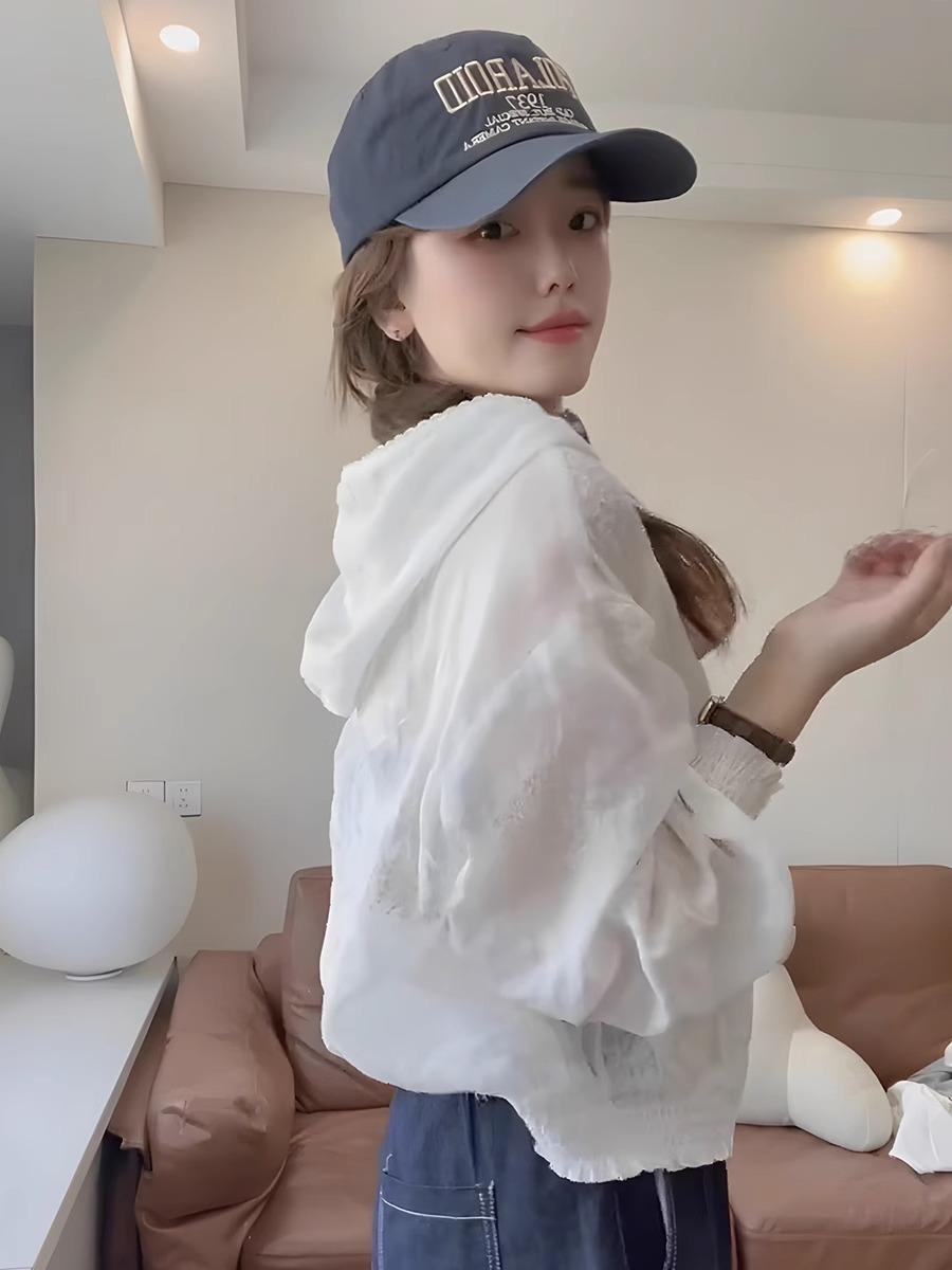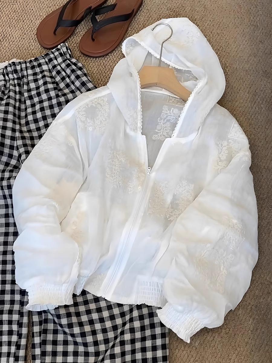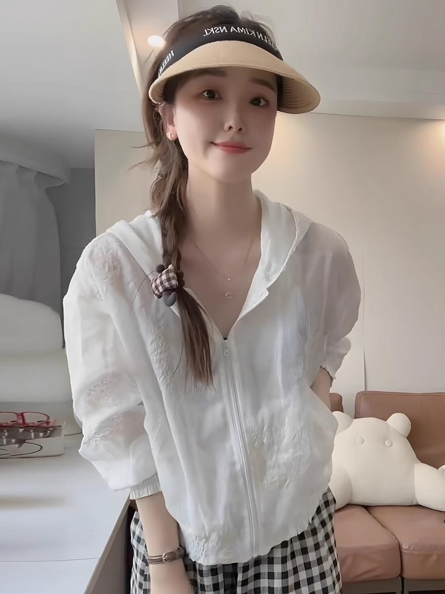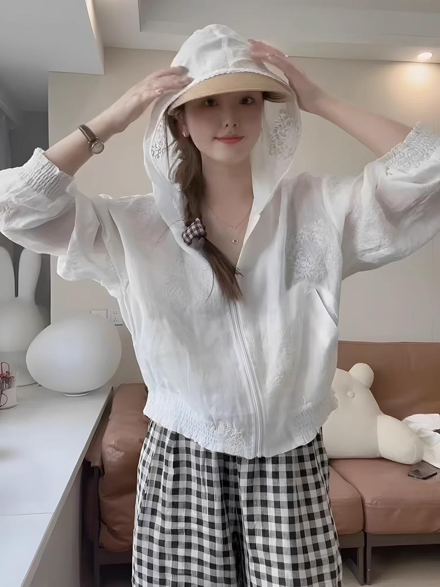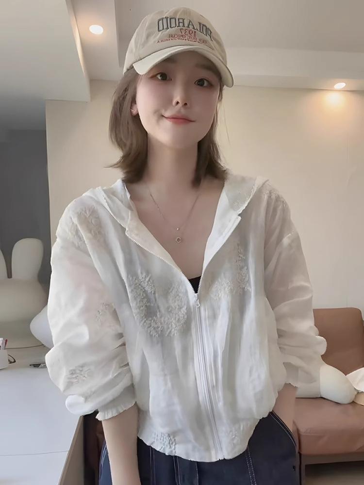 Abrigo Corto con Capucha Bordado Protector Solar para Mujer Delgado 2025 Verano Nueva Llegada Pequeño Casual Suelto Moderno Top