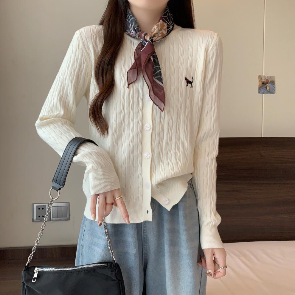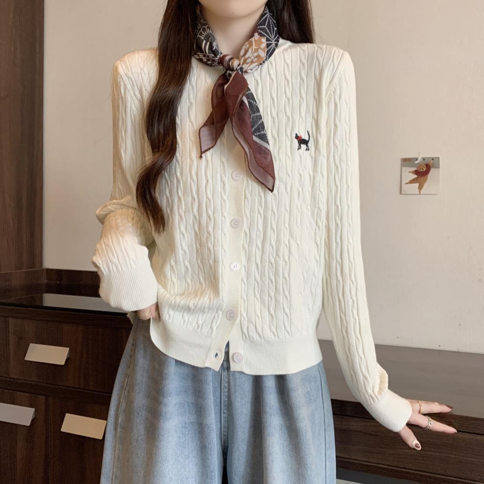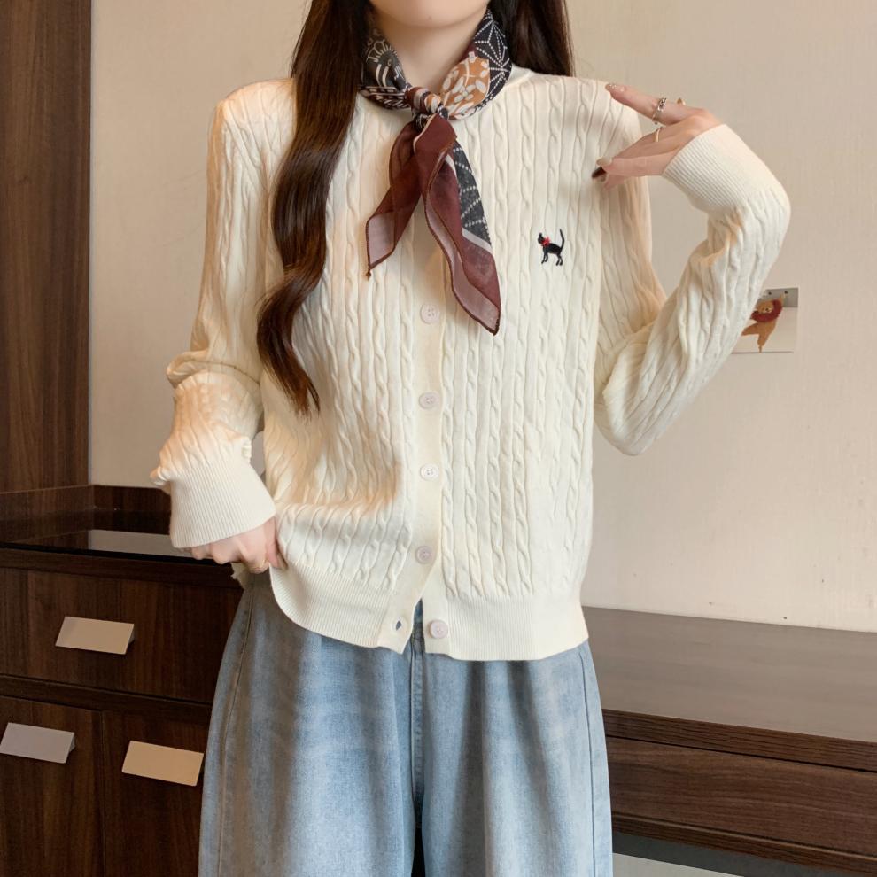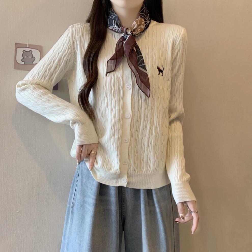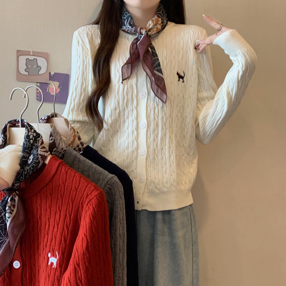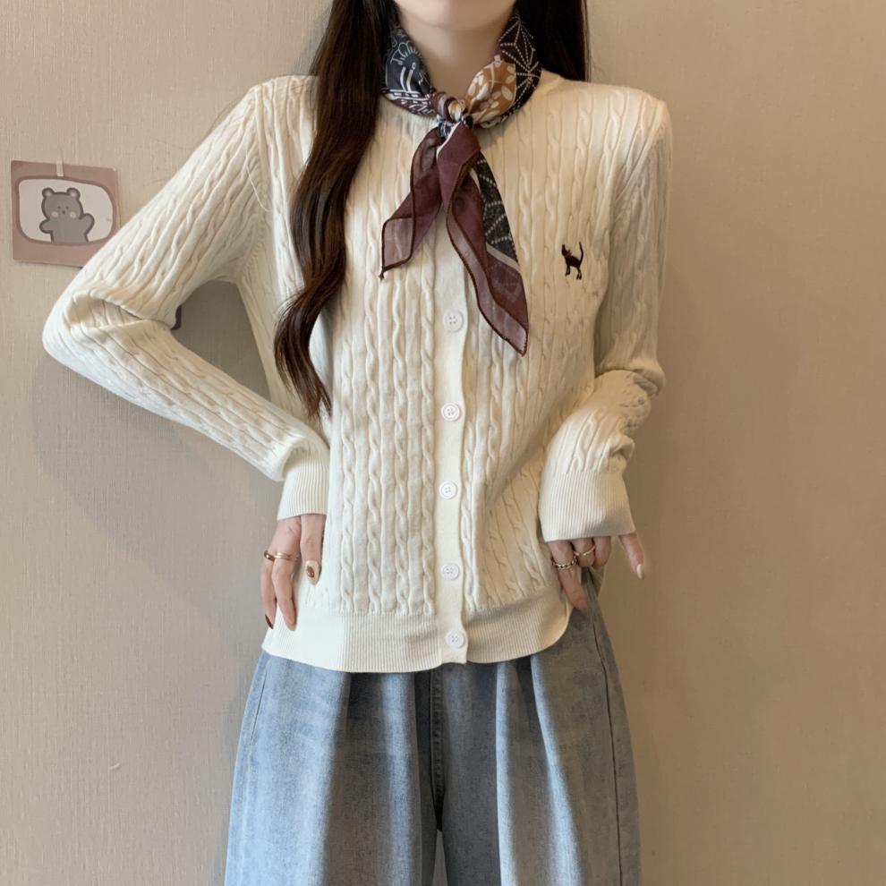 Foto Real de Cárdigan de Punto Trenzado Exquisito Bordado Versátil Casual Elegante de Otoño Talla Grande para Mujer con Bufanda de Seda a la Moda