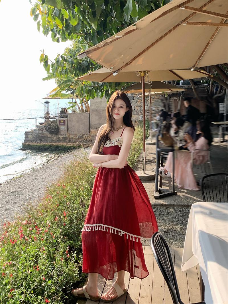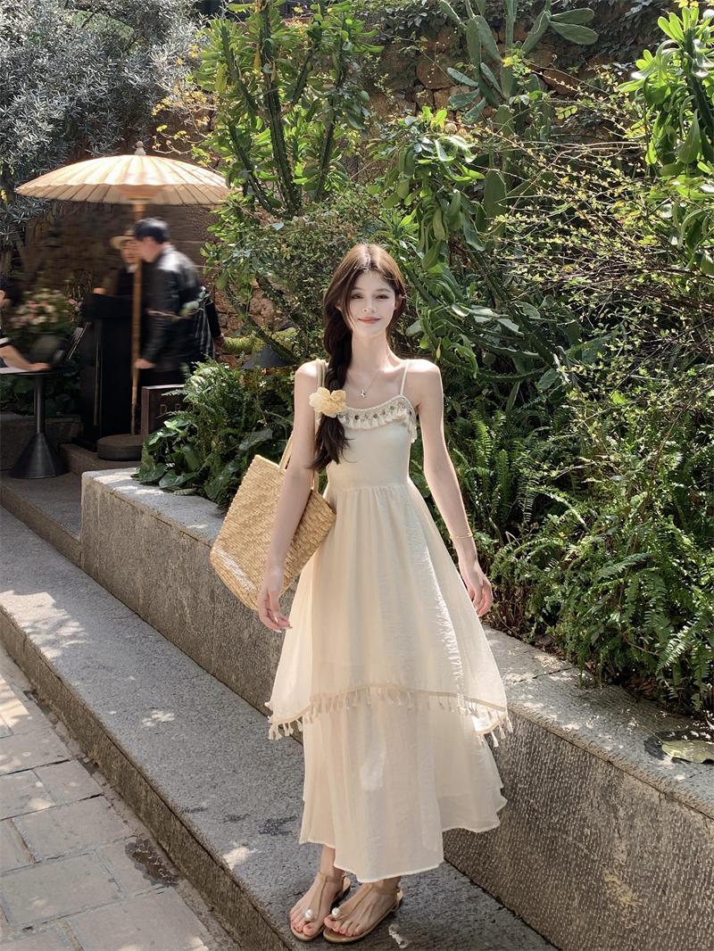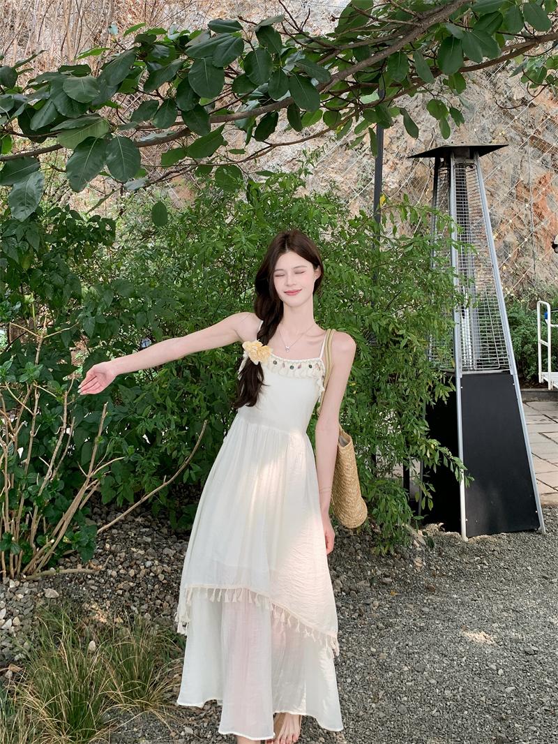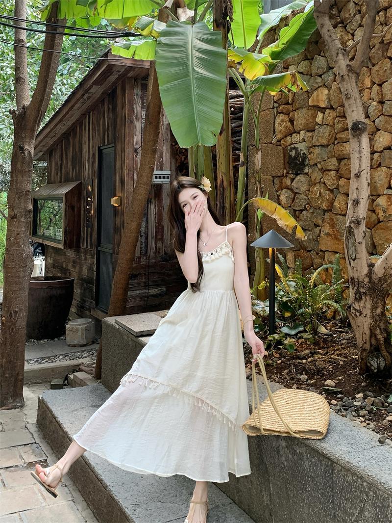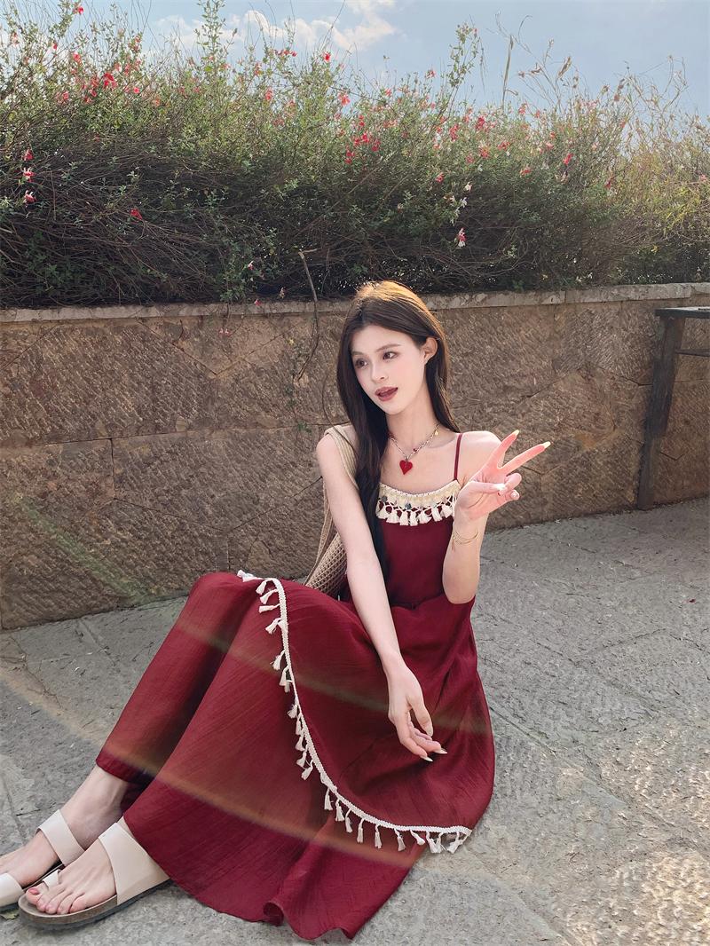 Vestido de Tirantes con Flecos y Empalme Vacaciones en la Playa Verano 2025 Nuevo Diseño Falda Larga Asimétrica