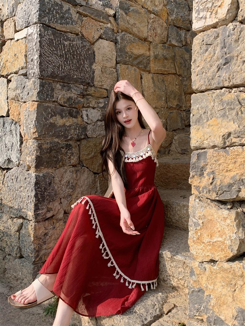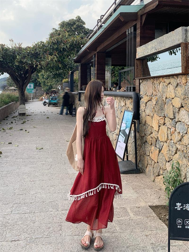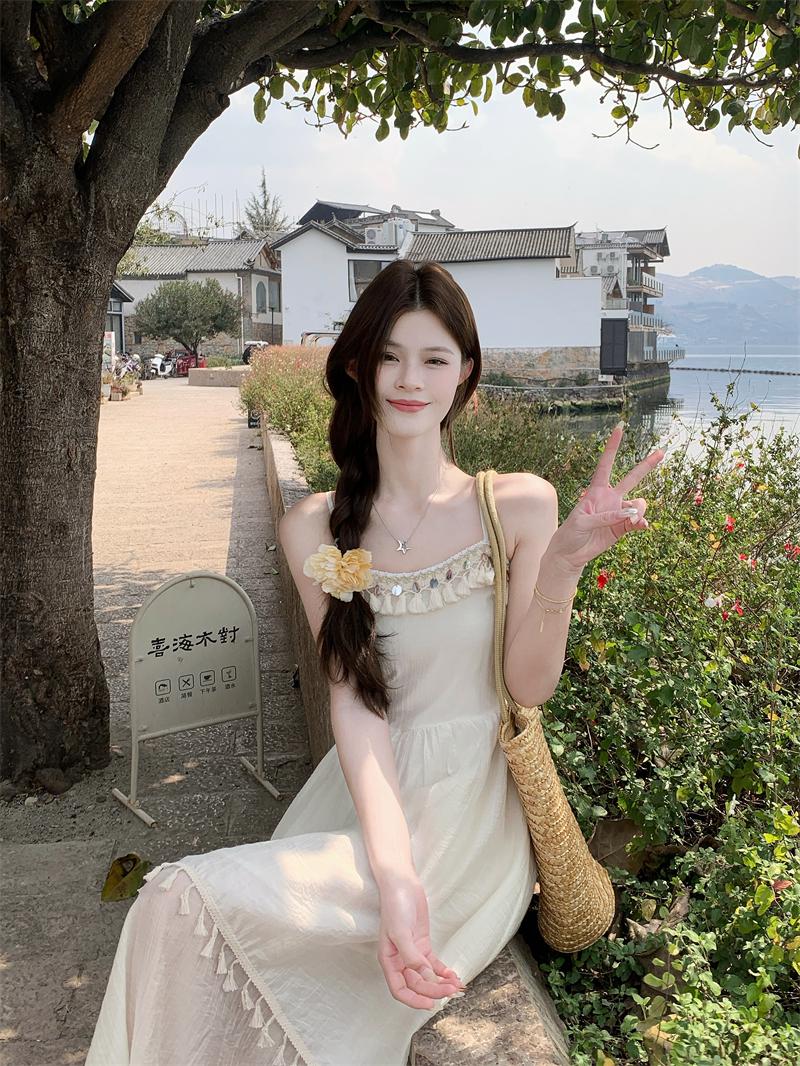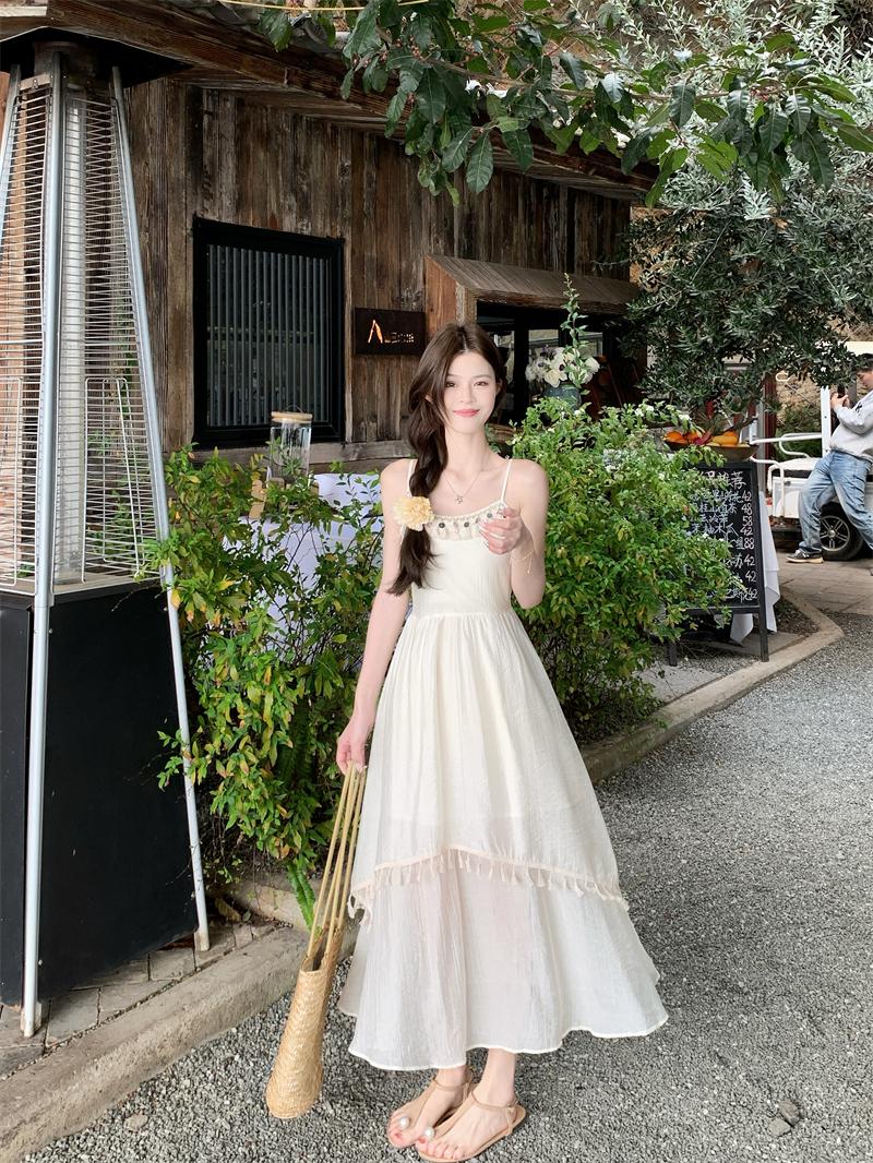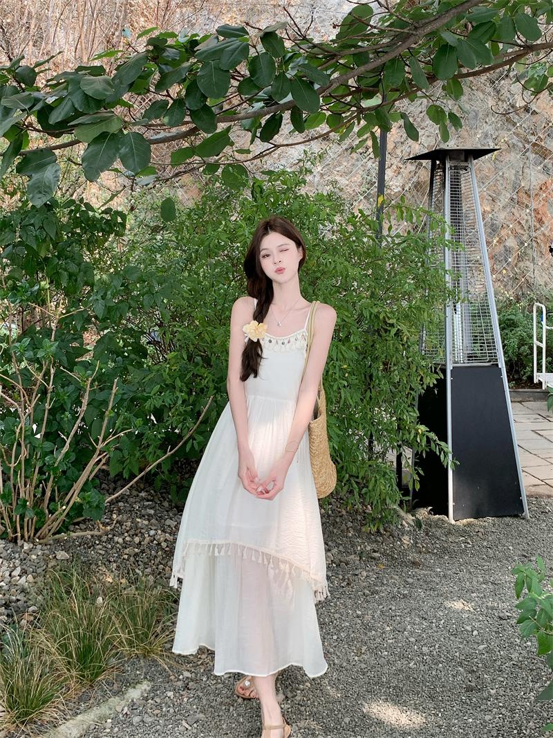 Vestido de Tirantes con Flecos y Empalme Vacaciones en la Playa Verano 2025 Nuevo Diseño Falda Larga Asimétrica