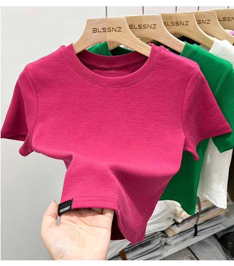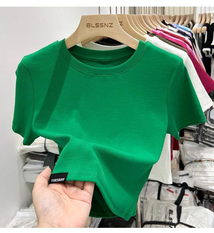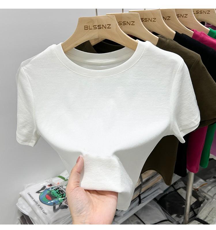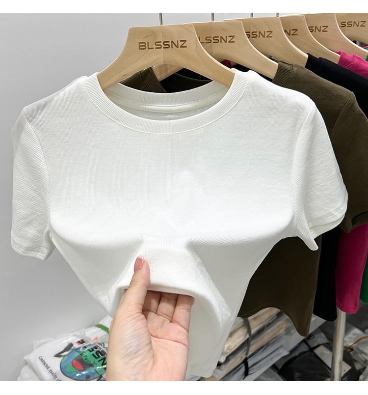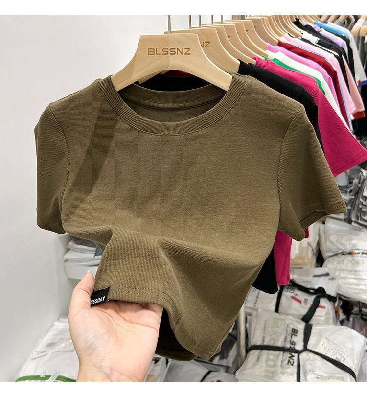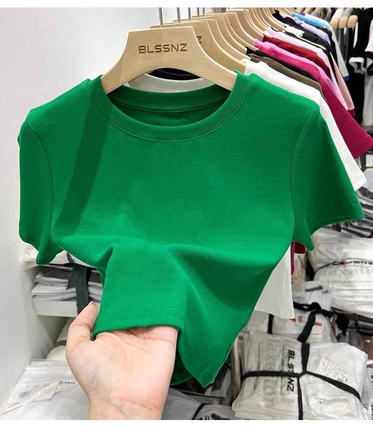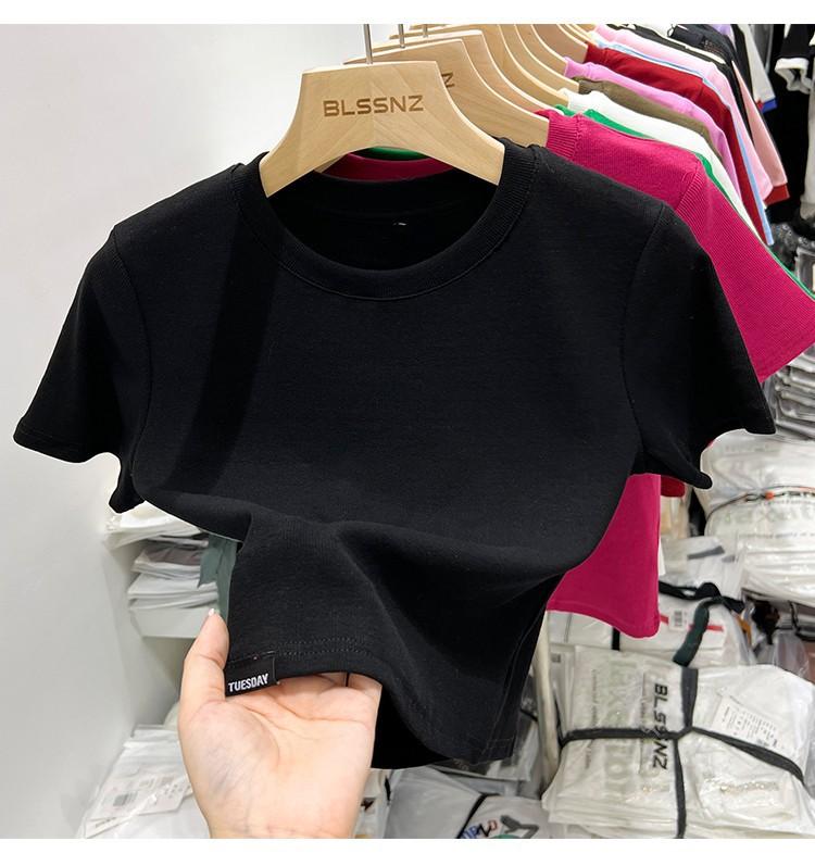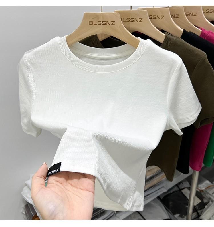 Camiseta Europea de Hombro Derecho Alto-Bajo para Mujer de Manga Corta Verano Aspecto Adelgazante Sexy de Cintura Alta para Usar Debajo Top de Color Puro