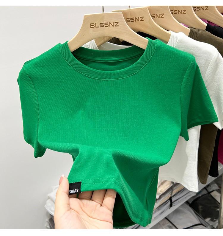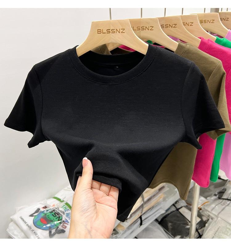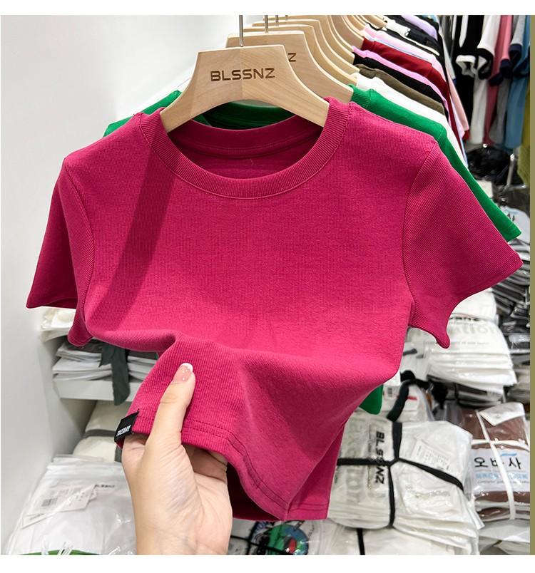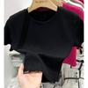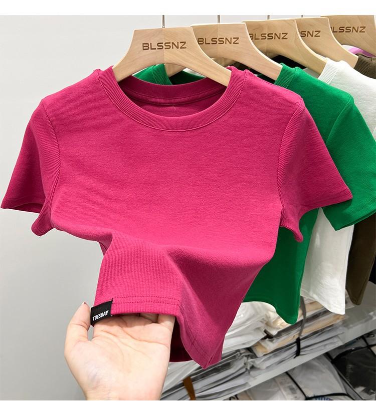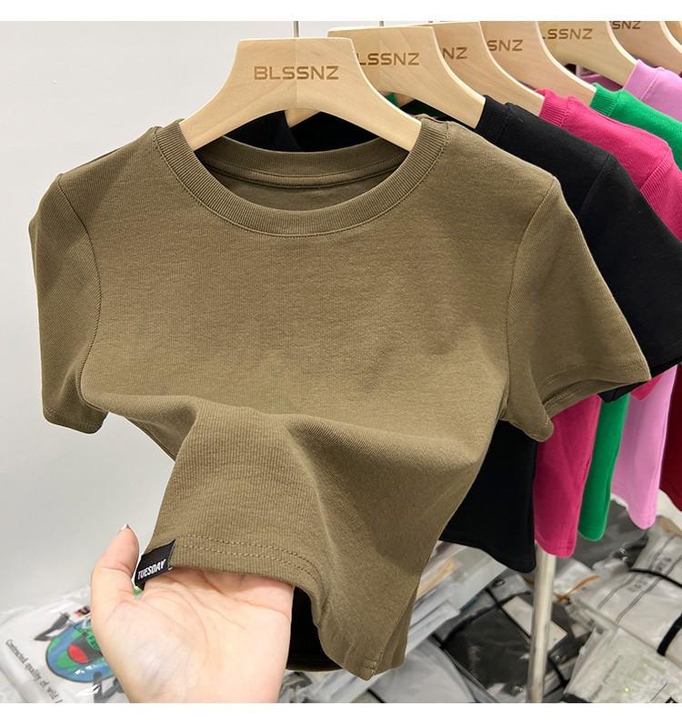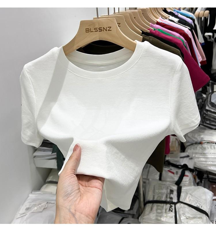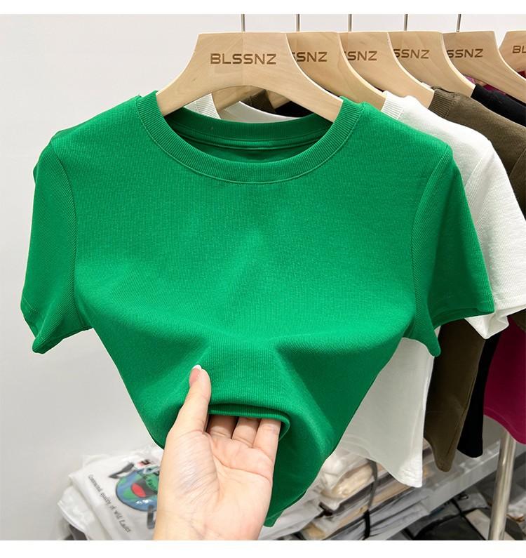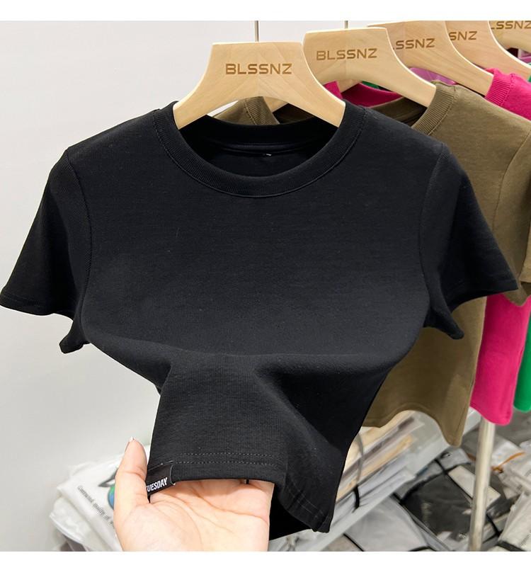 Camiseta Europea de Hombro Derecho Alto-Bajo para Mujer de Manga Corta Verano Aspecto Adelgazante Sexy de Cintura Alta para Usar Debajo Top de Color Puro