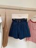 Shorts de mezclilla plisados azul oscuro para mujer 2025 verano delgados nuevos de cintura alta holgados con efecto adelgazante línea A de pierna ancha pantalones cortos