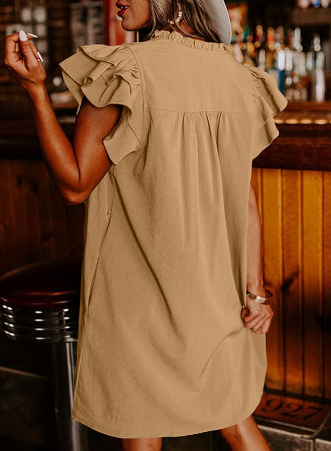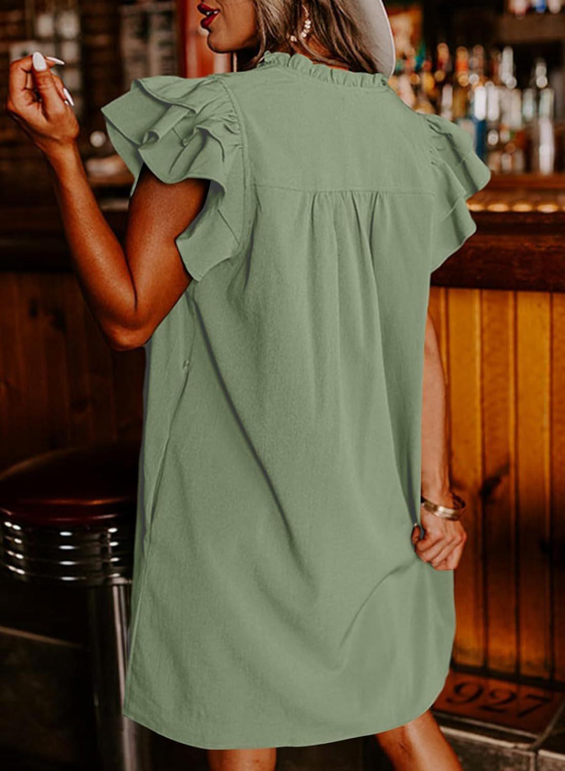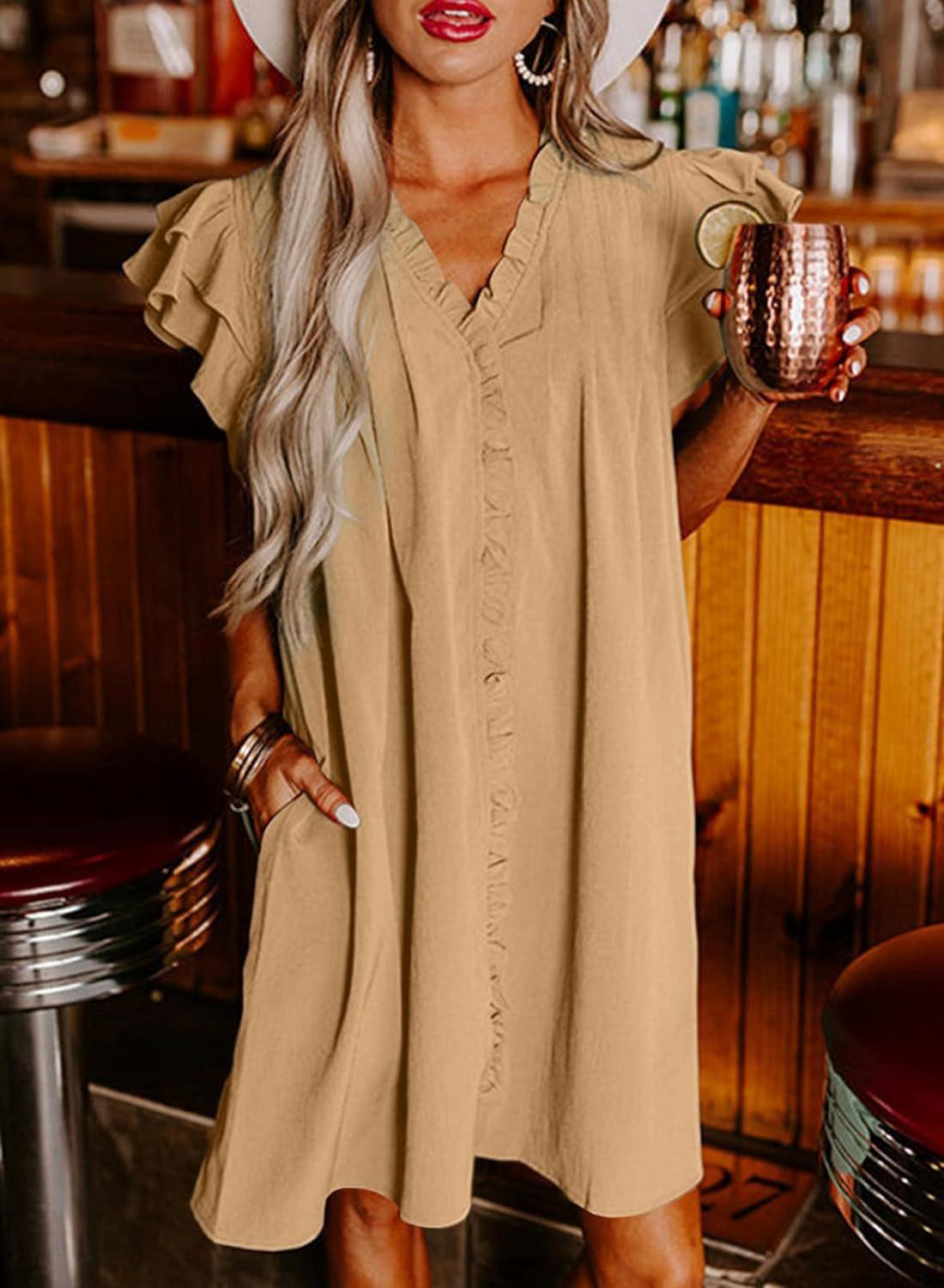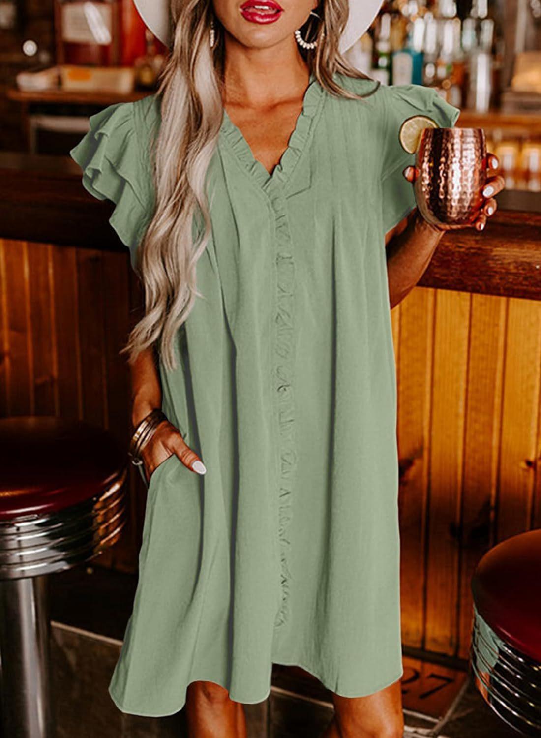 Vestido de Moda Europea y Americana con Cuello en V y Mangas Cortas con Volantes para Mujer 2024 Verano Nuevo Color Puro Suelto Recto Falda Corta para Mujer