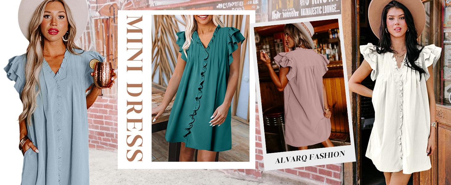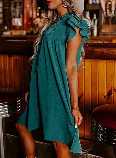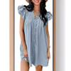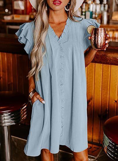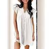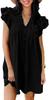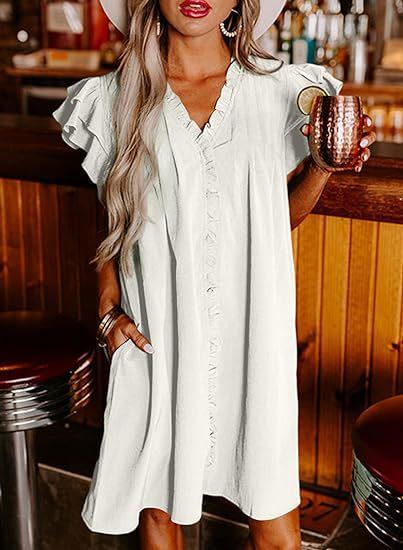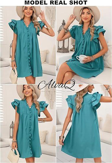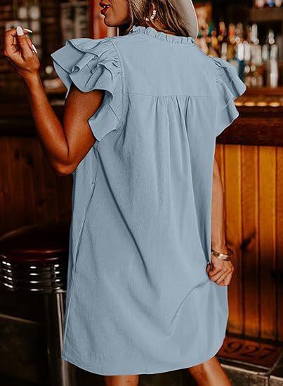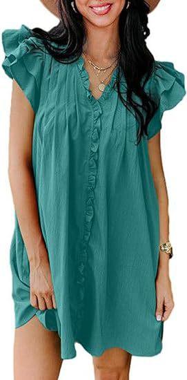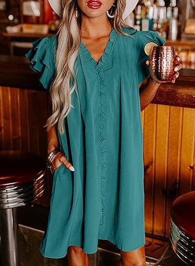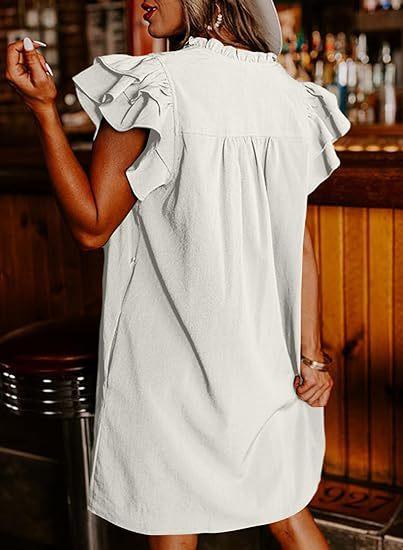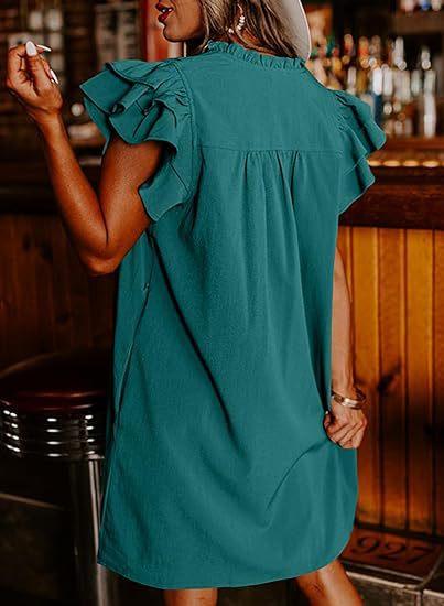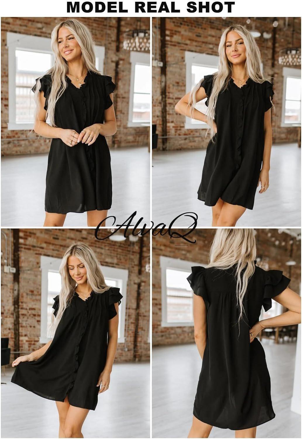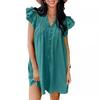 Vestido de Moda Europea y Americana con Cuello en V y Mangas Cortas con Volantes para Mujer 2024 Verano Nuevo Color Puro Suelto Recto Falda Corta para Mujer