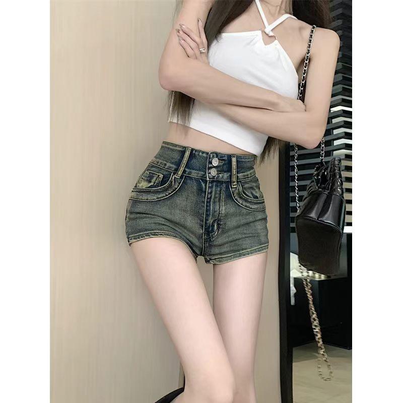 Shorts de Mezclilla Retro Americanos Dulces y Picantes para Mujer en Verano, Chicas Calientes de Cintura Alta Ajustados con Aspecto Adelgazante, Desgastados, Línea A, Pantalones Cortos de Moda