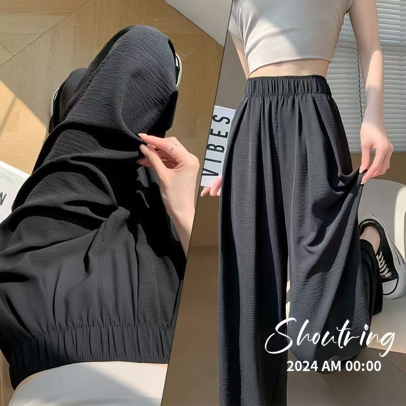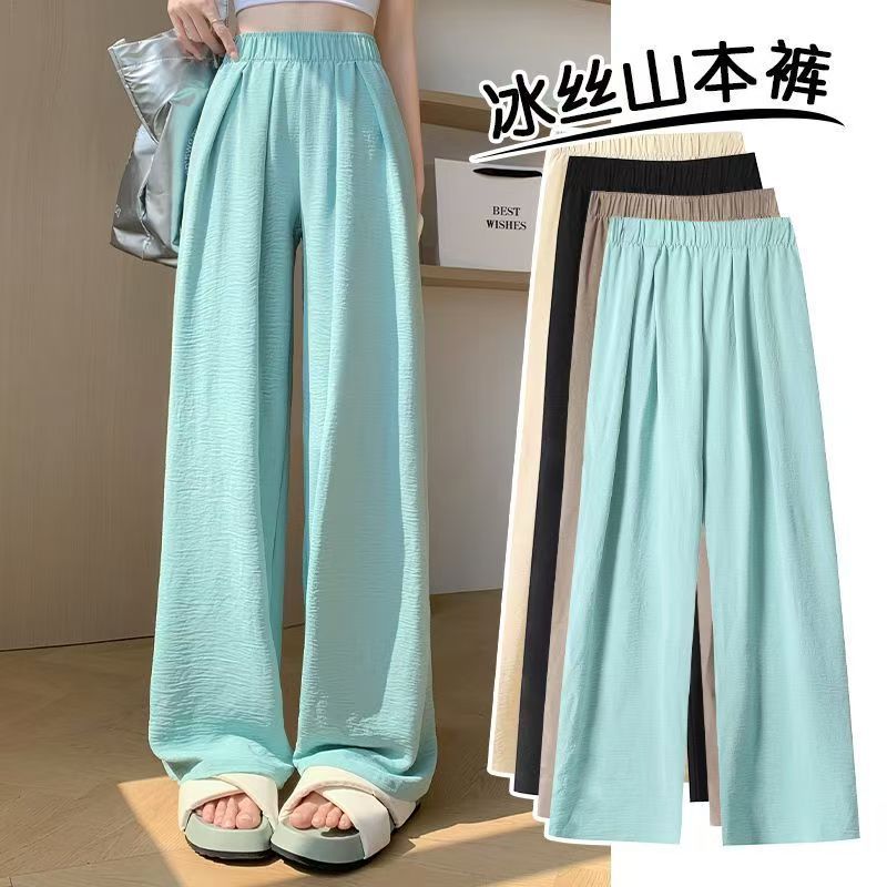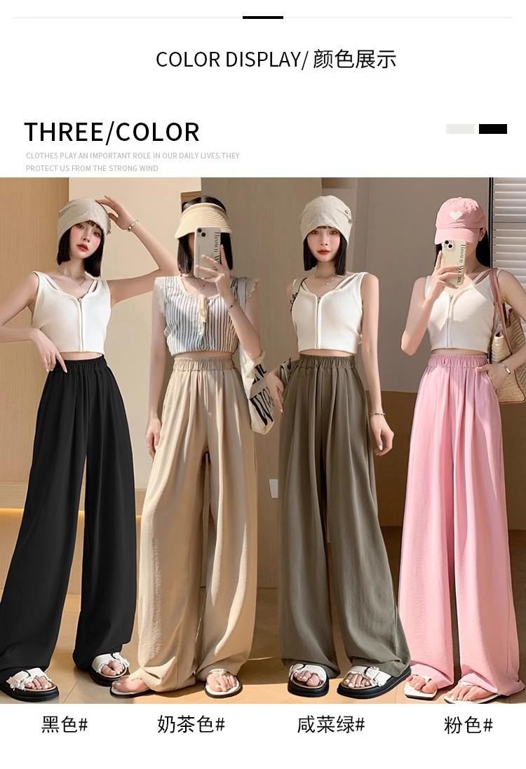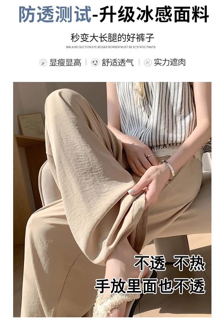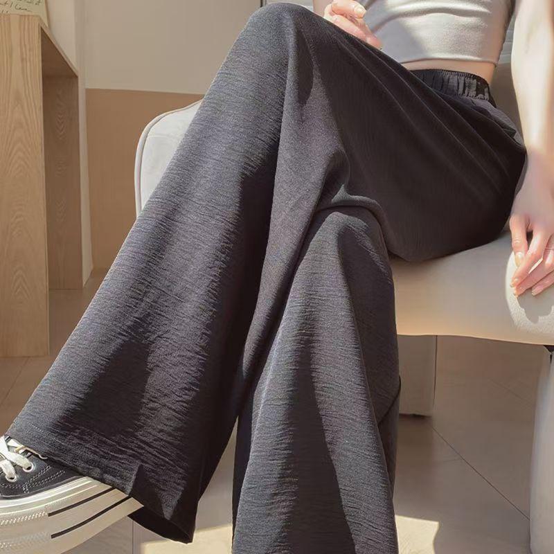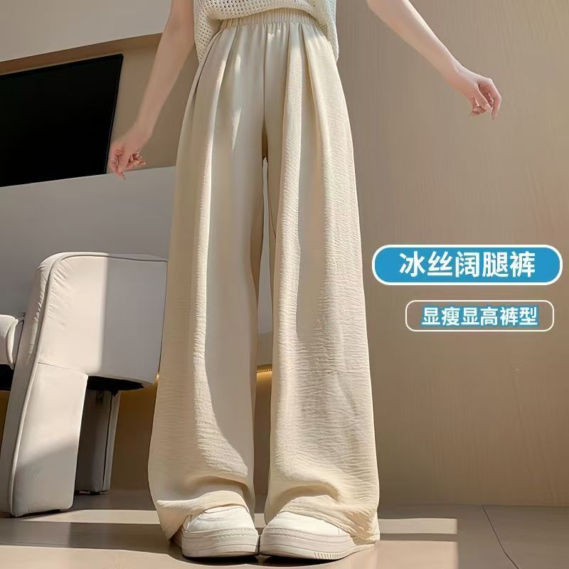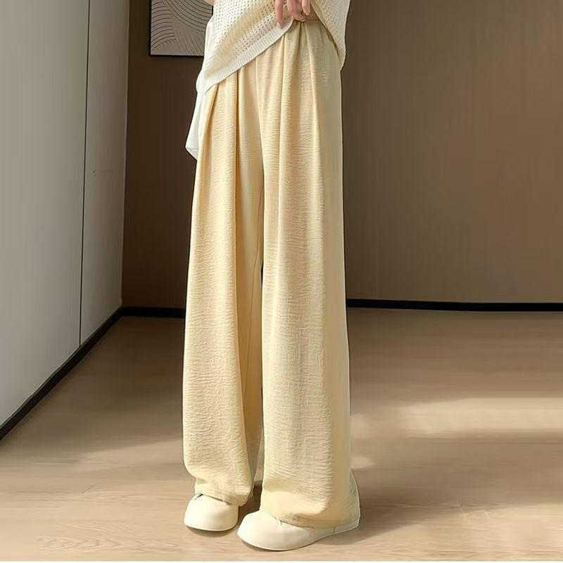 Diseño de Seda de Hielo Pantalones Casuales Plisados 2024 Verano Nuevo Estilo Pierna Larga Diseño Cintura Alta Color Sólido Casual