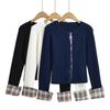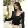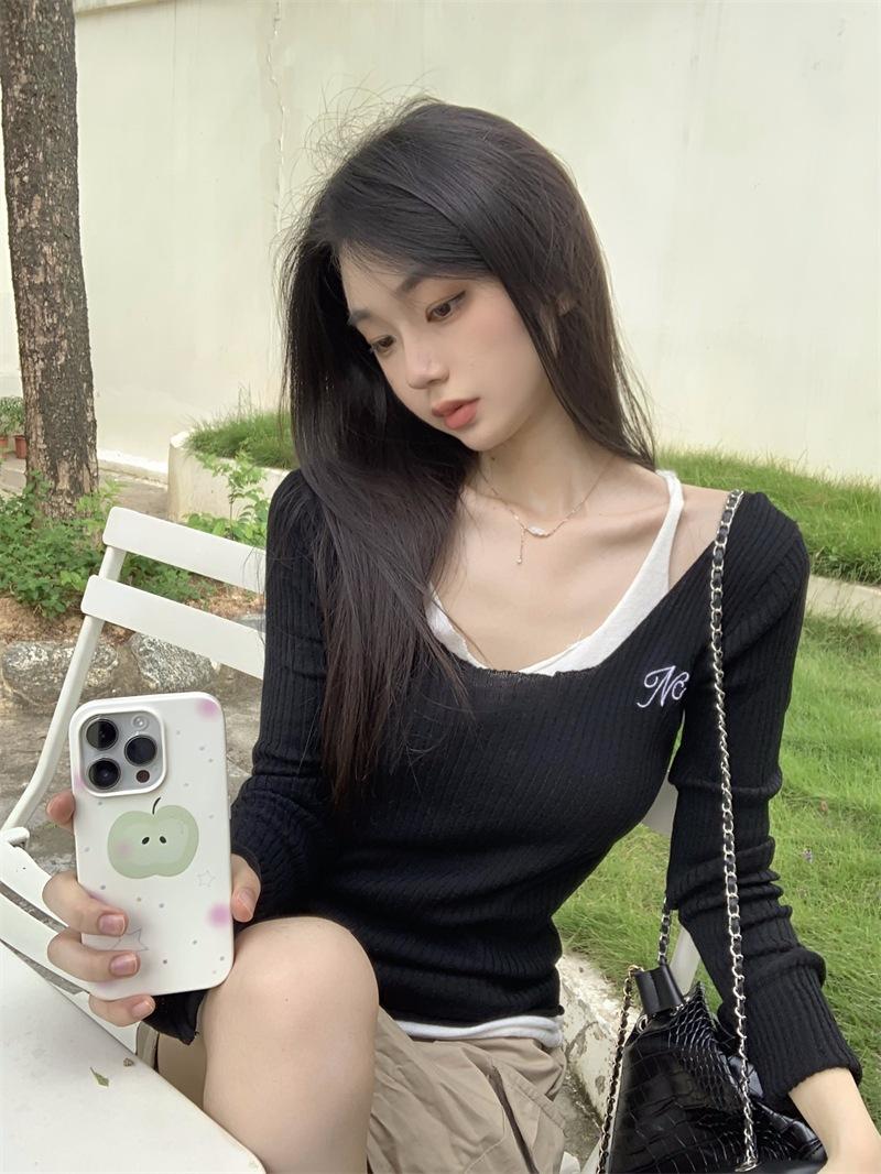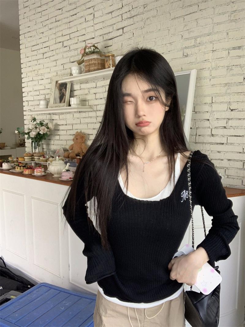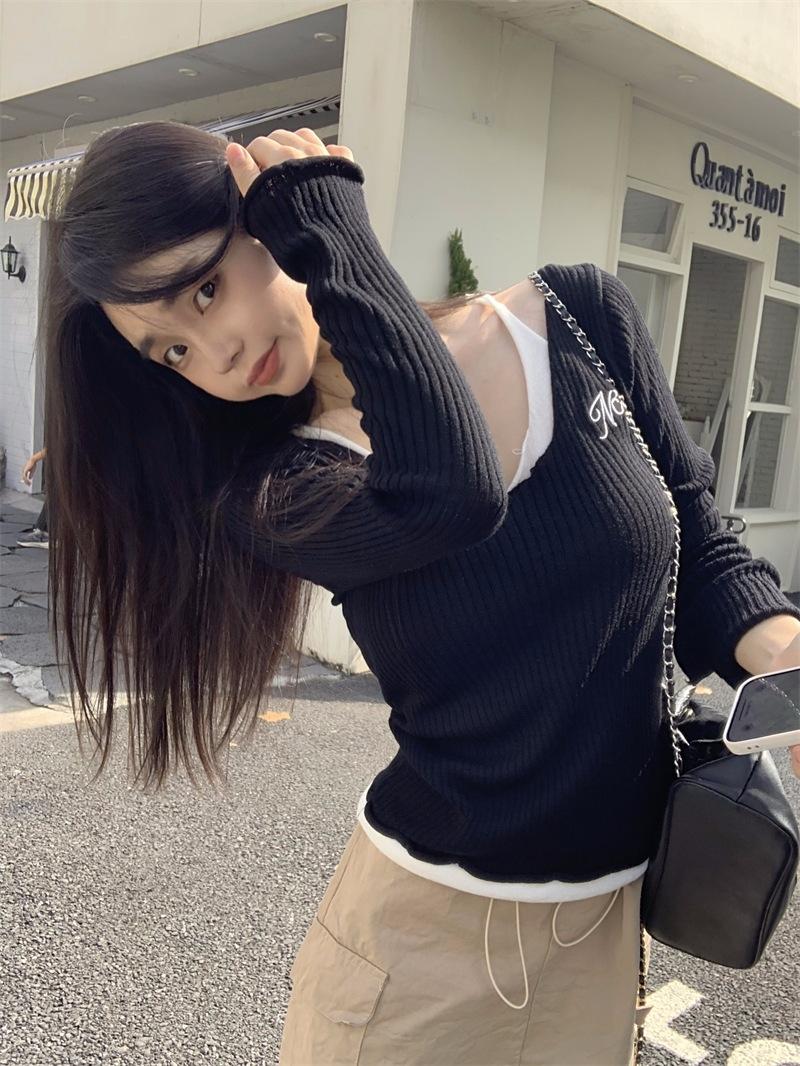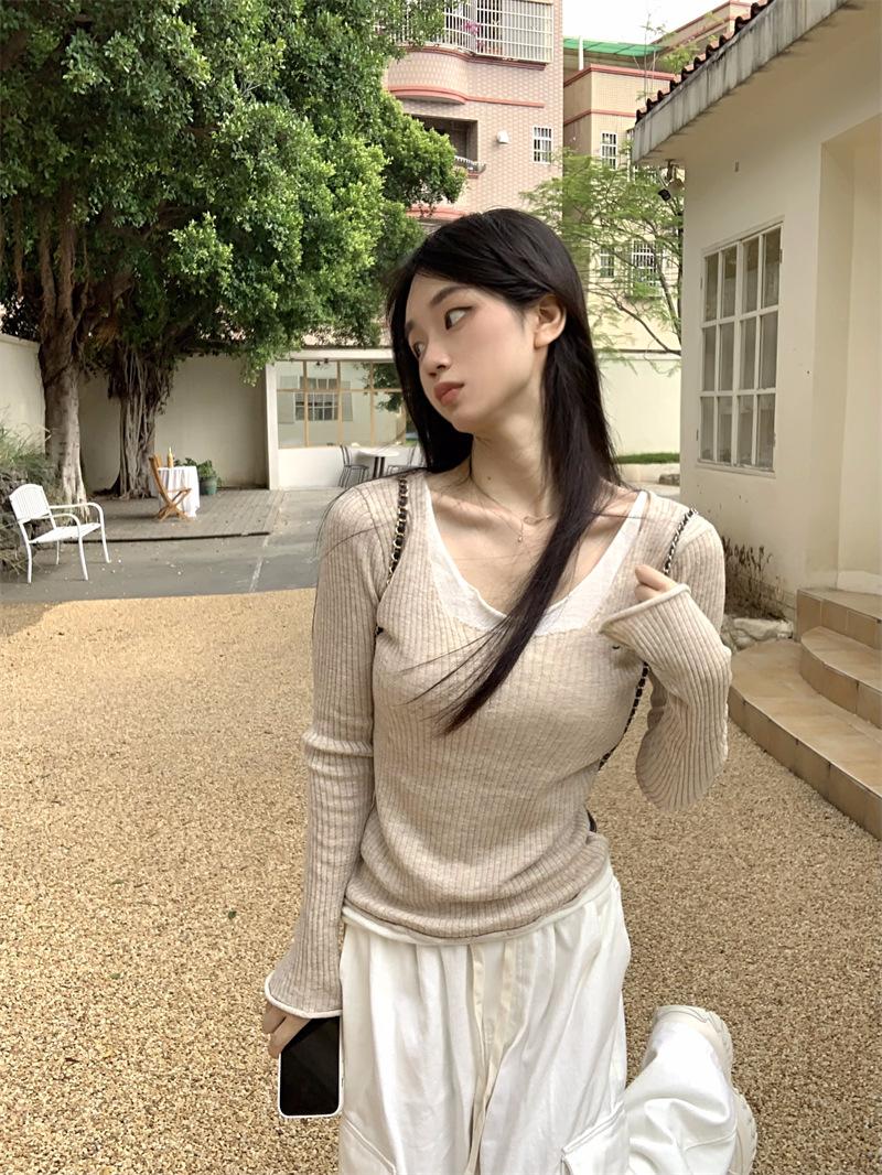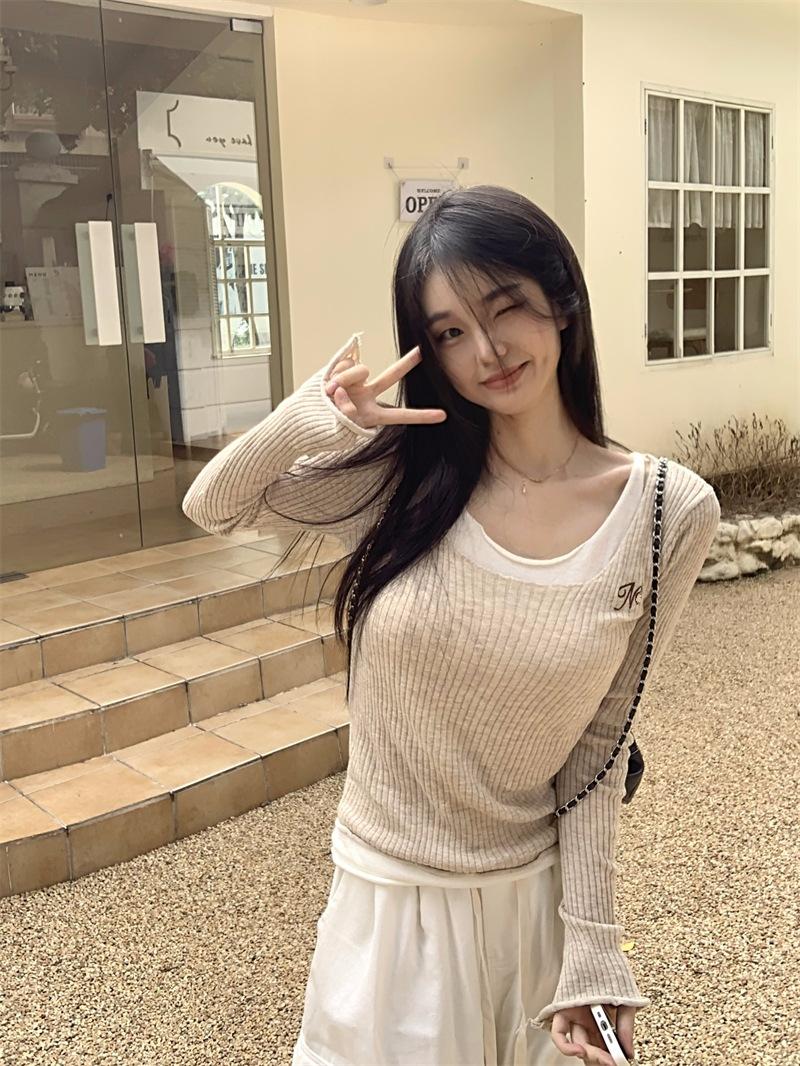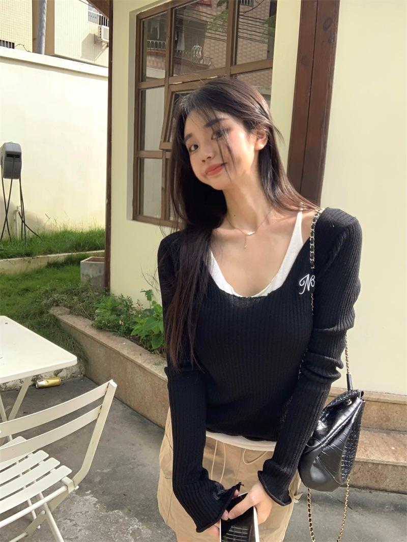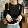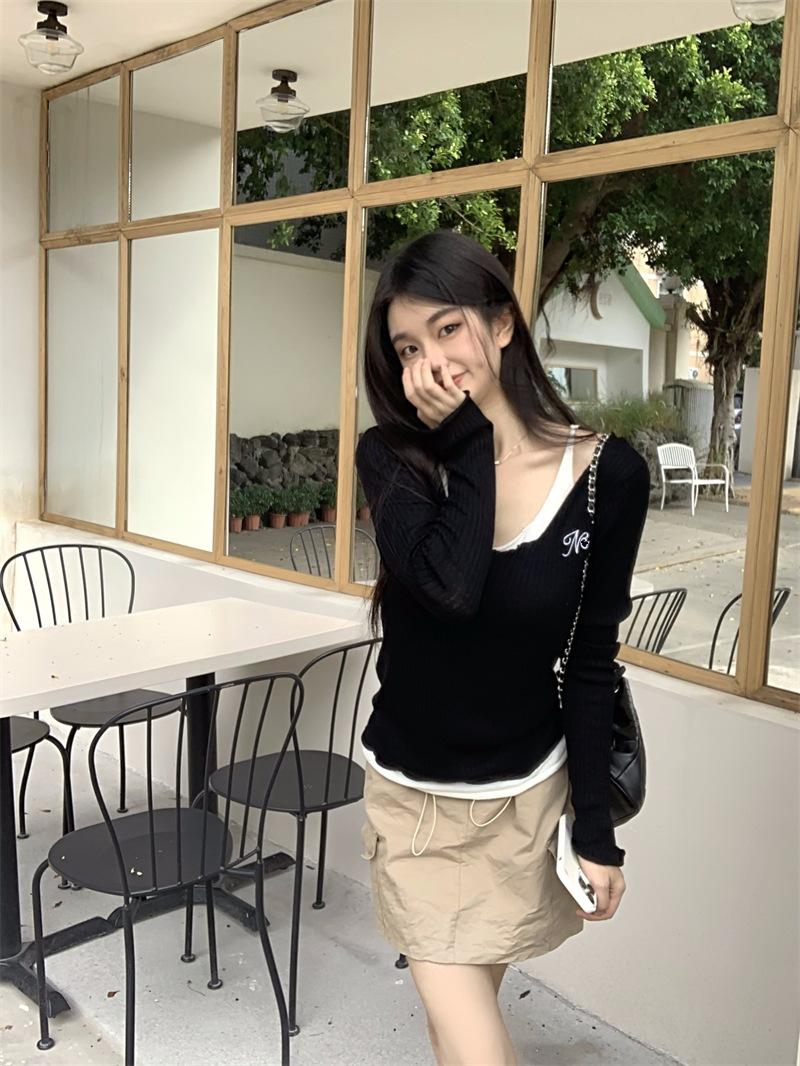 Tejido de punto de cuello halter de manga larga de dos piezas falsas para mujer en otoño Estilo coreano Chic Camiseta básica con empalme de color contrastante Top exterior Imitación algodón