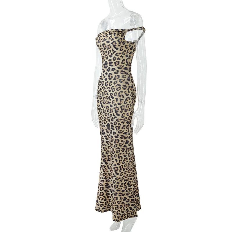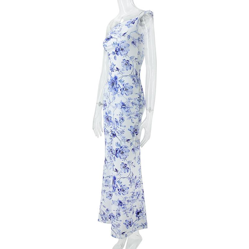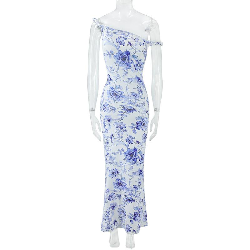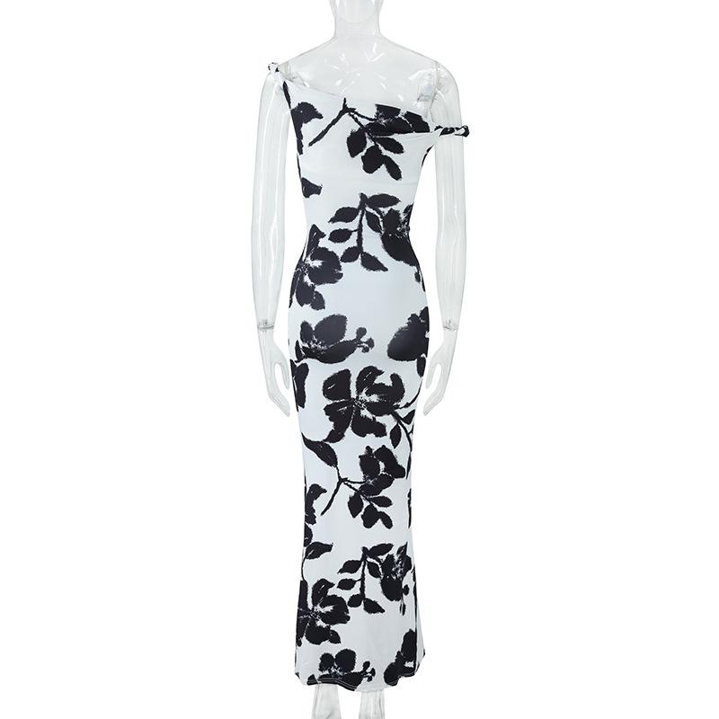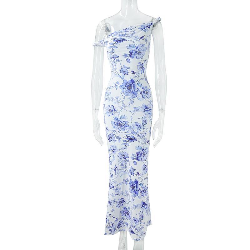 Estilo Europeo y Americano Verano 2025 Exportación Transfronteriza Vestido Sexy Nicho de Hombro Oblicuo Fruncido Ajustado a la Cadera Estampado