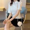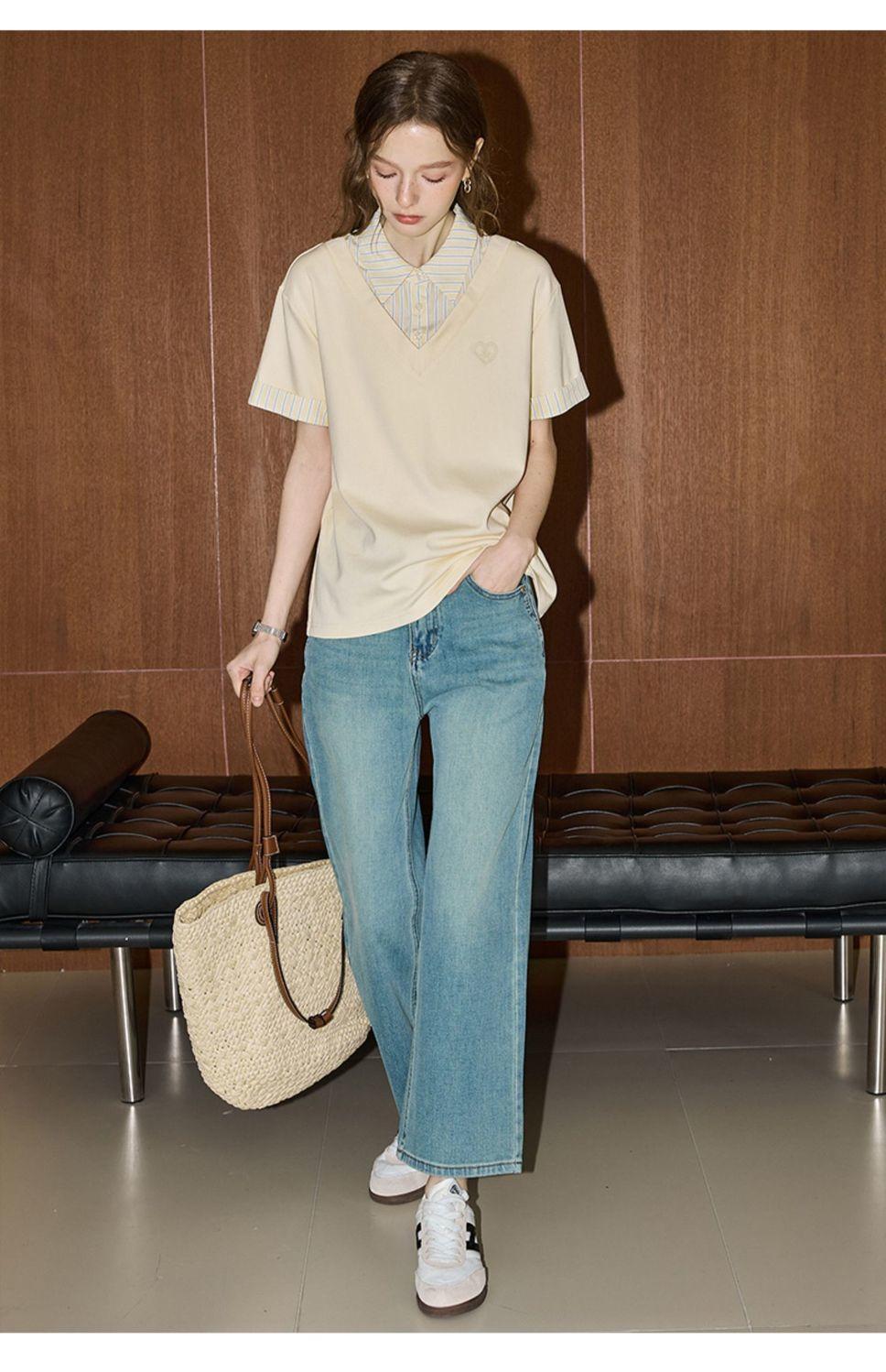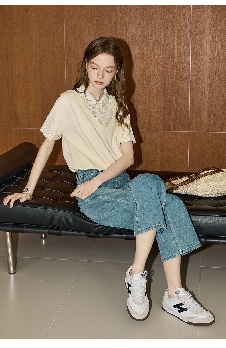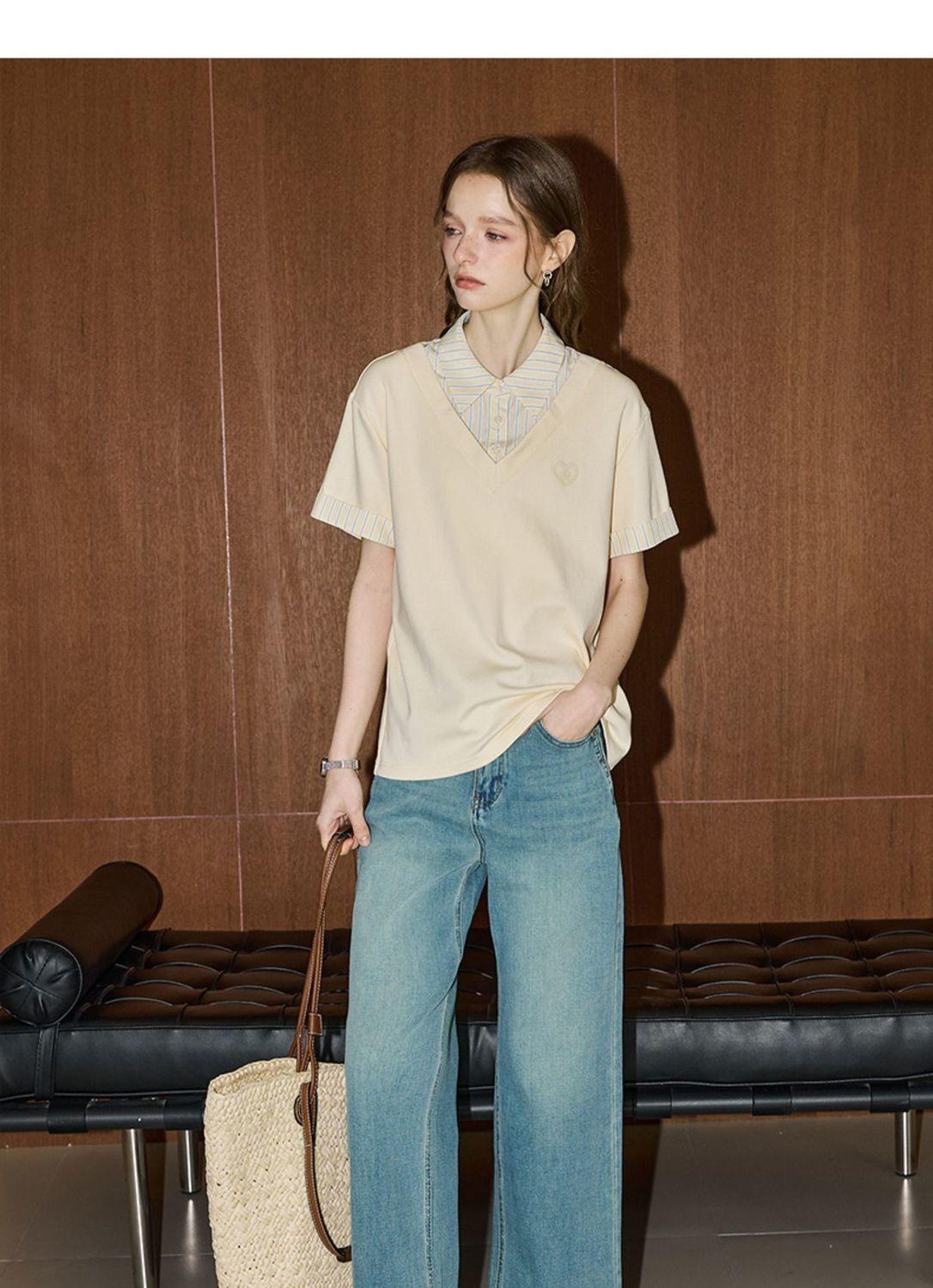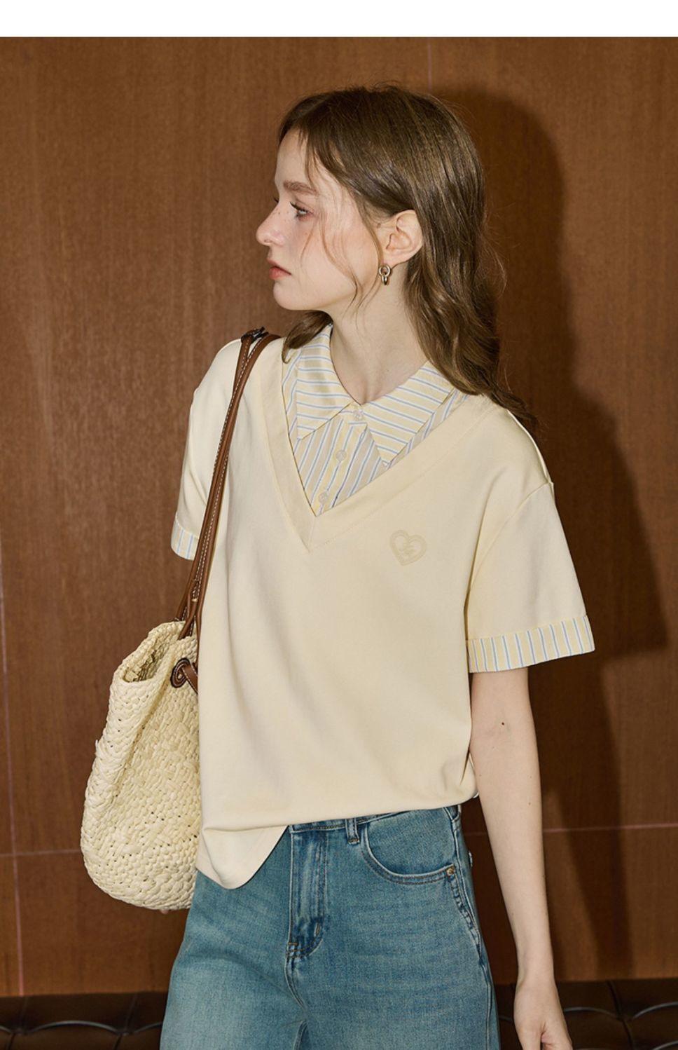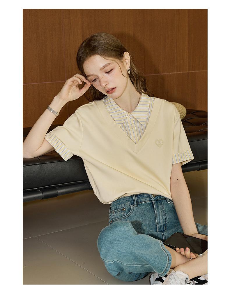 Playera Juvenil de Manga Corta para Mujer 2025 Verano Nuevo Diseño Nicho Falso Dos Piezas Empalmado Top