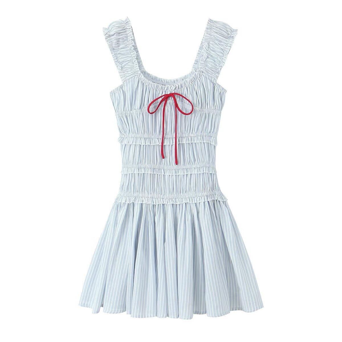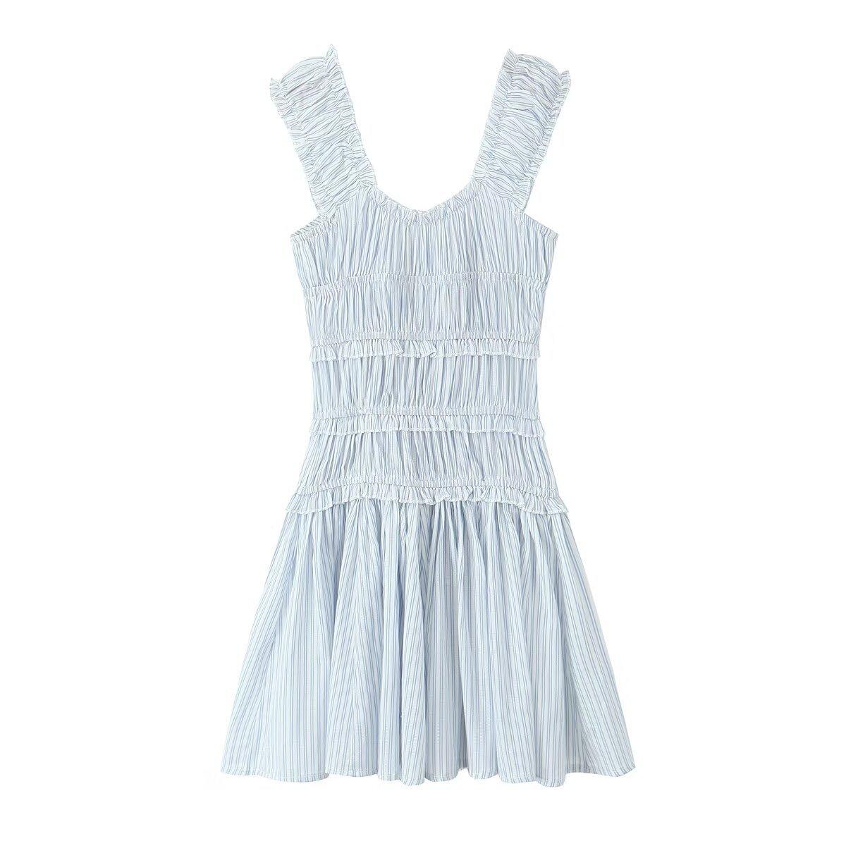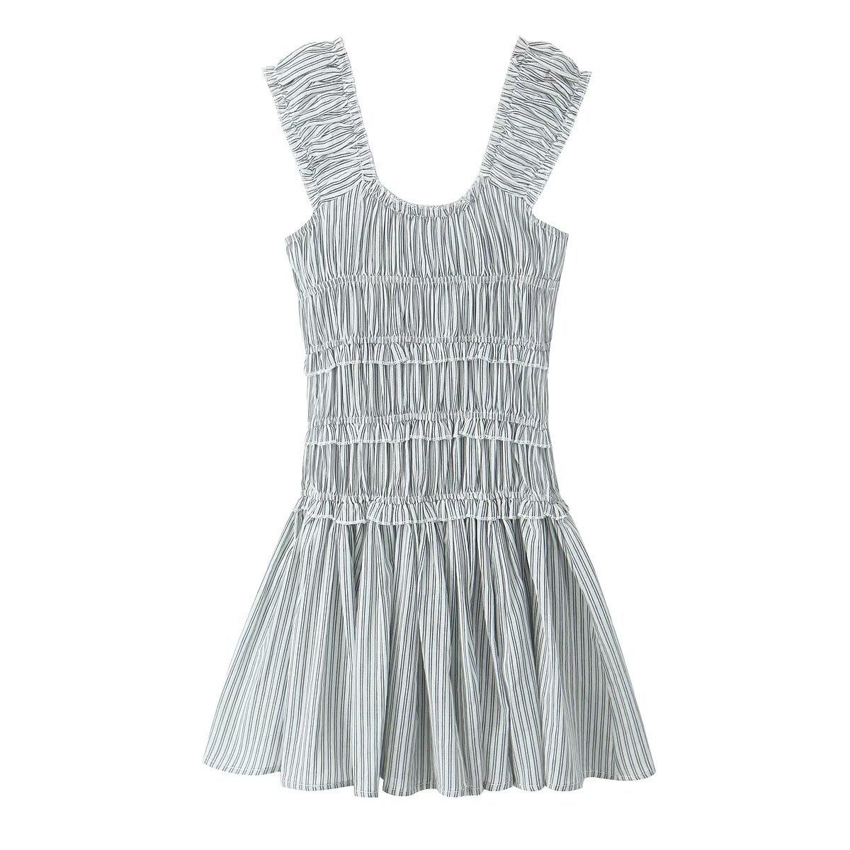 Ropa de Mujer Verano 2024 Nuevo Estilo Europeo y Americano Simple Estilo Francés Arrugado Rayado Hombro Chica Caliente Vestido Corto