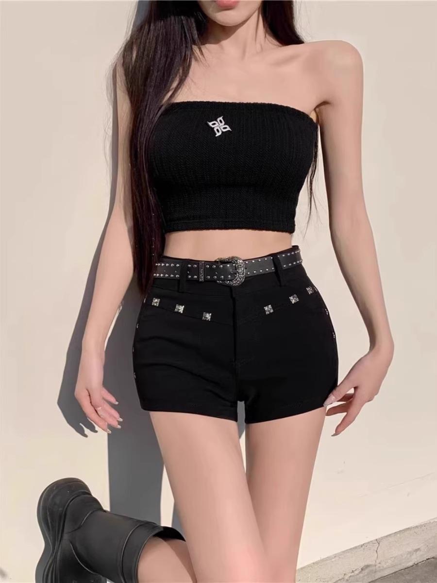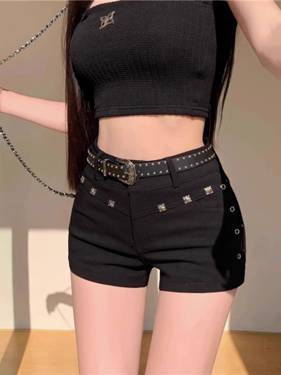Shorts Ultra de Remaches Negros de Talla Grande para Mujer 2025 Verano Nuevo Chica Caliente Cintura Baja Pantalones Rectos Slim Hot Pants
