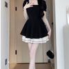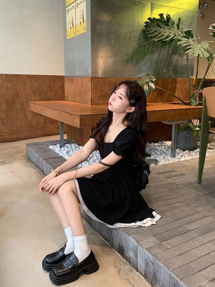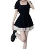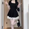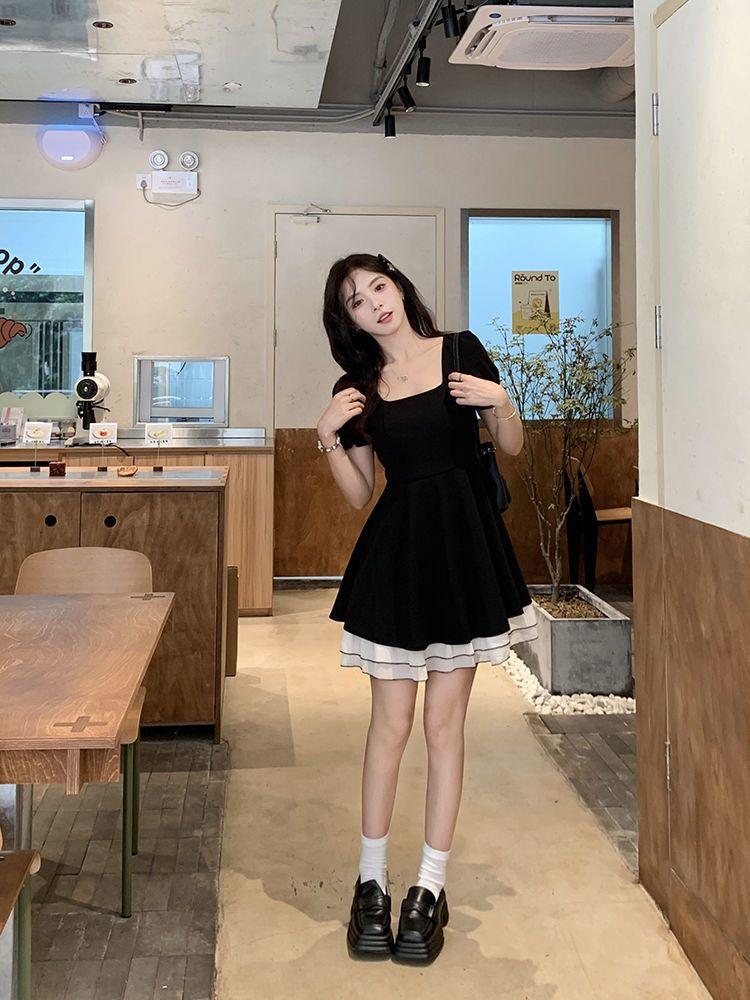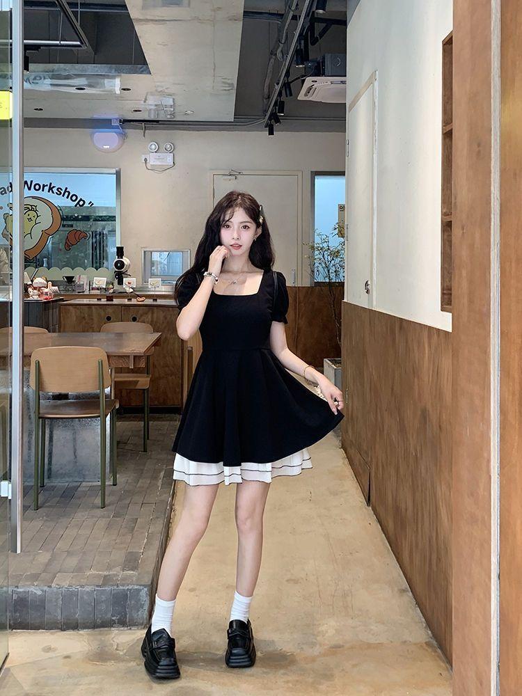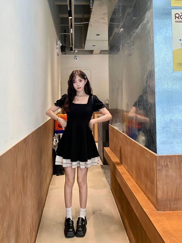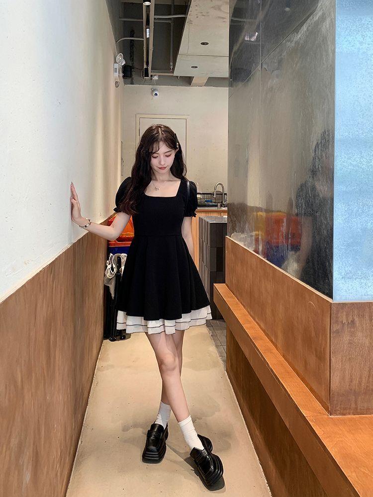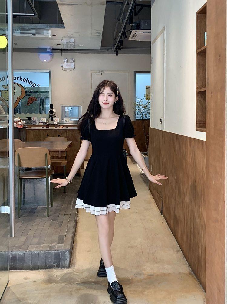 Vestido Negro Corto de Manga Corta Estilo Hepburn Francés para Mujer Verano Nuevo Cuello Cuadrado Cintura Pequeña Falda Empalmada en Color Contrastante