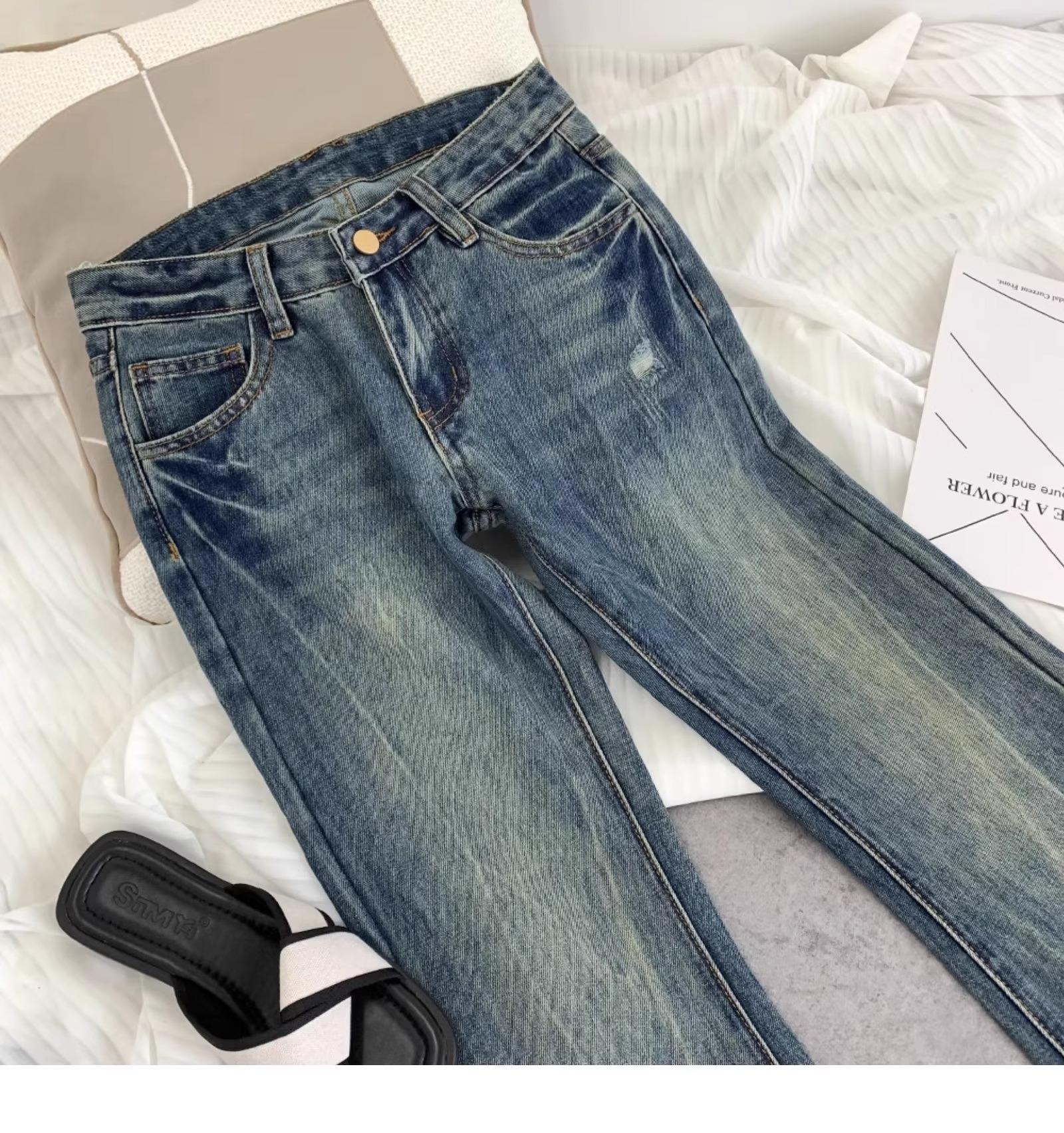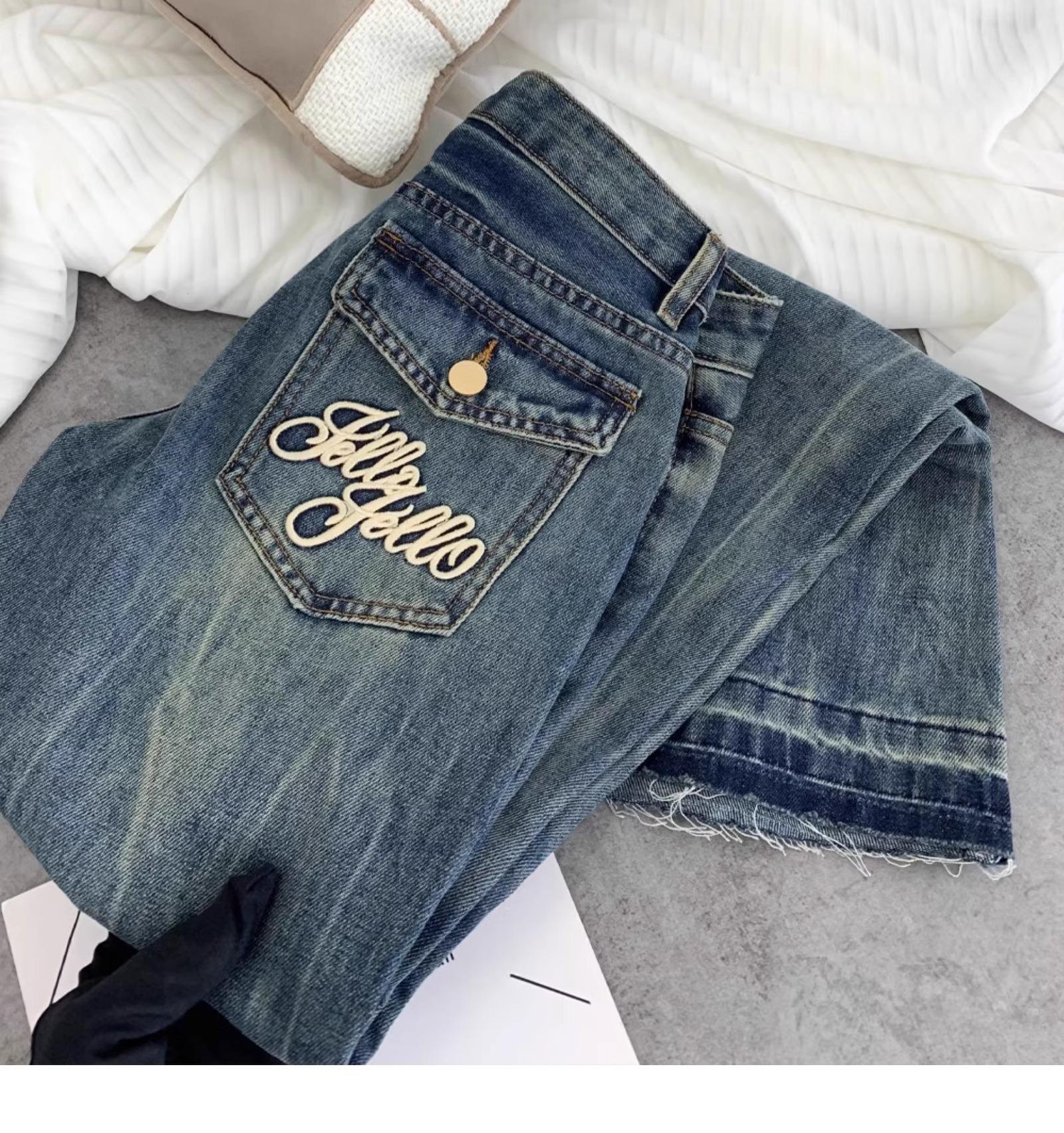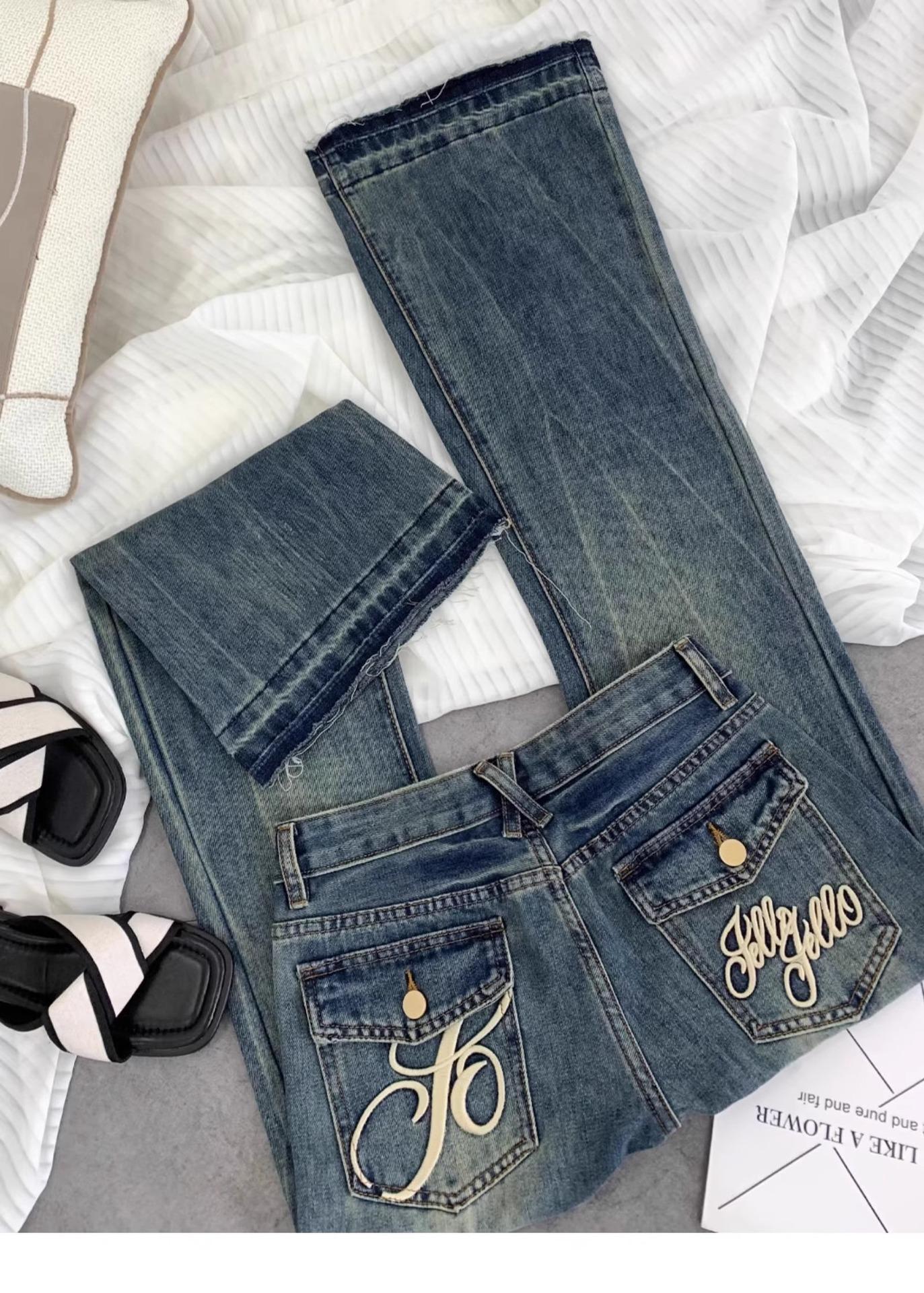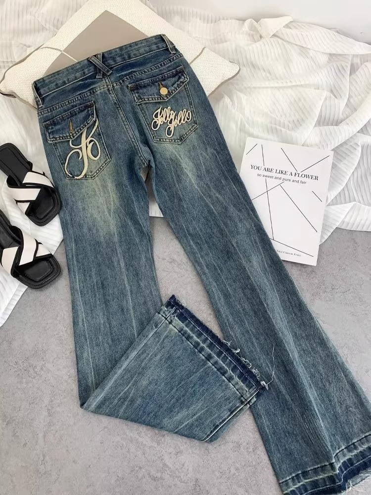 Jeans Retro de Cintura Alta Estilo Americano para Mujer Bordados a la Moda Antigua Combinables Nuevos de Corte Slim Adelgazantes de Trompeta