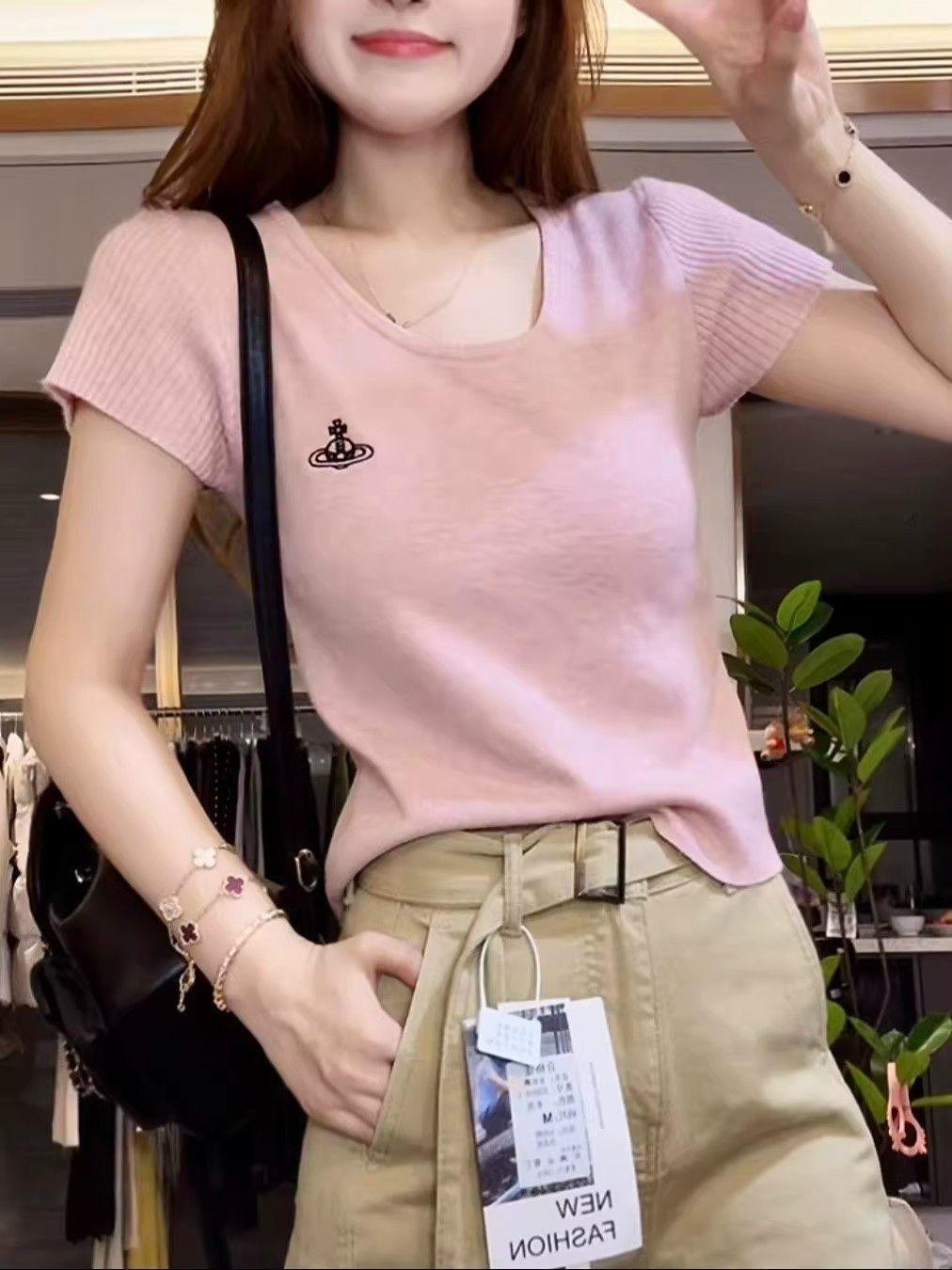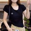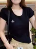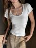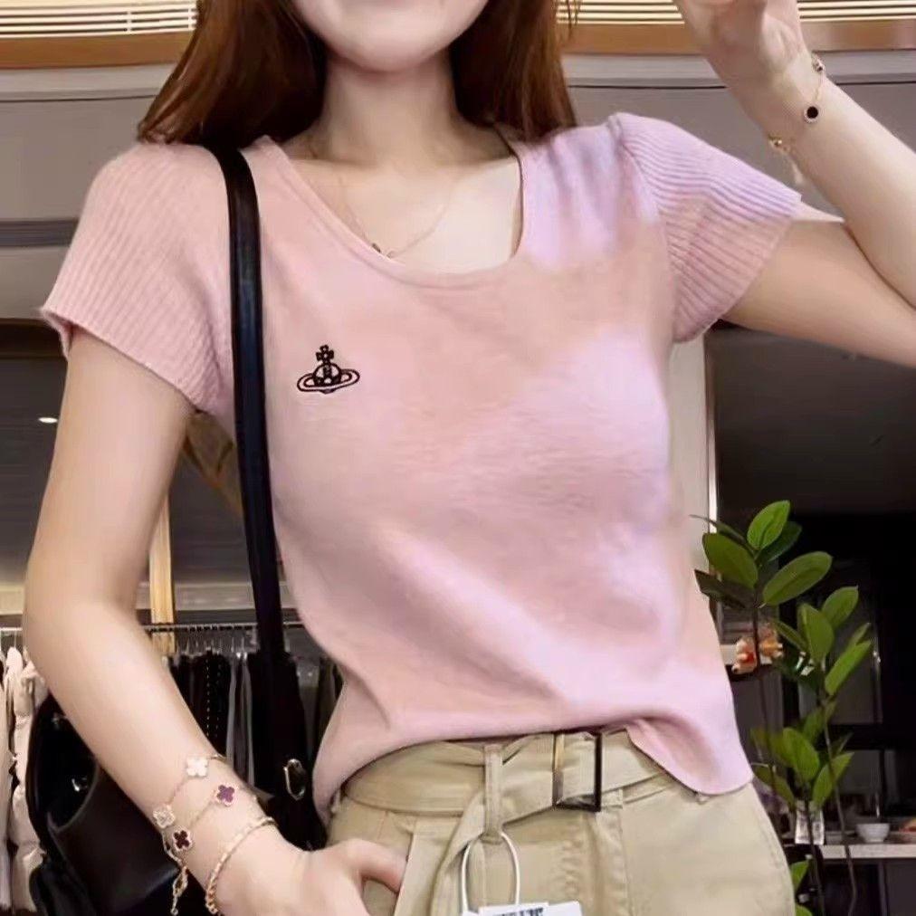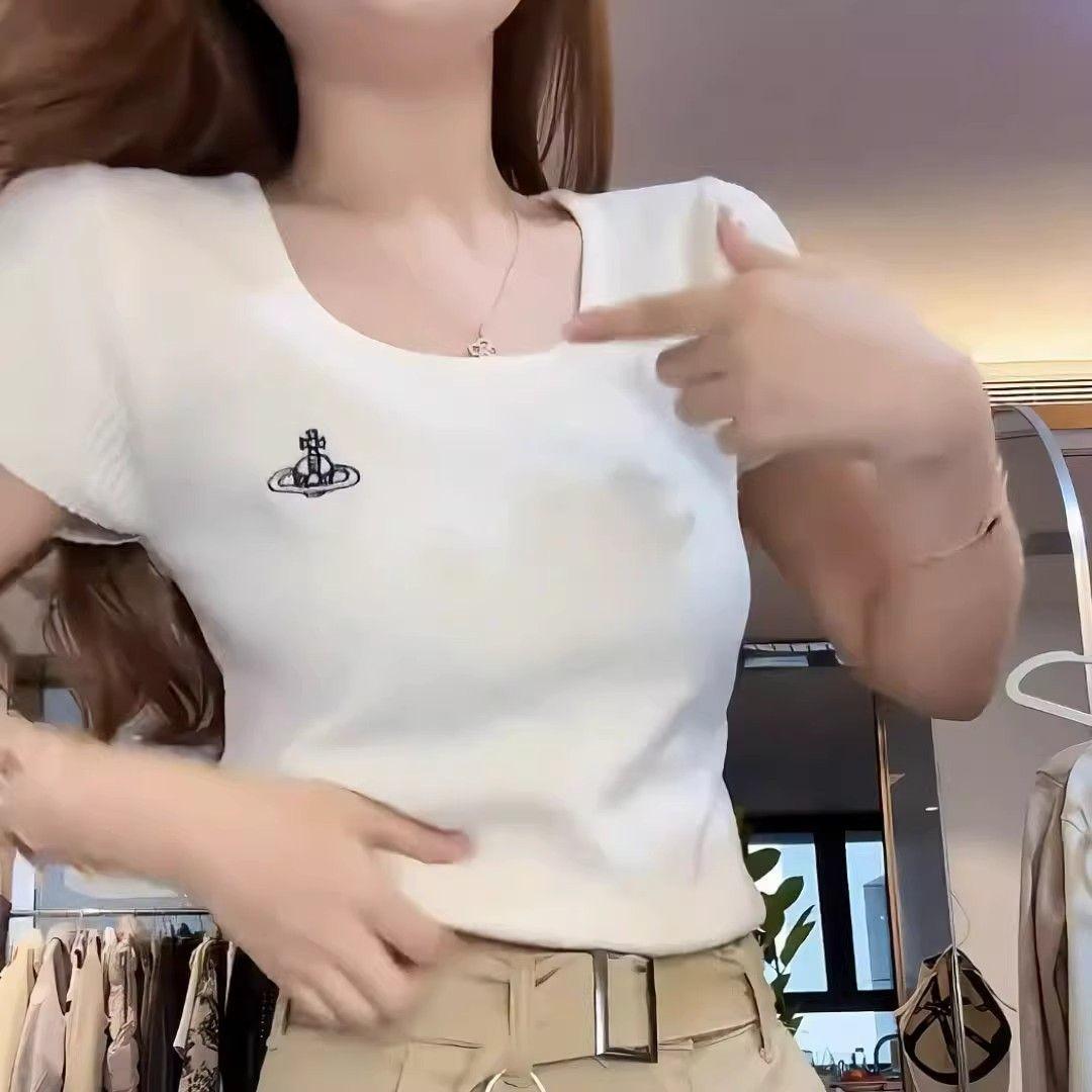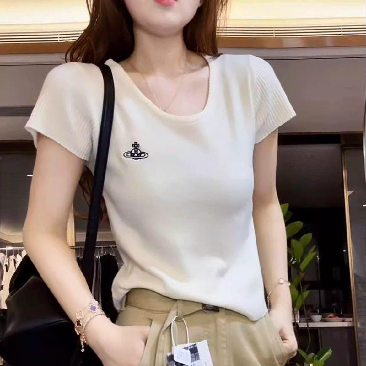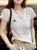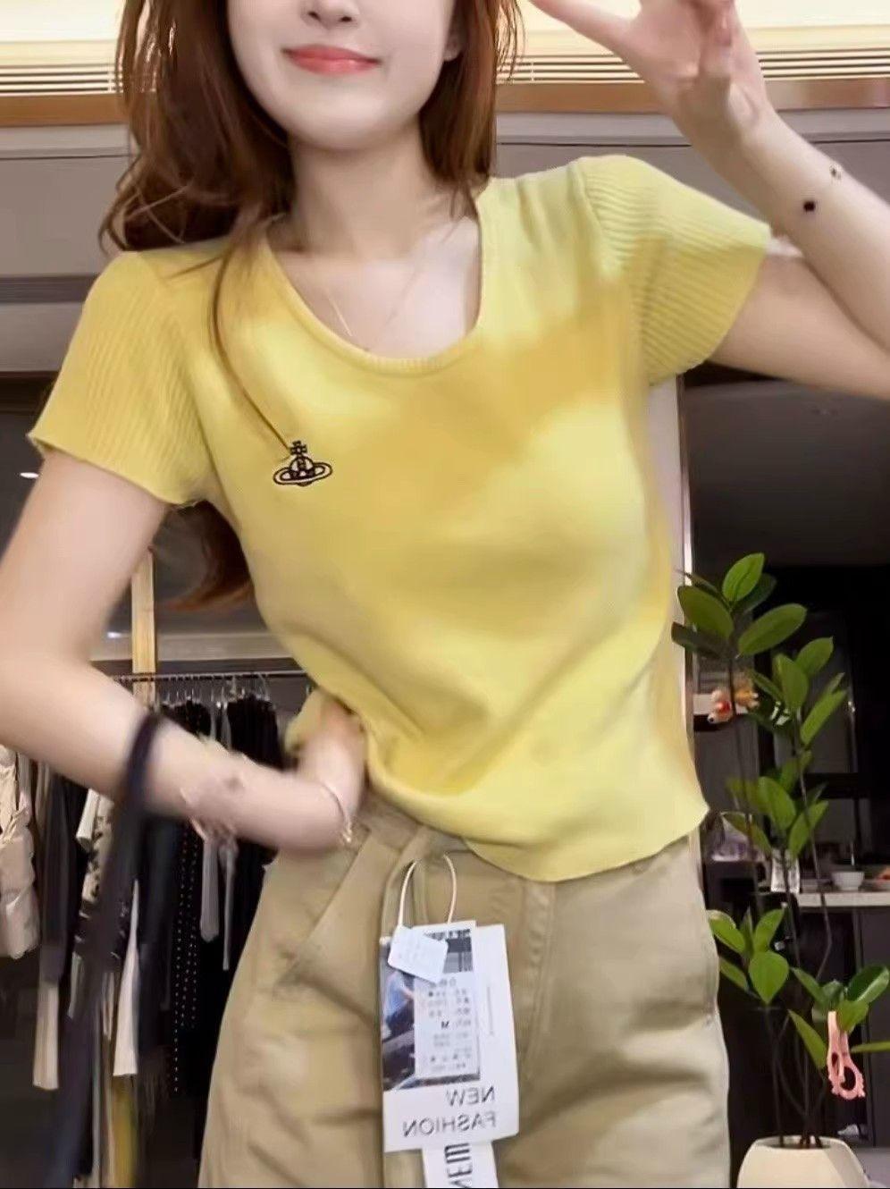 Playera de Verano para Mujer de Punto de Seda Helada Petite, Amarilla Slim-Fit Adelgazante Bordada de Hombro Regular con Torcido de Manga Corta y Cuello Redondo