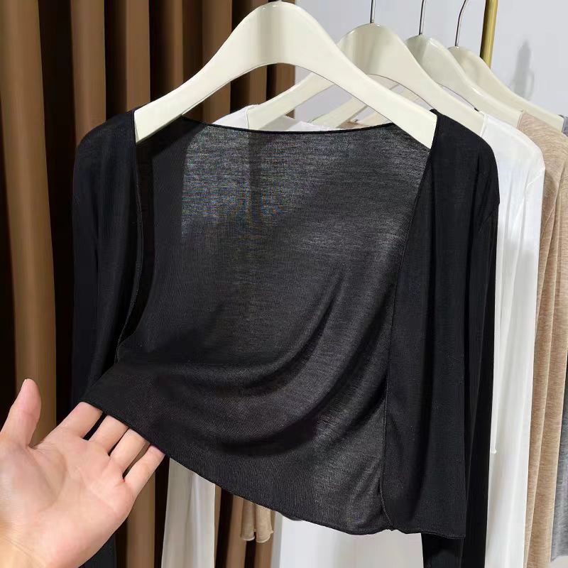 Cárdigan blanco ligero con protección solar para mujer combinado con un vestido lencero, chal y elegante capa de manga larga